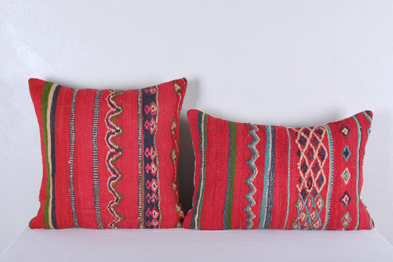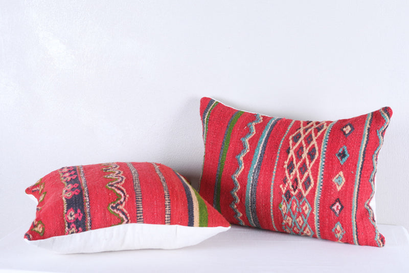 Introduce a touch of Moroccan charm into your home with our set of 2 Red Moroccan pillows. Expertly handwoven and stuffed for added comfort, these 15.7 x 22.8 INCHES pillows are an eye-catching addition to any space. Embrace the unique design and quality of kilim rugs at an affordable price.