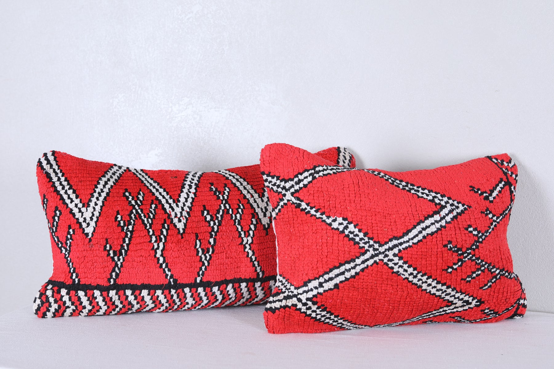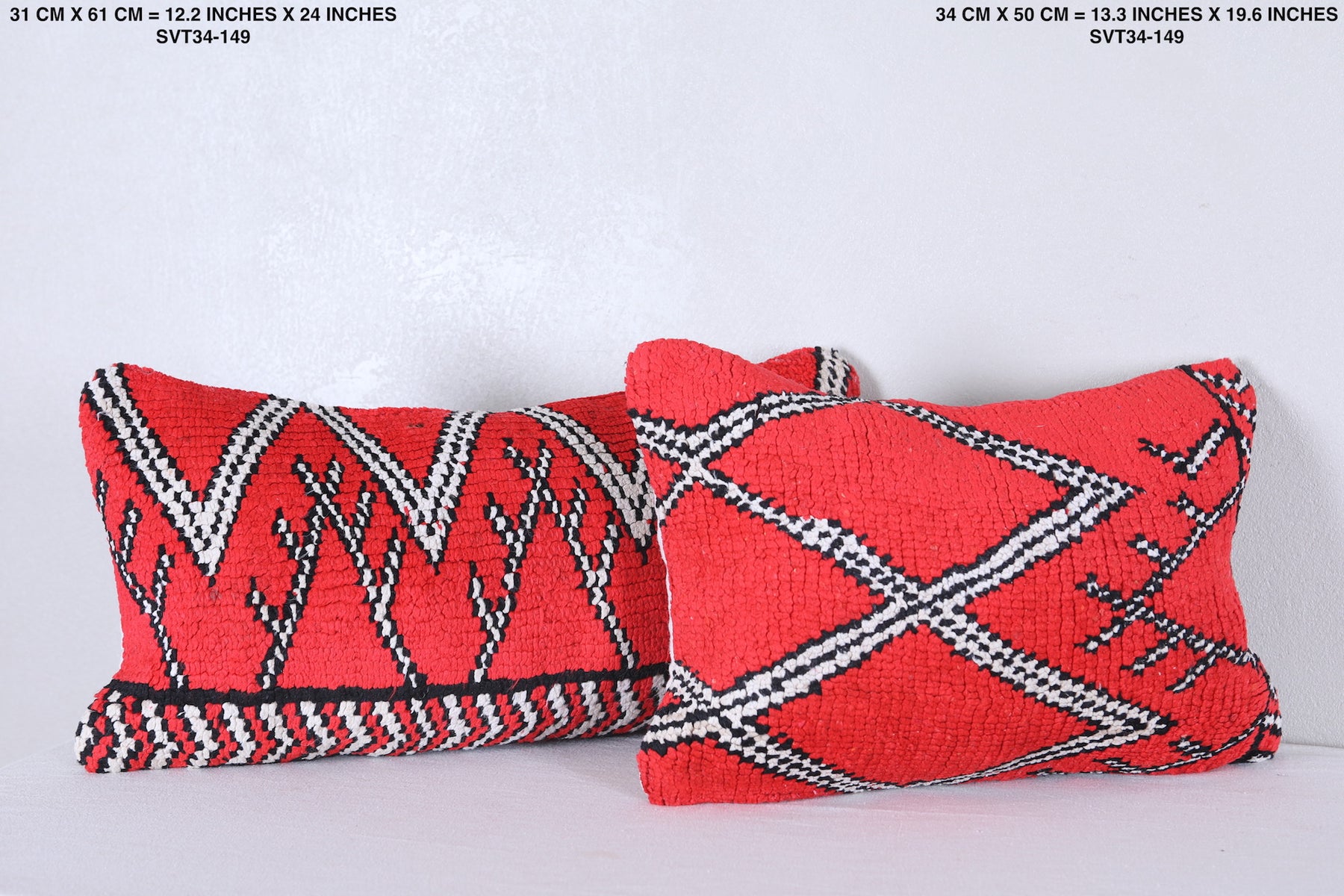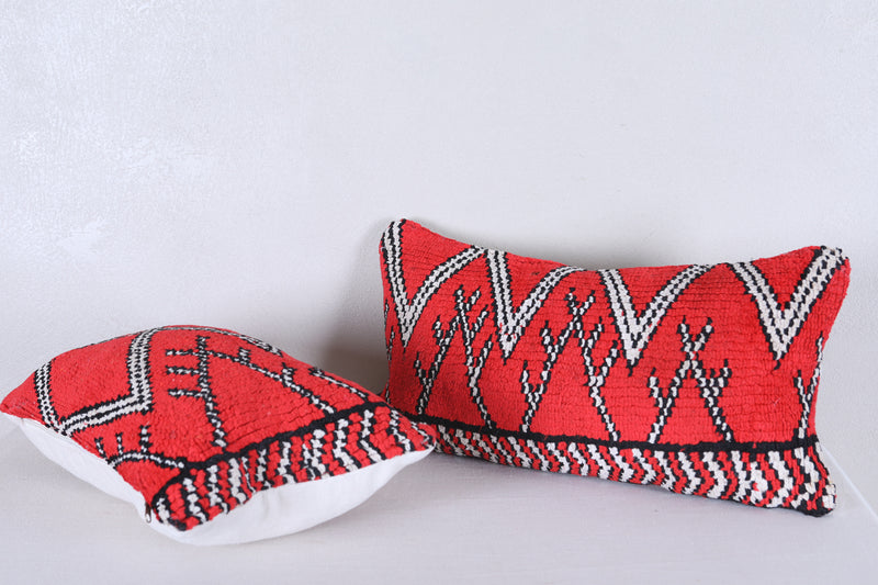Enhance your home decor with this set of 2 beautifully crafted Handmade Vintage Red Moroccan Pillows. Expertly filled and adorned with unique rug details, these decorative pillows bring a touch of Morocco to any room. Each piece is one of a kind and adds a stylish and cozy element to your space. ] PILLOW 1 : 31 CM X 61 CM = 12.2 INCHES X 24 INCHES