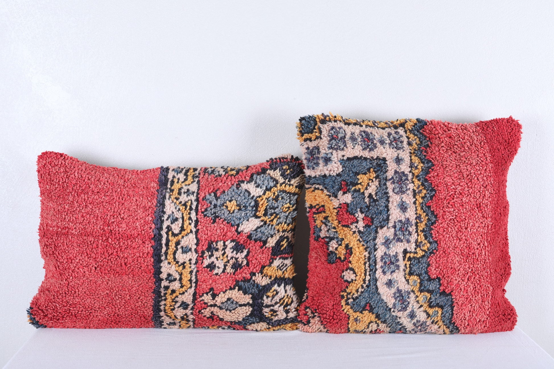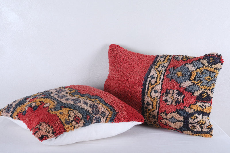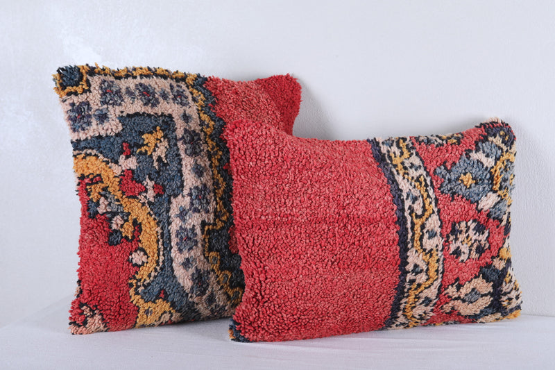 These two handwoven Moroccan rug pillows are sure to make a statement in any room. Each pillow is carefully crafted with intricate detailing and an eye-catching design. Perfect for adding a bohemian touch to your home.