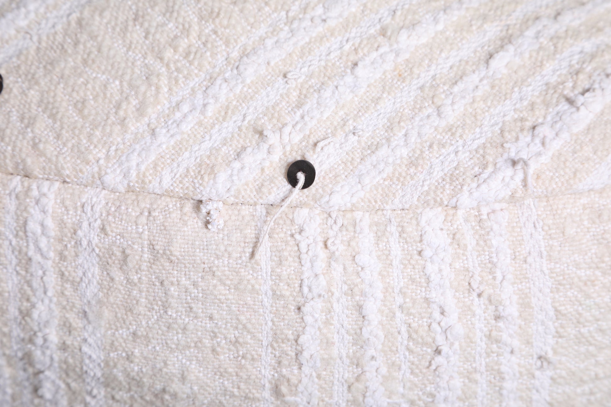 Add softness and artisanal charm to your decor with this pair of handwoven Moroccan round poufs. Made from vintage kilim fabrics, these poufs bring a calming neutral tone and subtle sparkle into any setting.