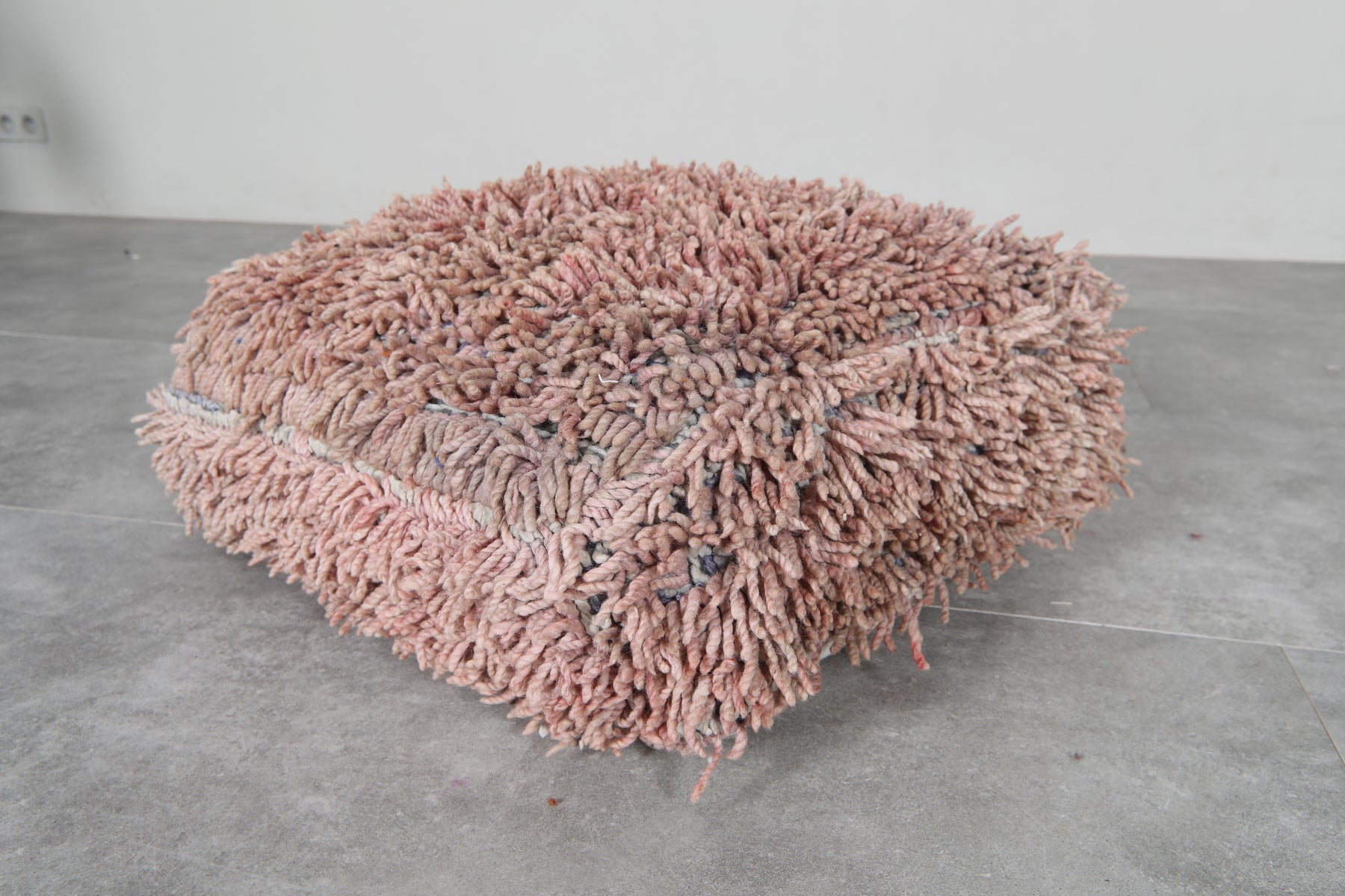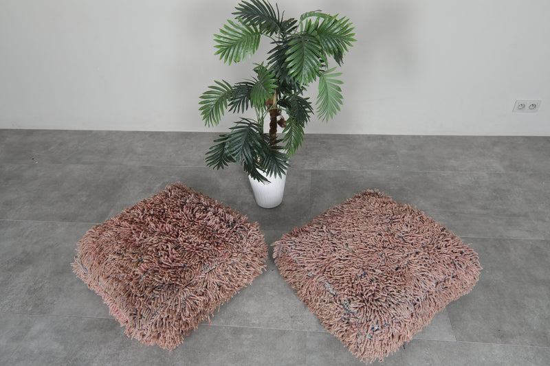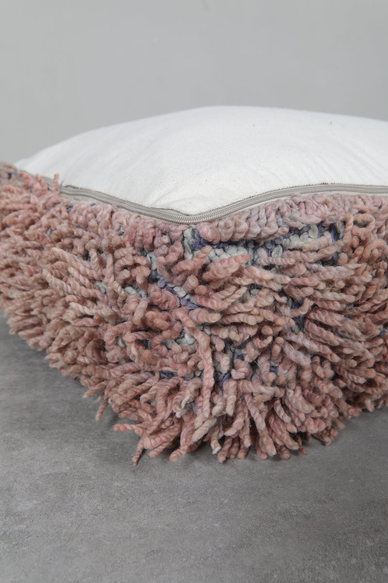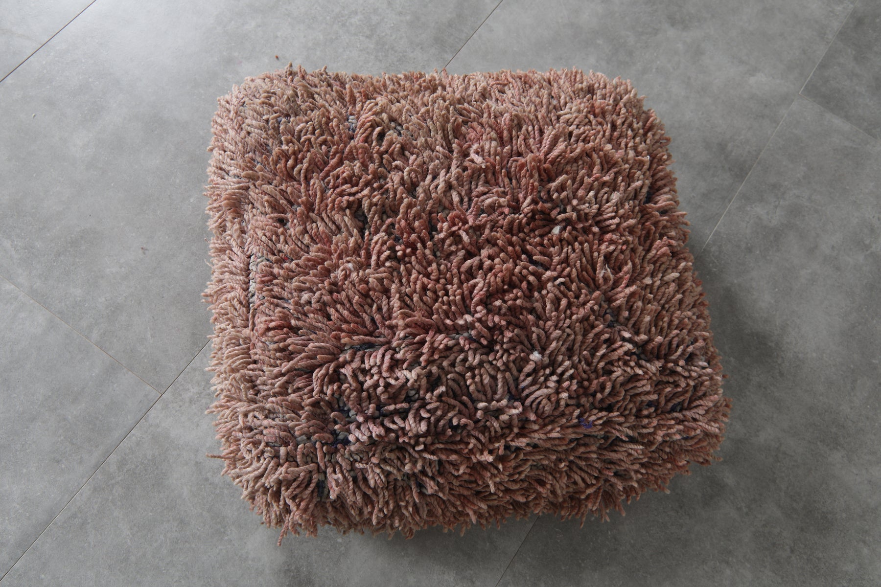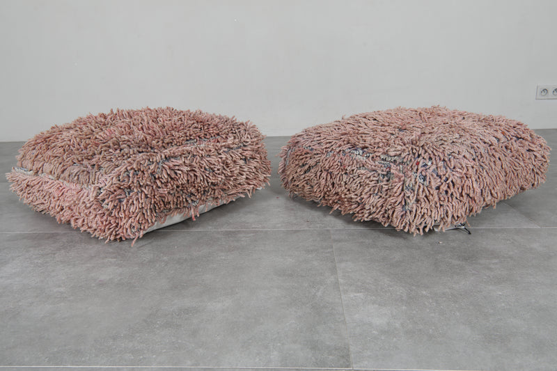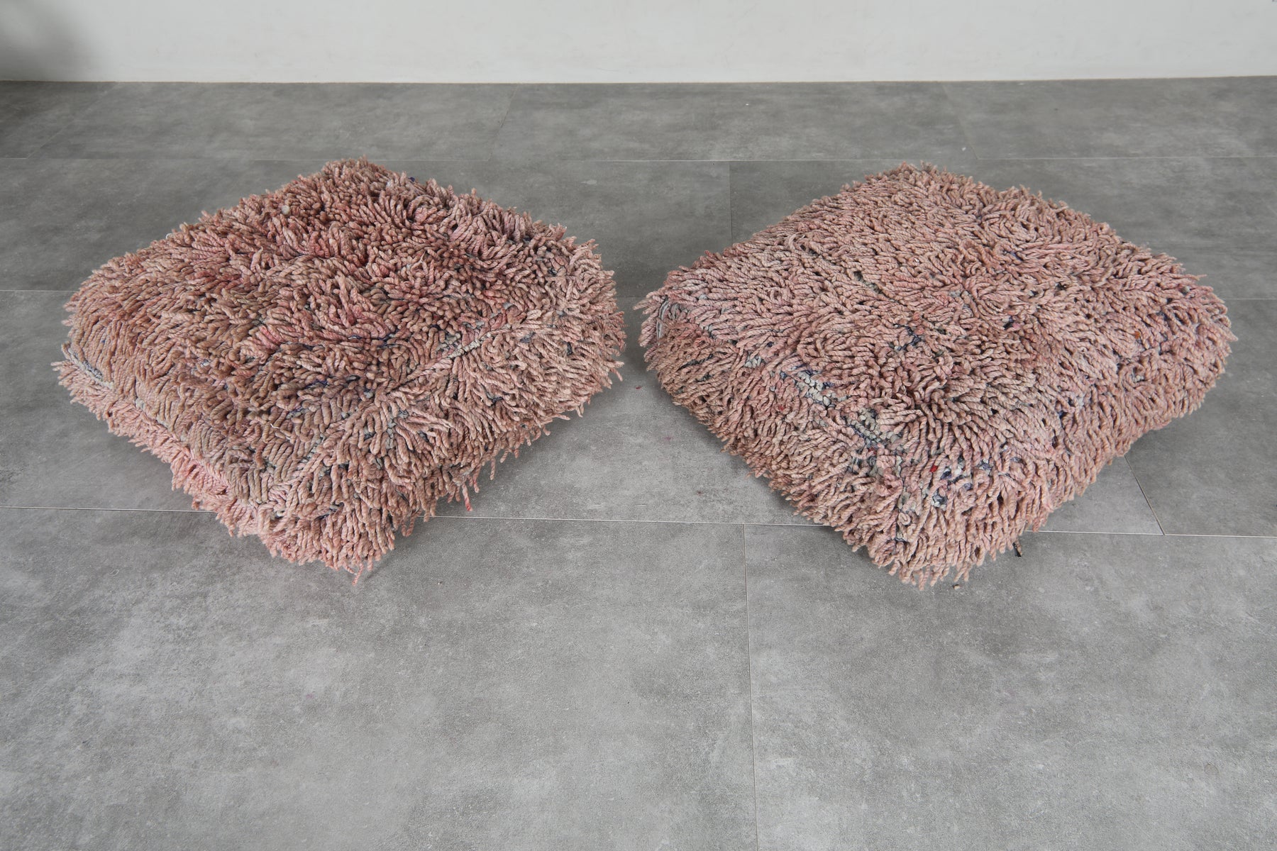 Add warmth and texture to your home with this set of two Moroccan vintage ottoman poufs, crafted from authentic handwoven rugs. These plush, shaggy poufs offer a cozy seating option or decorative accent for modern boho, eclectic, or rustic interiors. The soft, dusty rose hue with subtle multicolor undertones and long, luxurious pile brings inviting comfort and a grounded, artisanal feel to any room.
