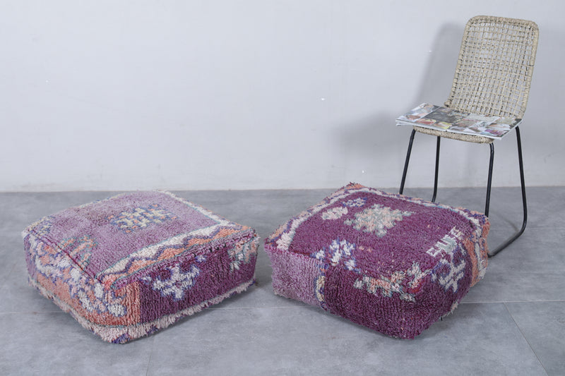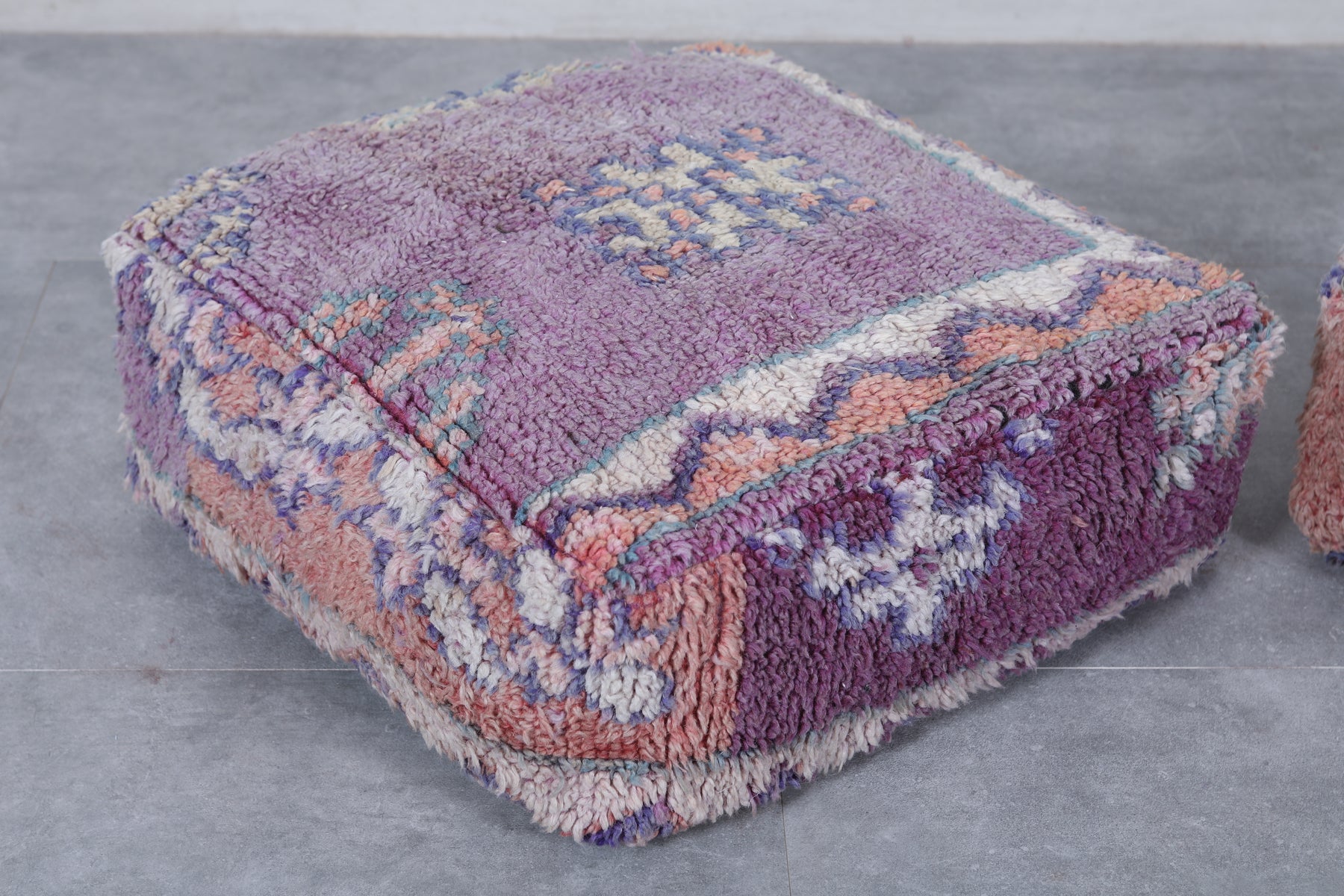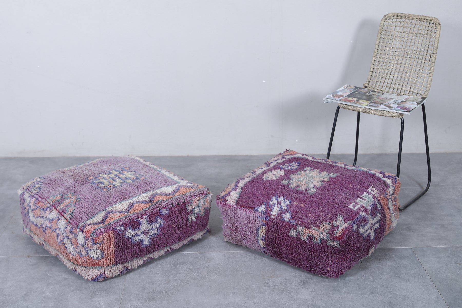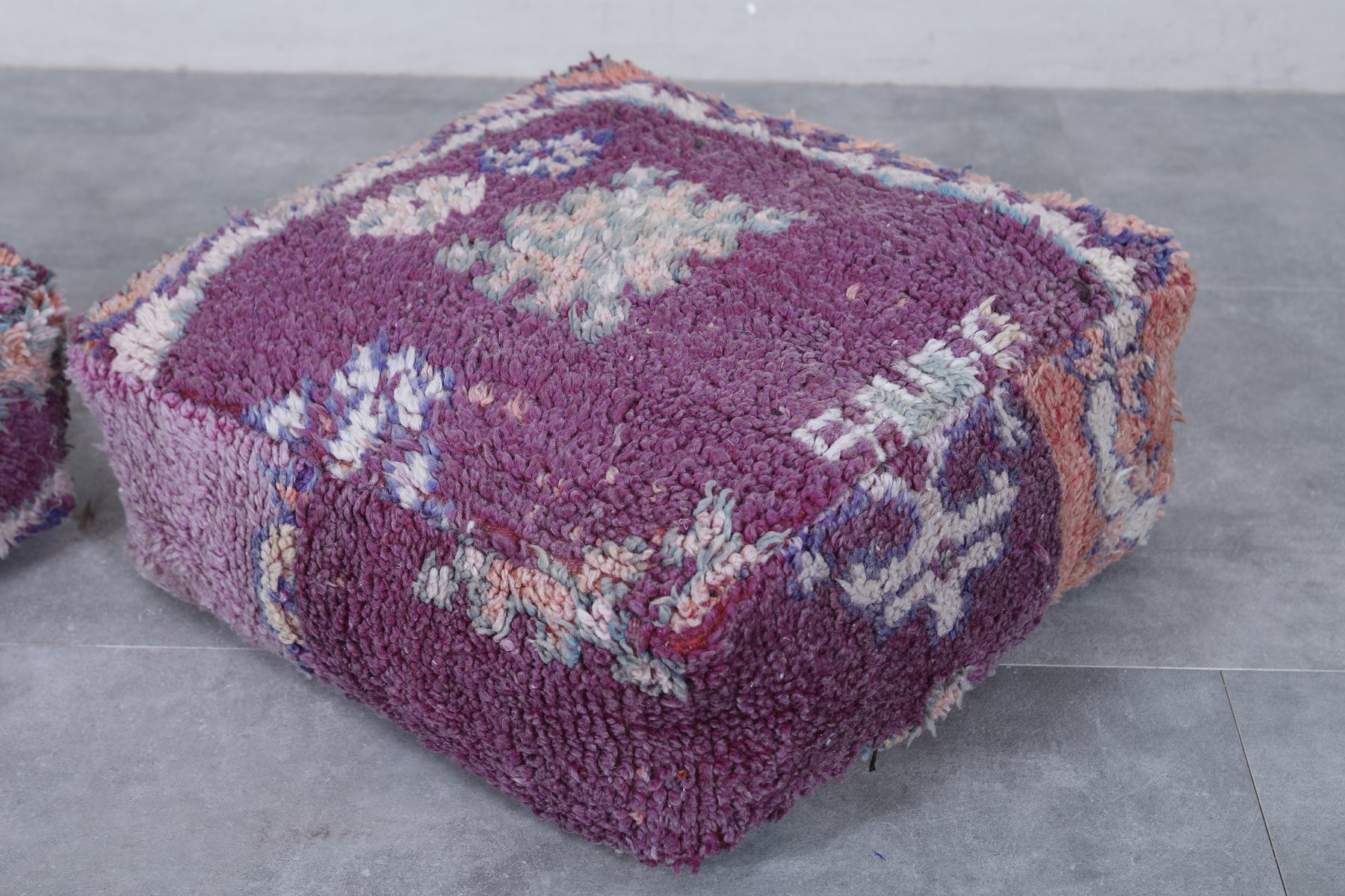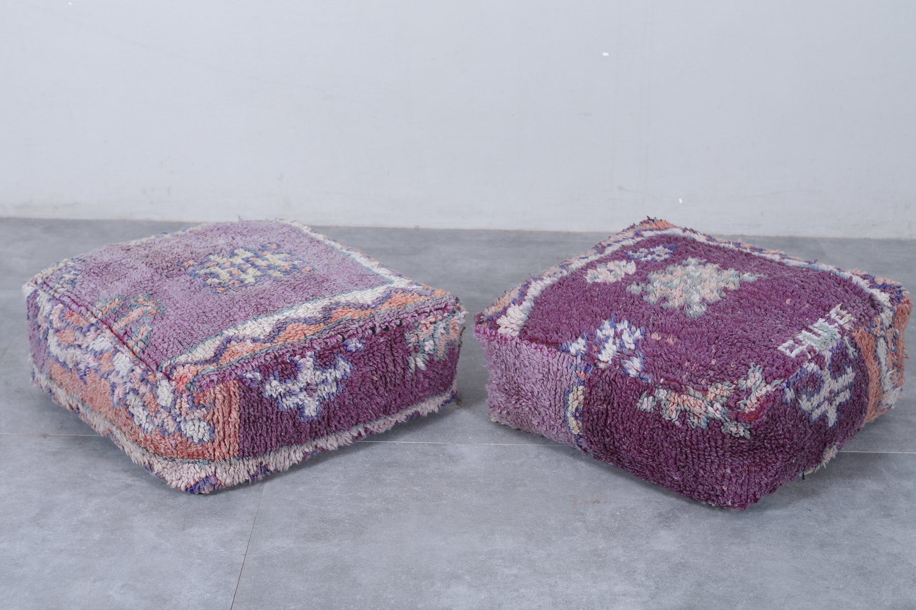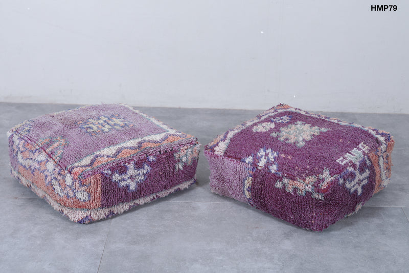 Add a burst of color and texture to your space with this set of two Moroccan vintage ottoman poufs, handcrafted from repurposed Boucherouite rugs. These one-of-a-kind floor cushions blend vivid purples, soft peach tones, and intricate tribal patterns—each piece telling its own story through bold hues and abstract Berber symbolism. Whether placed in a cozy reading nook or as extra seating in a living room, they deliver both style and comfort.