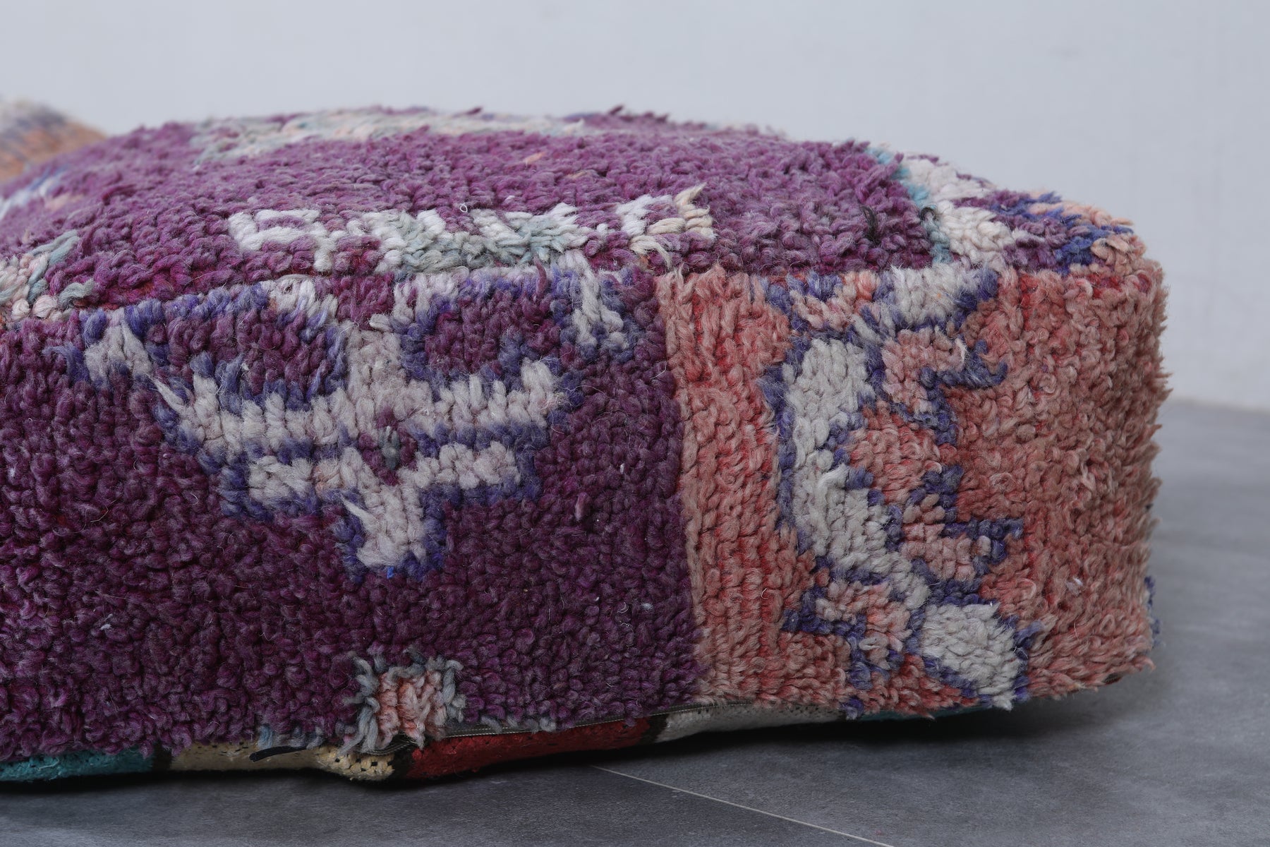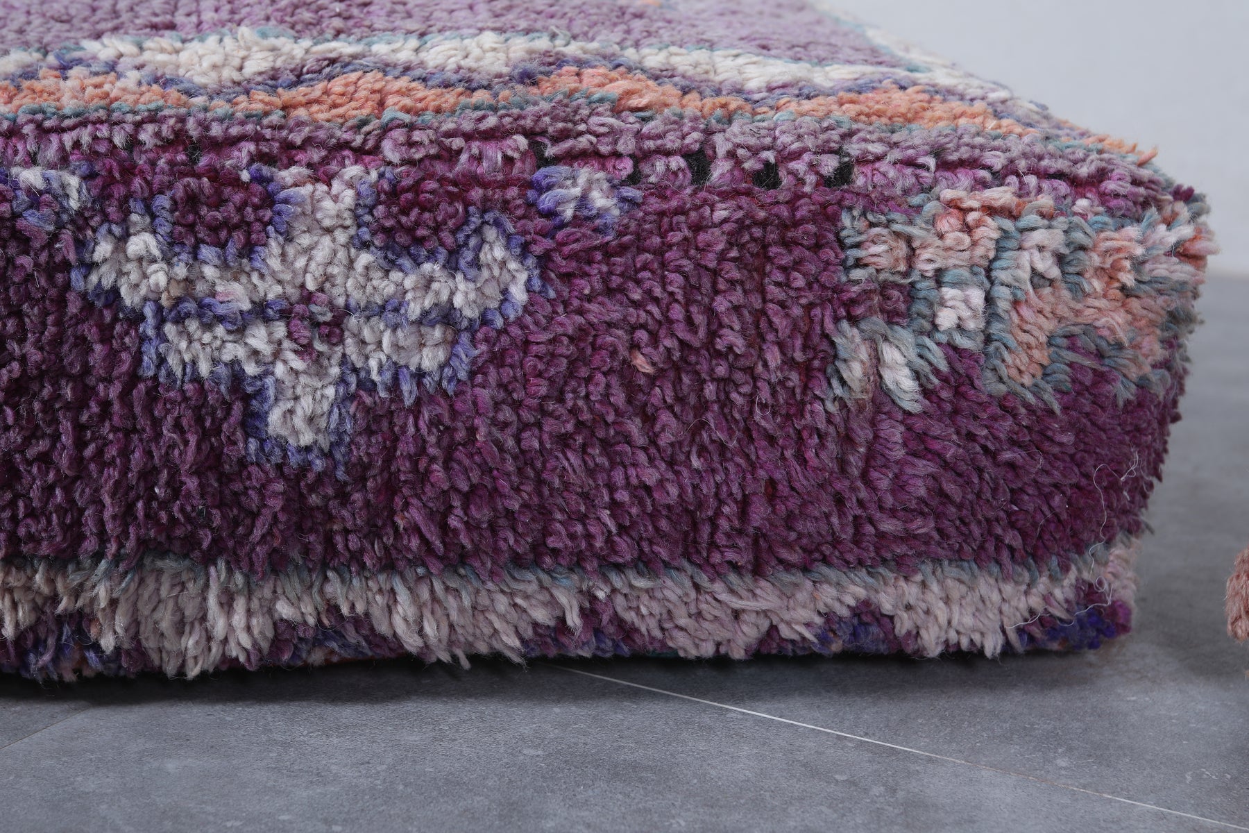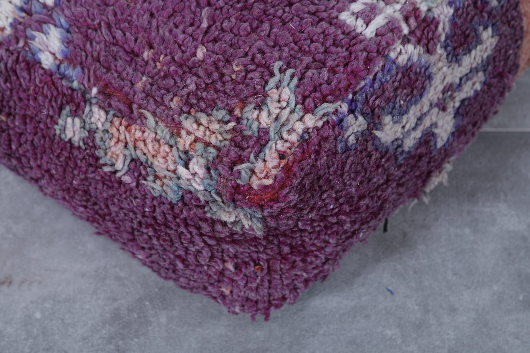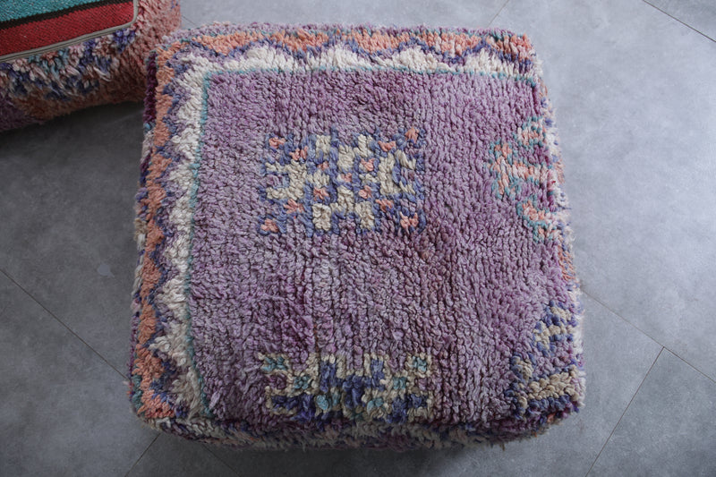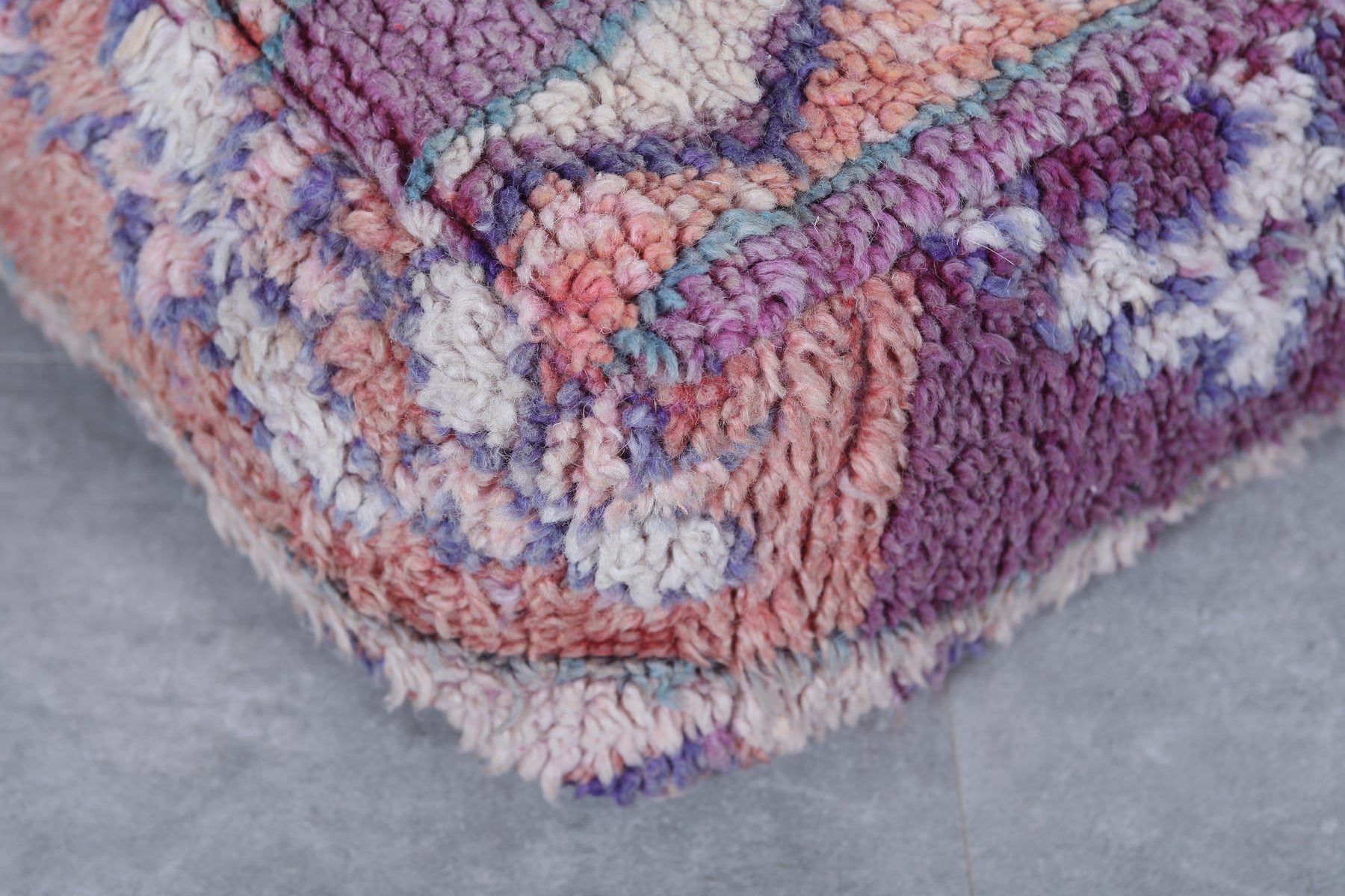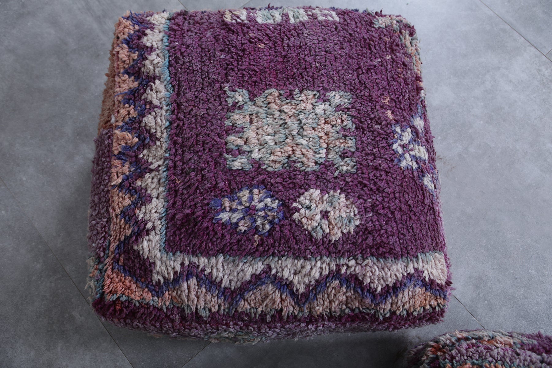 Add a burst of color and texture to your space with this set of two Moroccan vintage ottoman poufs, handcrafted from repurposed Boucherouite rugs. These one-of-a-kind floor cushions blend vivid purples, soft peach tones, and intricate tribal patterns—each piece telling its own story through bold hues and abstract Berber symbolism. Whether placed in a cozy reading nook or as extra seating in a living room, they deliver both style and comfort.