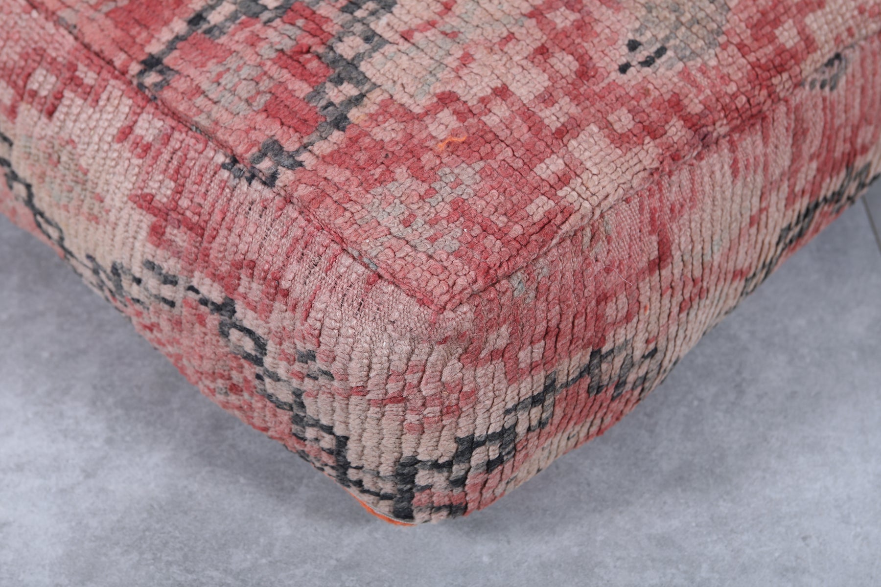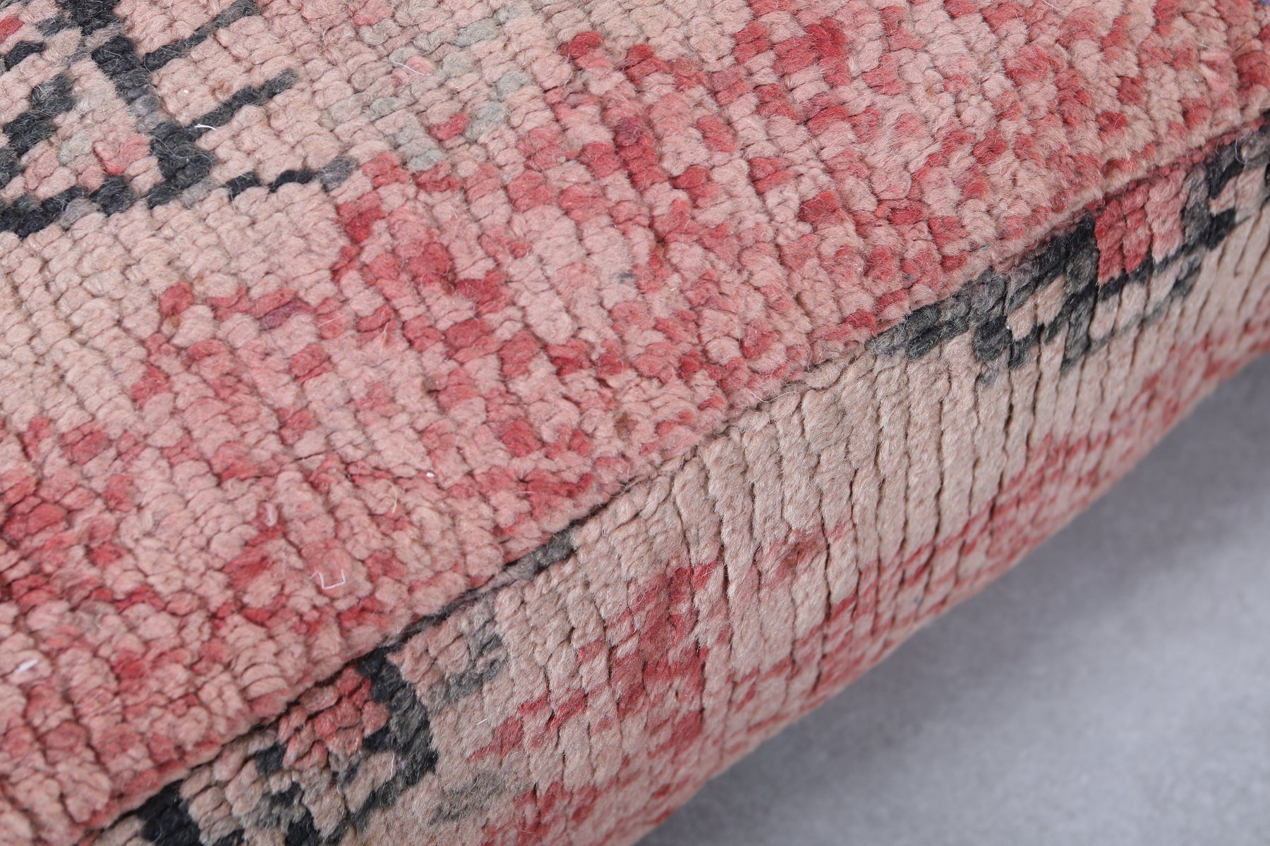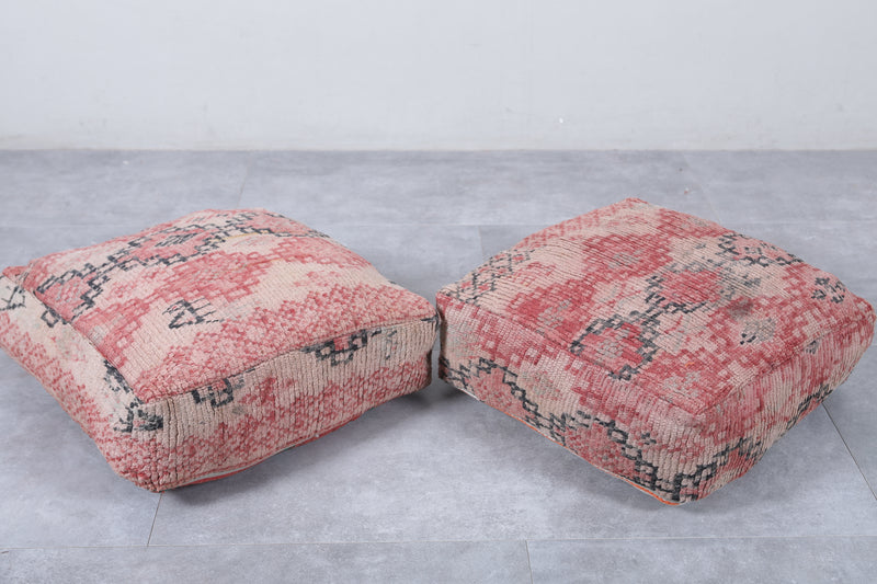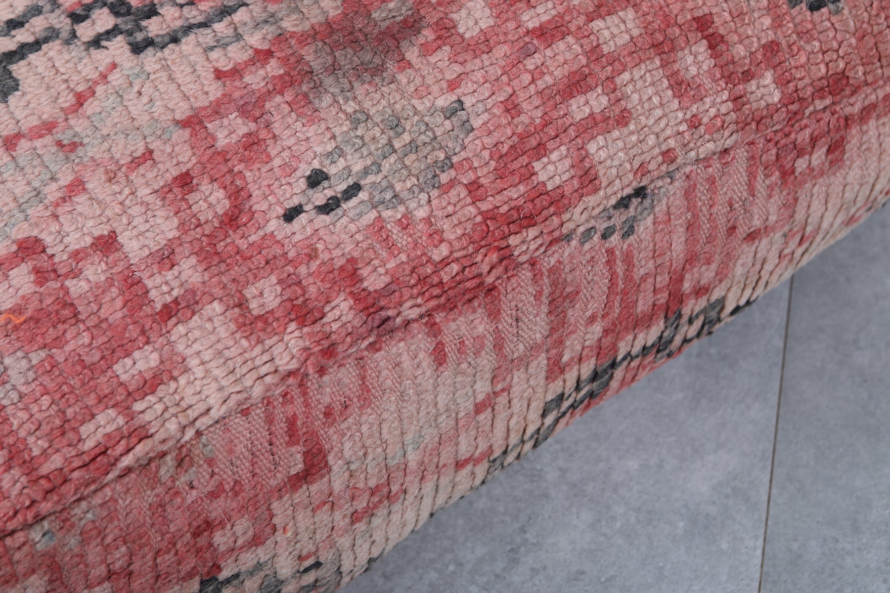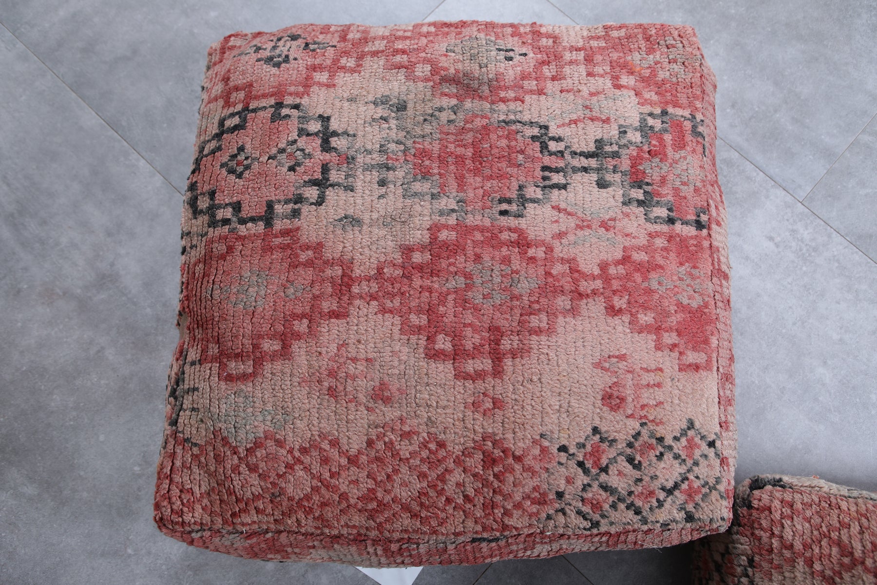 Add a warm pop of color and vintage authenticity to your home with this pair of Moroccan ottoman poufs. Each piece is repurposed from traditional Boucherouite rugs and showcases soft salmon pinks, muted reds, and charcoal-black tribal detailing. Their weathered patterns and inviting texture bring soul and softness to any boho, eclectic, or minimalist space.