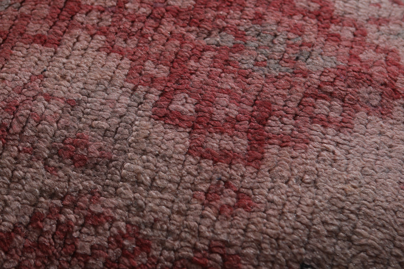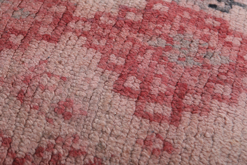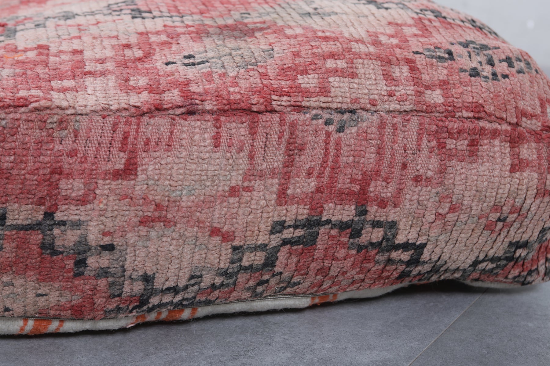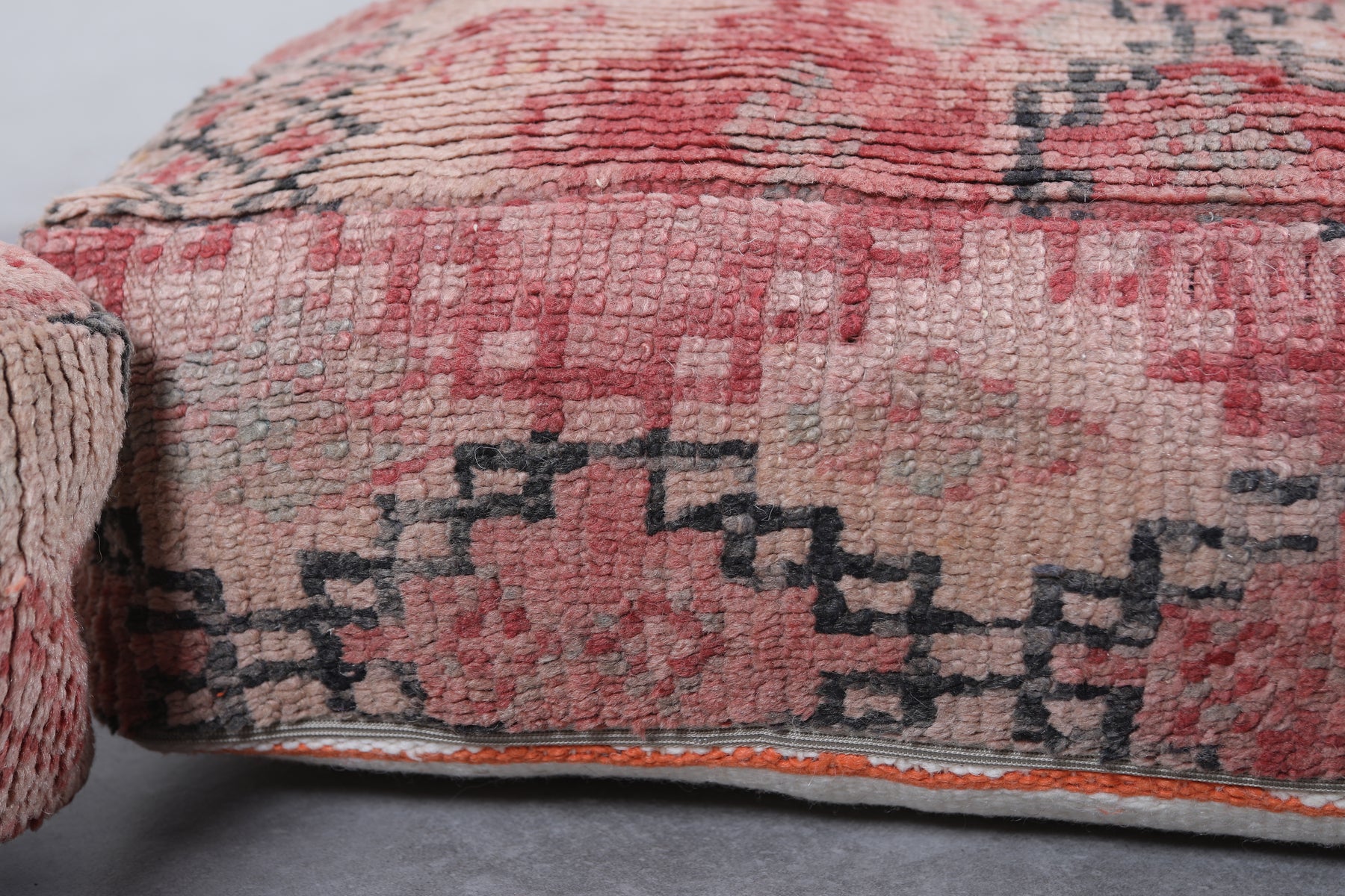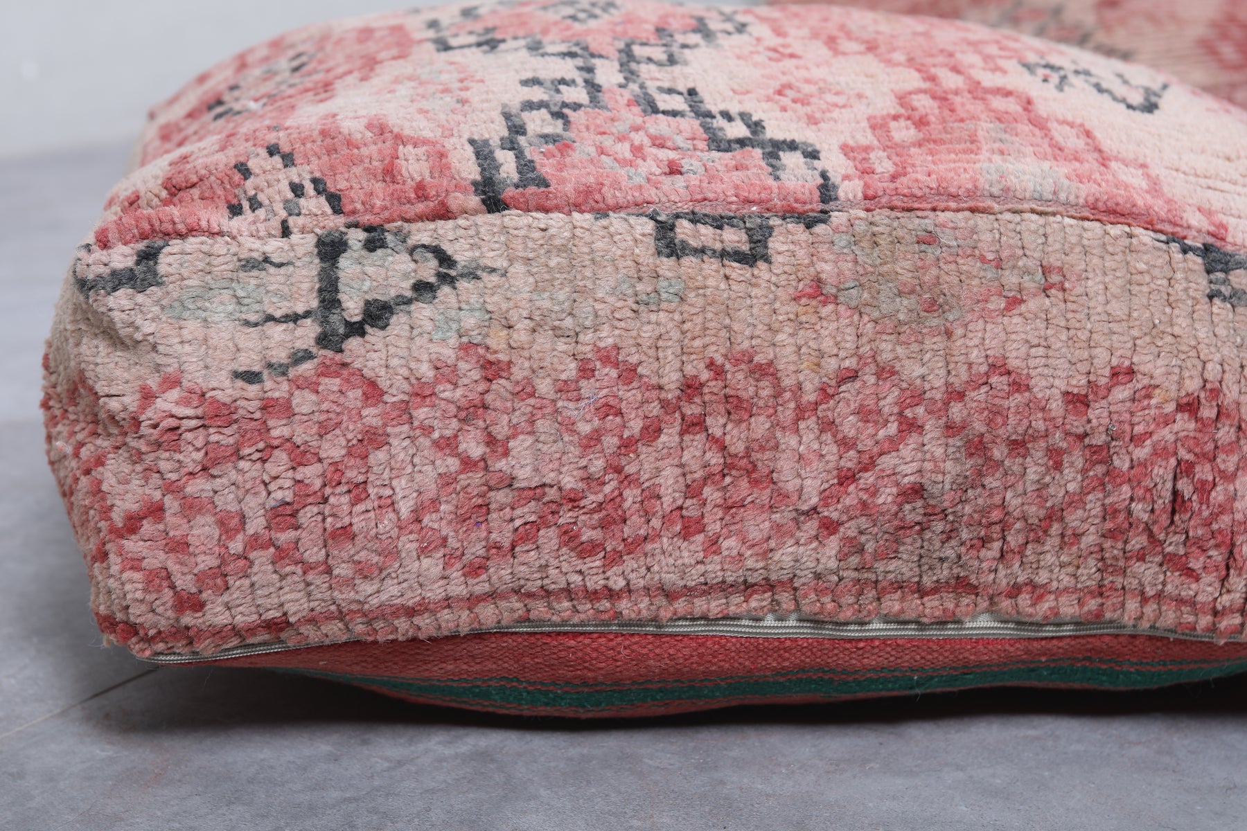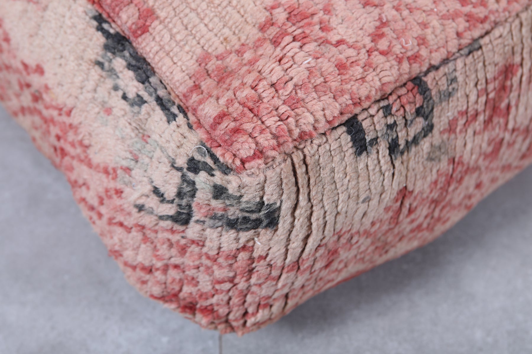 Add a warm pop of color and vintage authenticity to your home with this pair of Moroccan ottoman poufs. Each piece is repurposed from traditional Boucherouite rugs and showcases soft salmon pinks, muted reds, and charcoal-black tribal detailing. Their weathered patterns and inviting texture bring soul and softness to any boho, eclectic, or minimalist space.