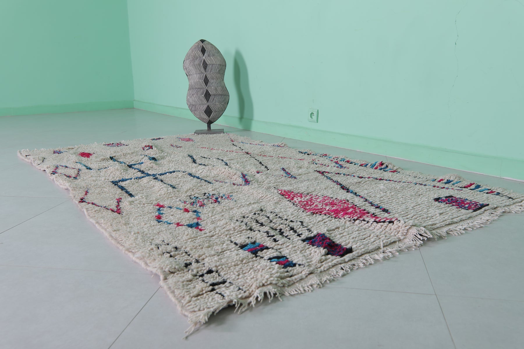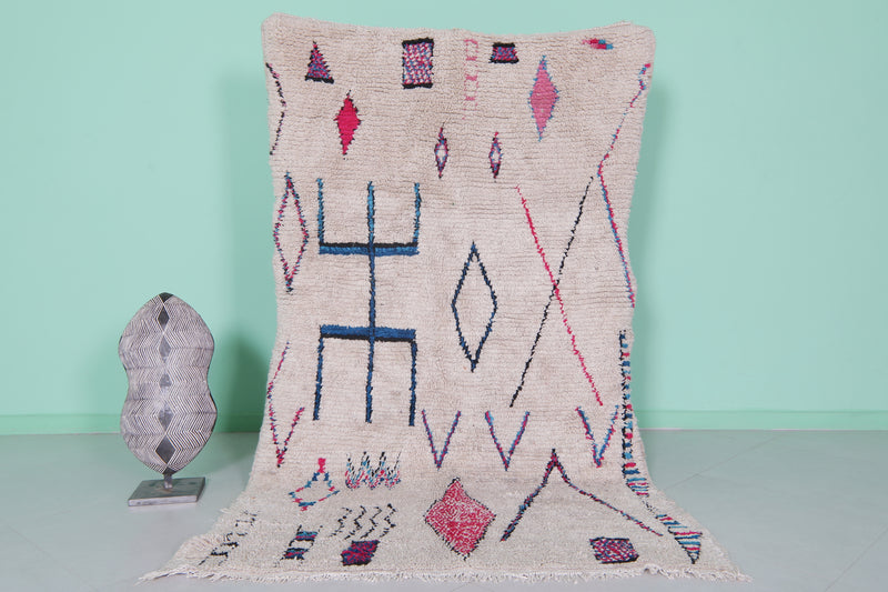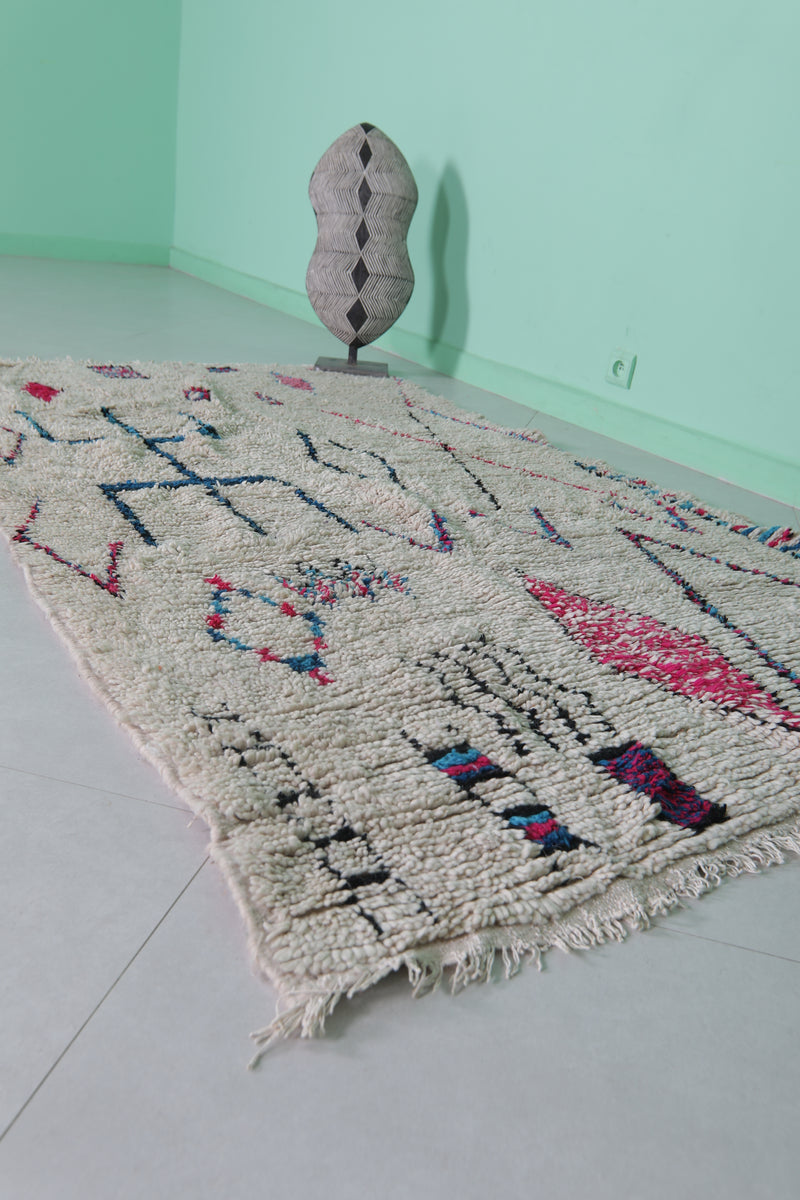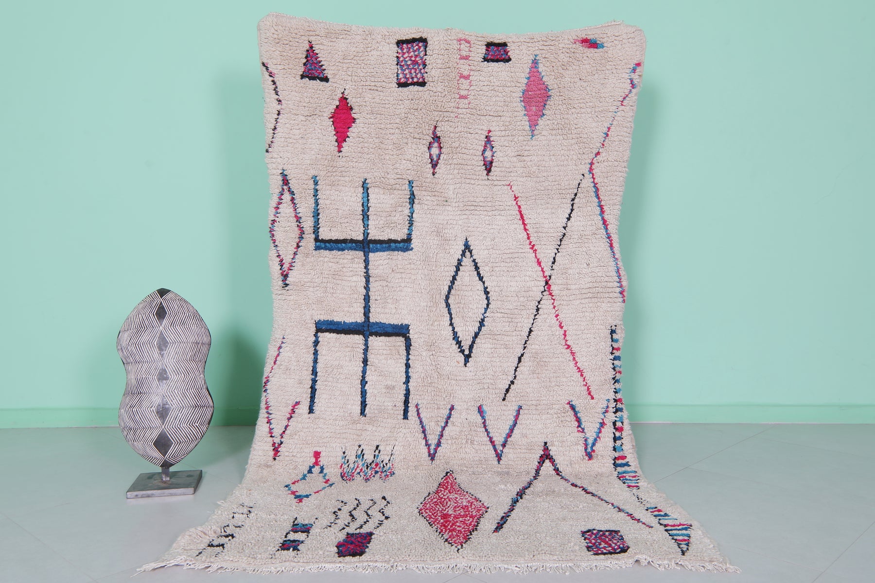 Add a touch of Moroccan artistry to your space with this beautiful vintage Berber rug, measuring 4.3 x 7.2 ft. Handwoven by skilled artisans, it features a captivating blend of geometric patterns in vibrant pink and blue hues on a neutral background. This rug exudes warmth and character, making it the perfect centerpiece for your living room, bedroom, or office. Its durable construction and timeless design ensure it's as practical as it is beautiful. Elevate your décor with this stunning piece of Berber heritage.