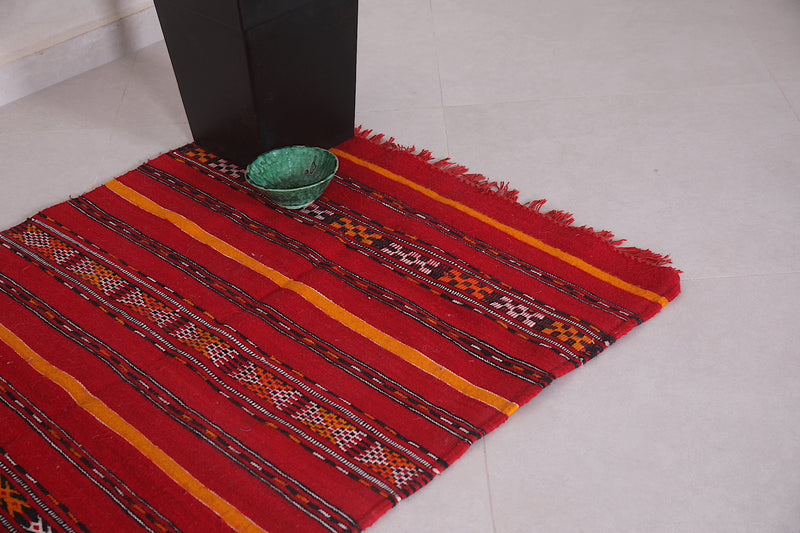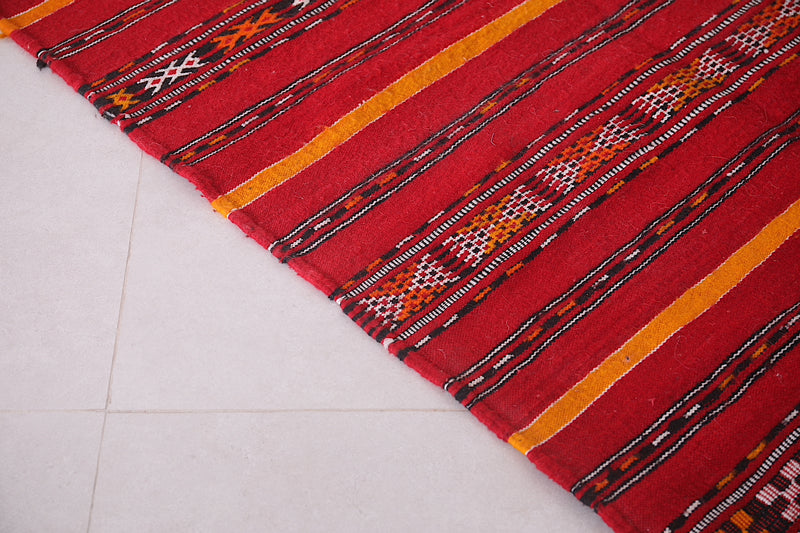 This 2.9 x 5 feet handwoven Berber Kilim rug energizes any space with its vivid palette of red, orange, and yellow tones. Traditional geometric patterns and horizontal stripes lend this piece a bold, artisanal charm—ideal for livening up entryways, bedrooms, or creative living areas.