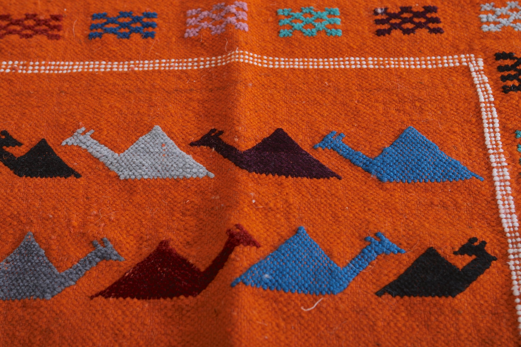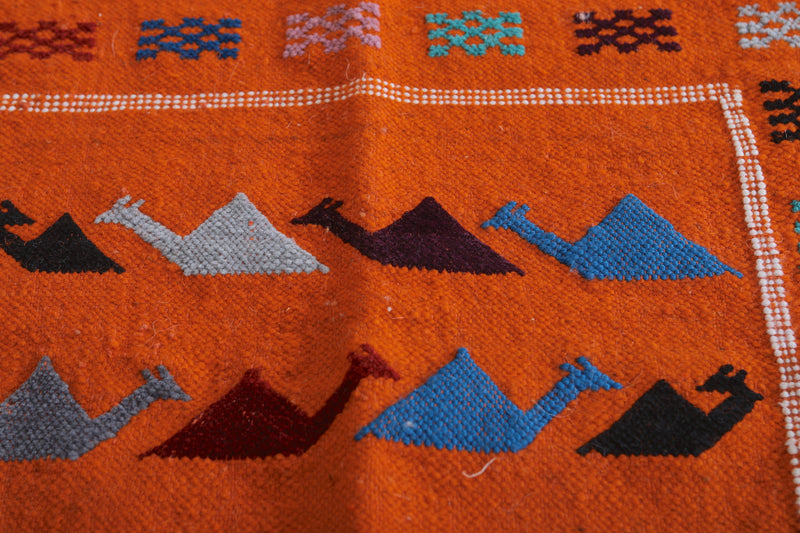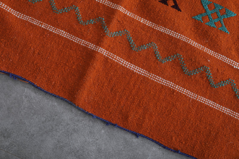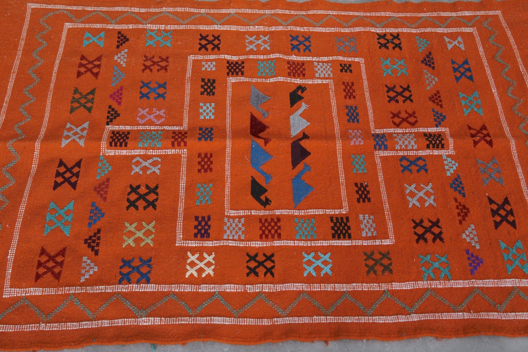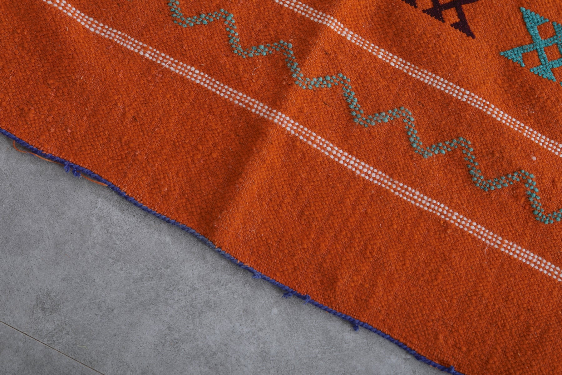This 3 x 4.9 feet Vibrant Handwoven Kilim Rug features a bold orange base adorned with intricate geometric patterns in lively hues of blue, black, and red. A true fusion of tradition and contemporary design, this rug is perfect for adding warmth and character to any space.