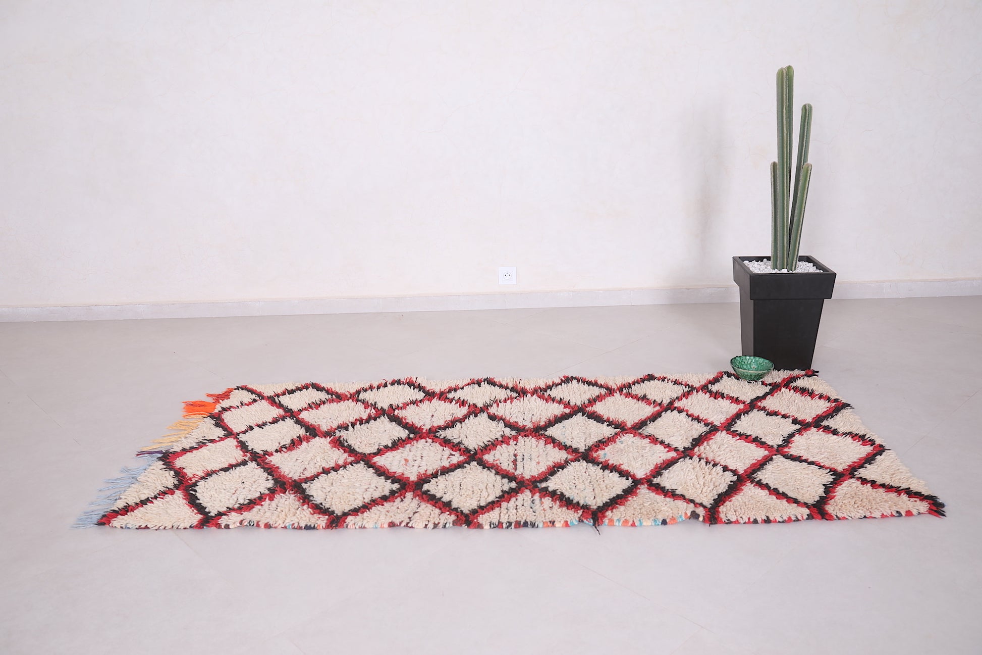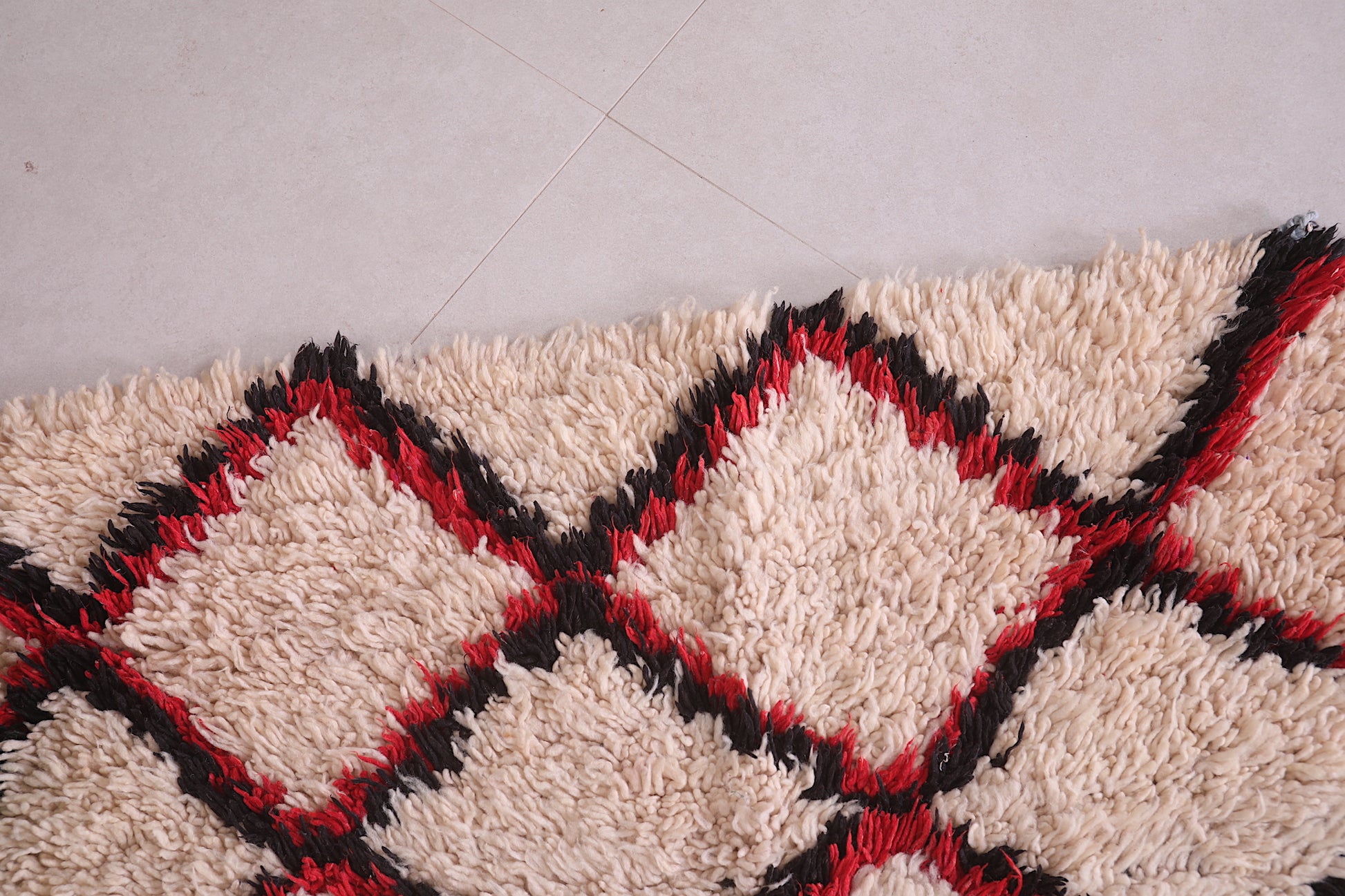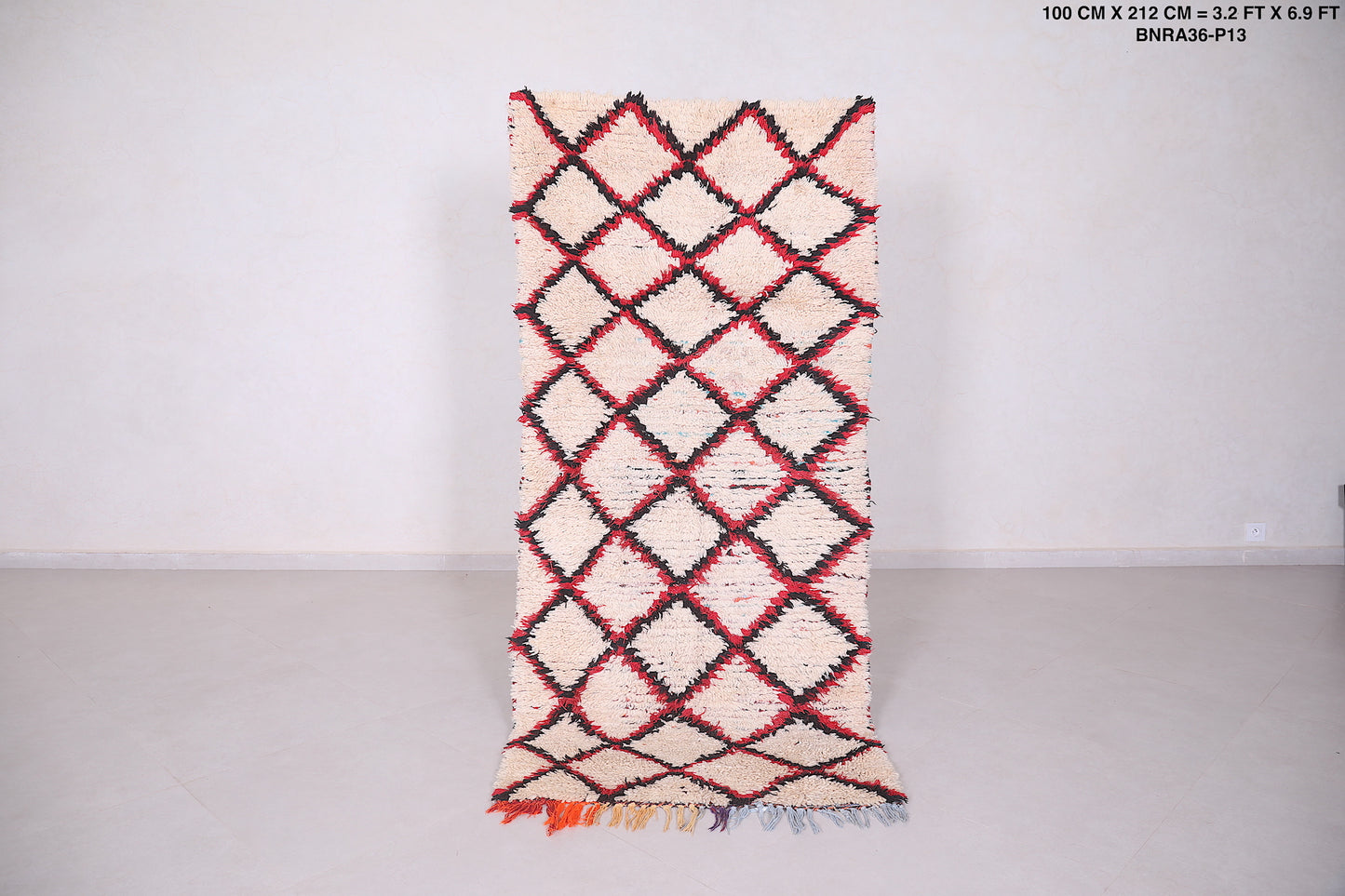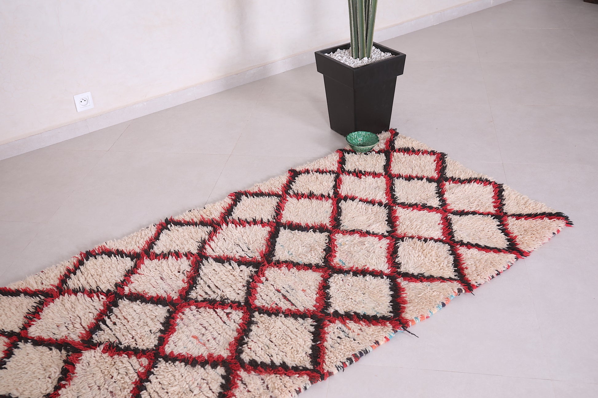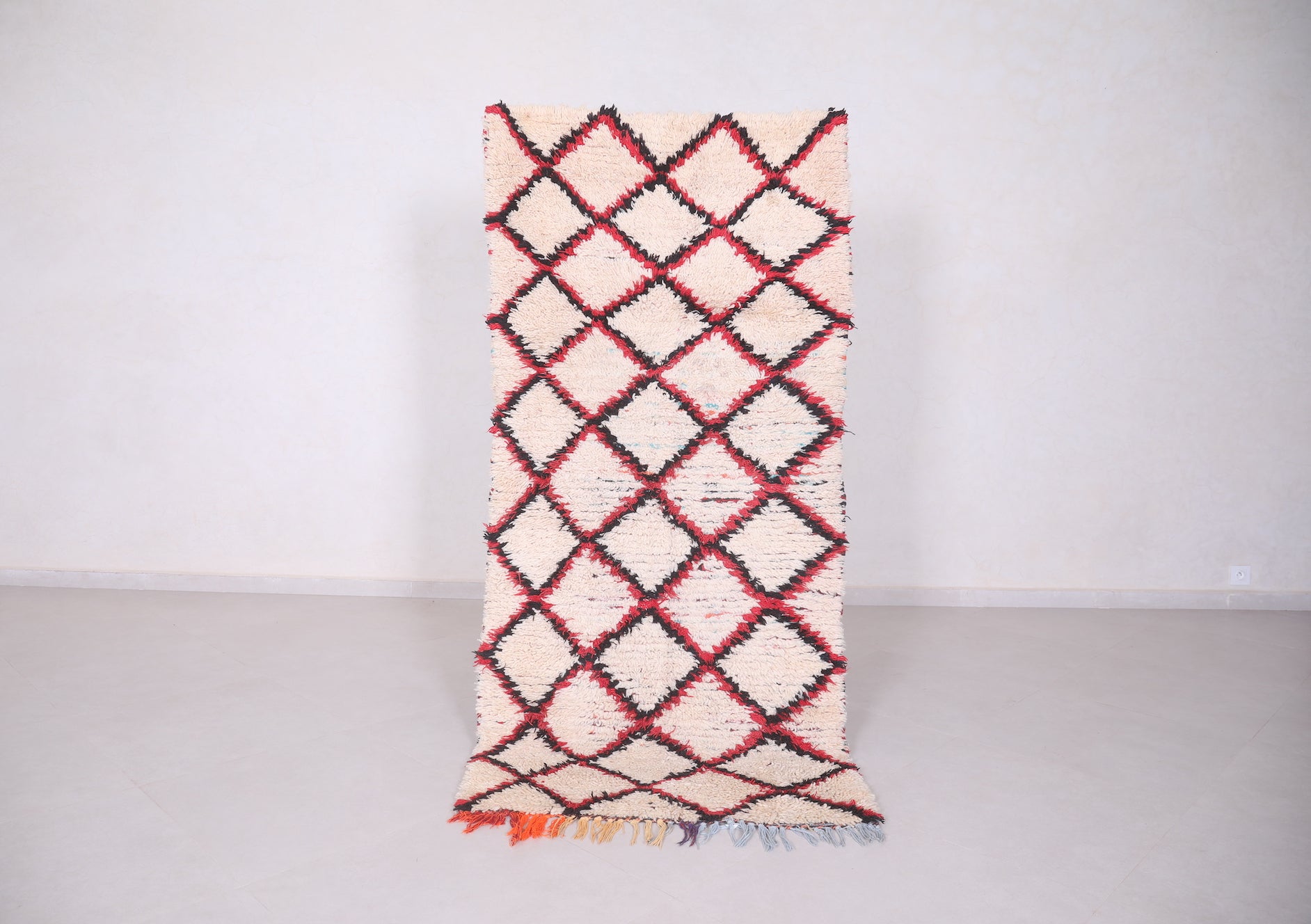 Discover the beauty of Moroccan craftsmanship with this vintage Azilal rug, measuring 3.2 x 6.9 feet. Featuring a striking diamond pattern in contrasting red, black, and ivory tones, this rug adds texture and warmth to any room. Each piece is handwoven by Berber artisans, showcasing their heritage and unique artistic expression. Add this timeless piece to your home and enjoy the charm of Moroccan artistry.