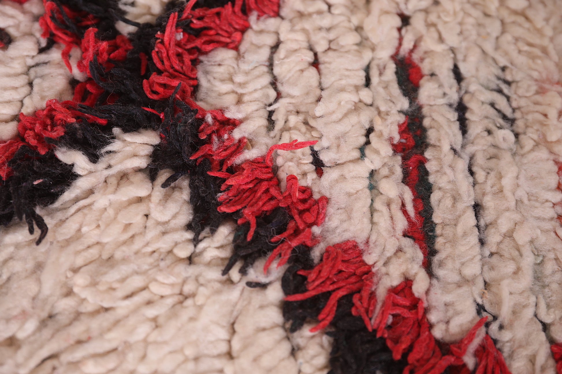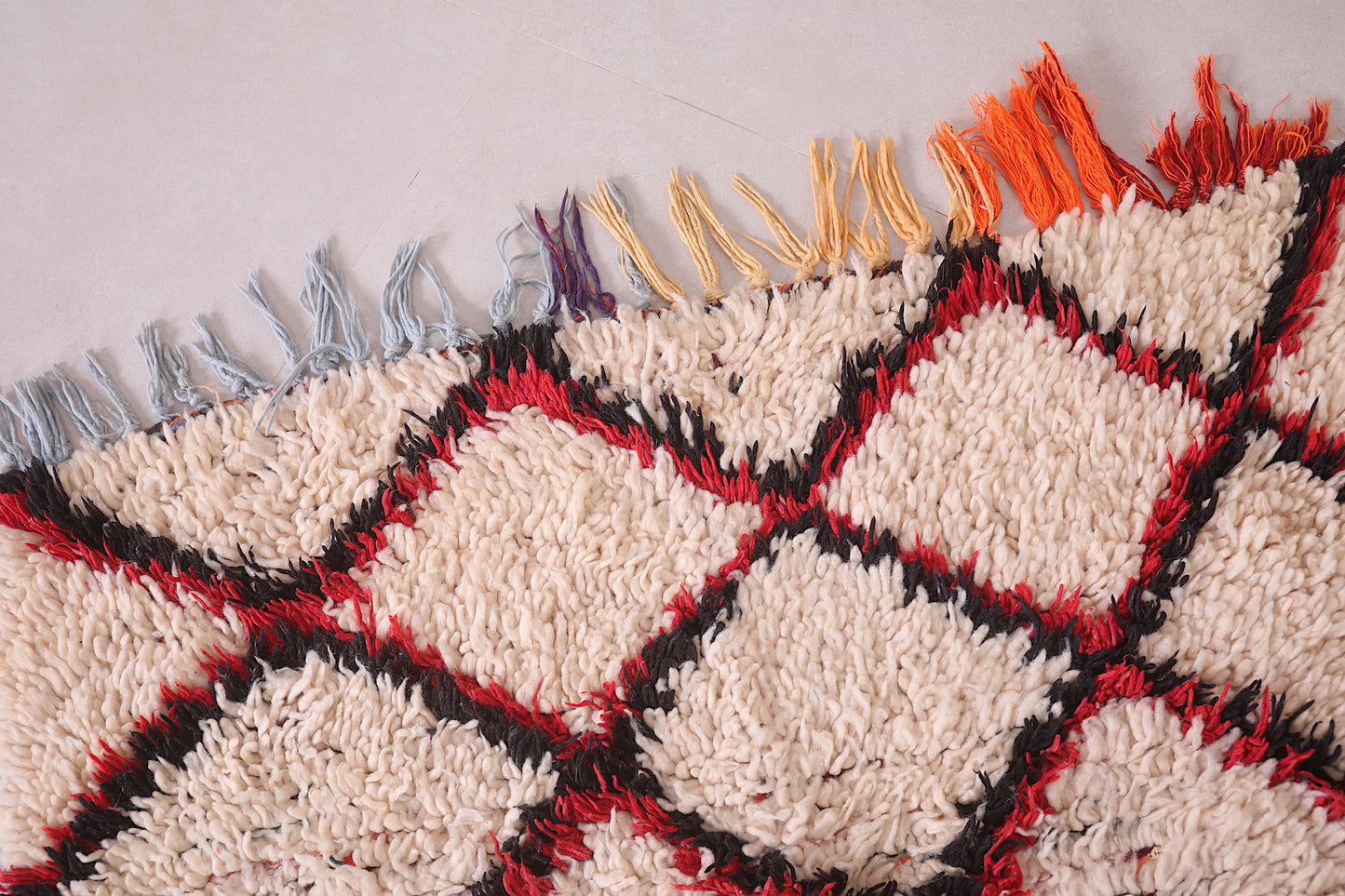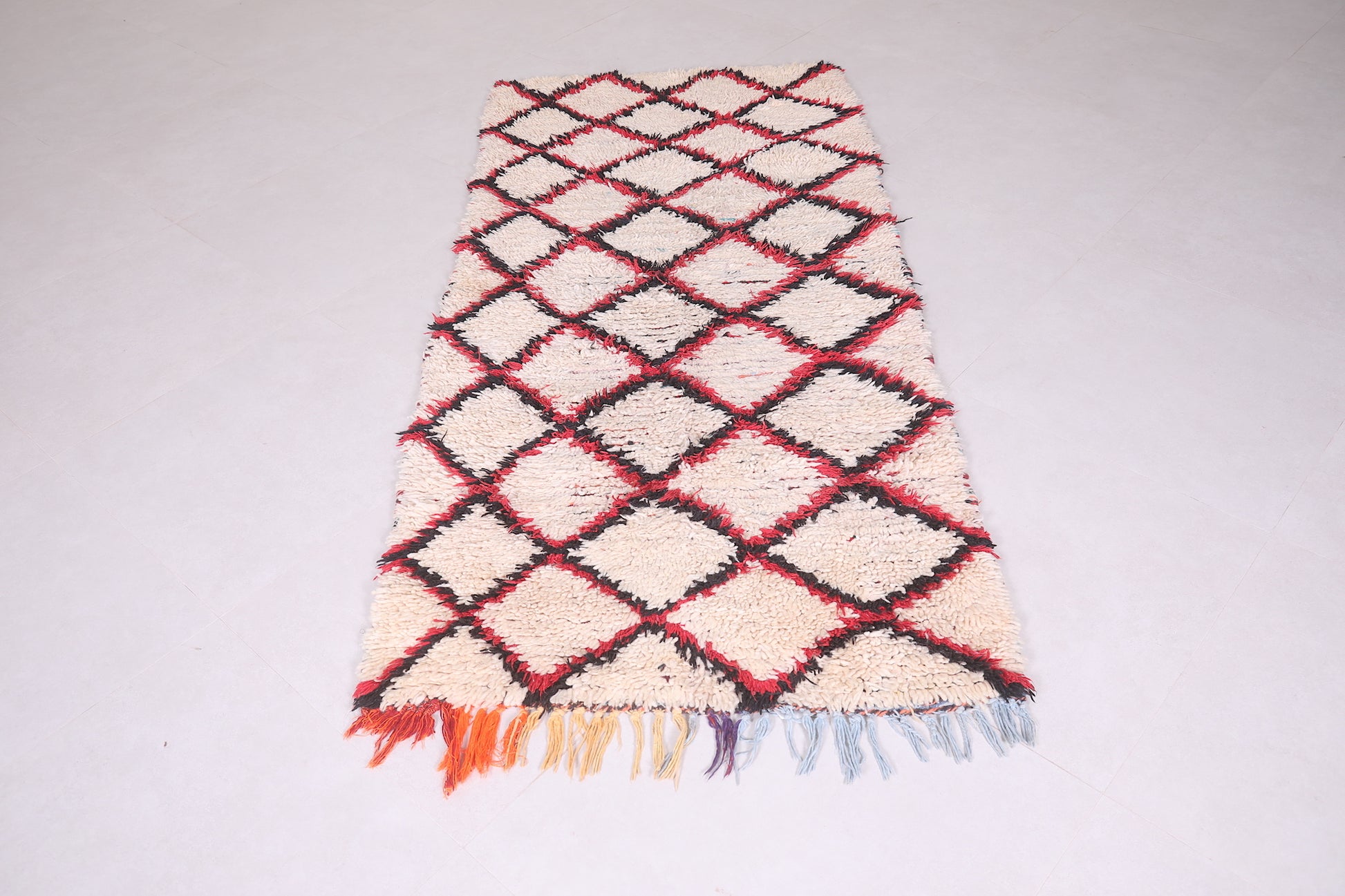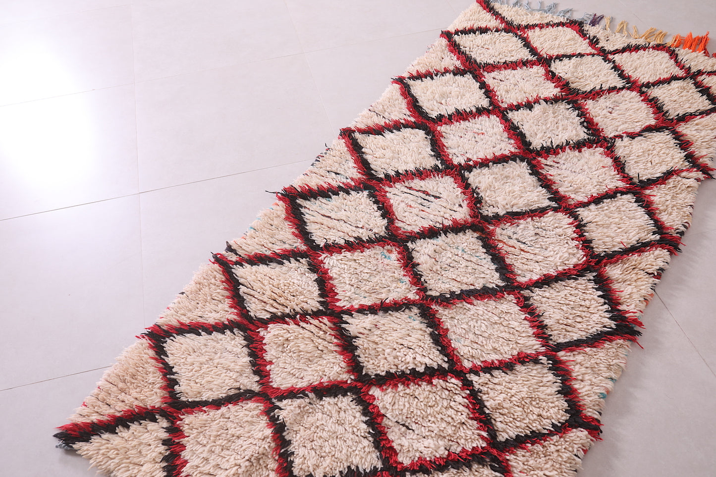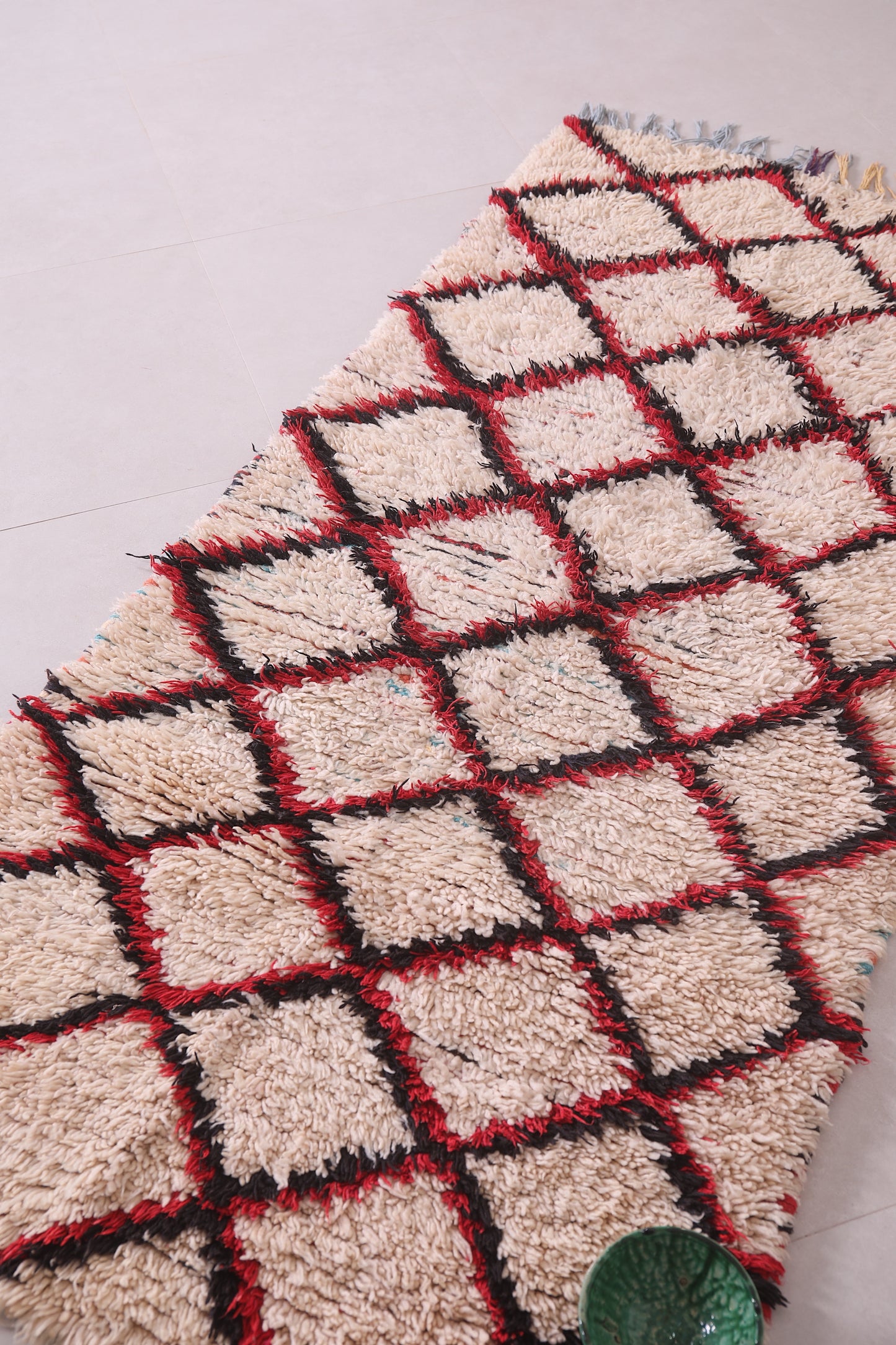 Discover the beauty of Moroccan craftsmanship with this vintage Azilal rug, measuring 3.2 x 6.9 feet. Featuring a striking diamond pattern in contrasting red, black, and ivory tones, this rug adds texture and warmth to any room. Each piece is handwoven by Berber artisans, showcasing their heritage and unique artistic expression. Add this timeless piece to your home and enjoy the charm of Moroccan artistry.