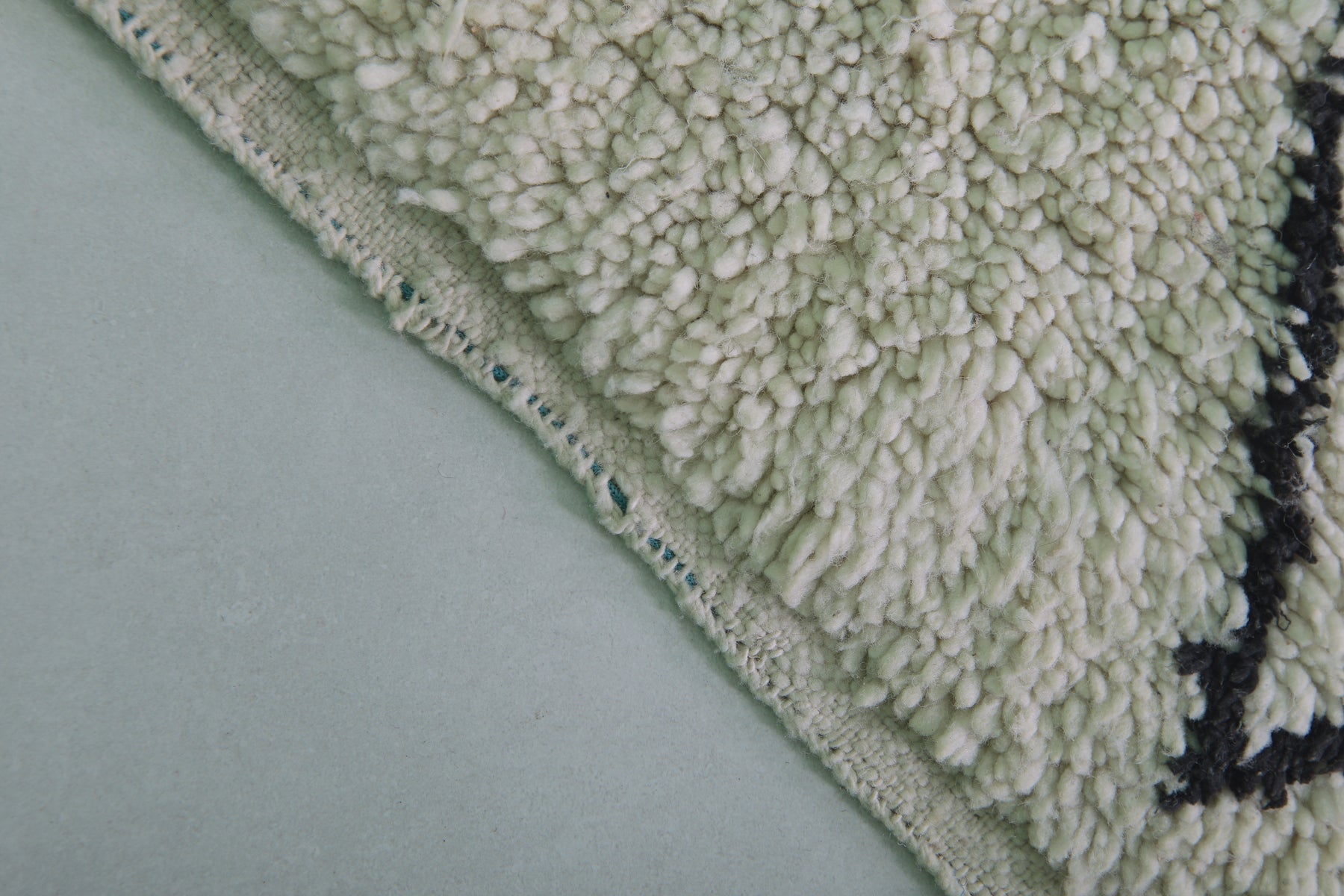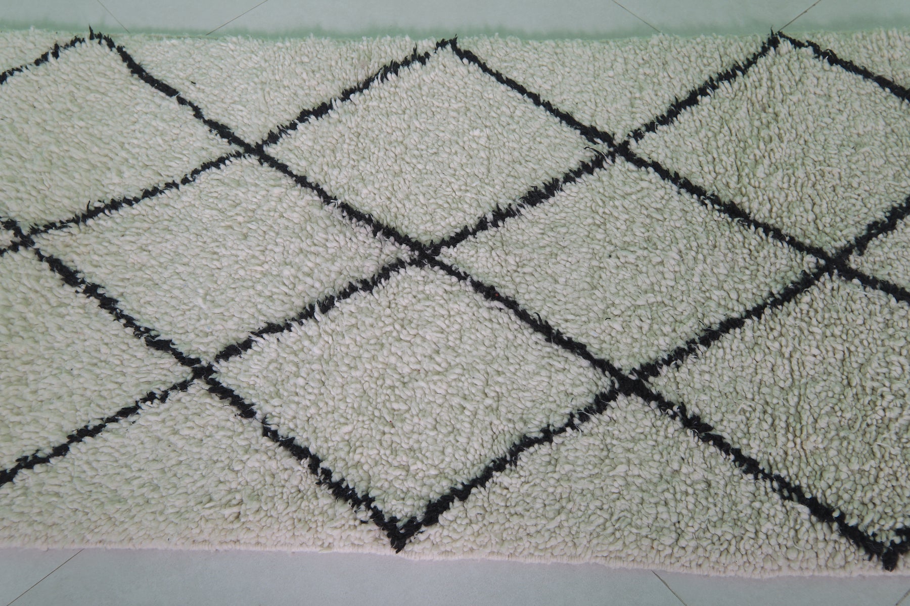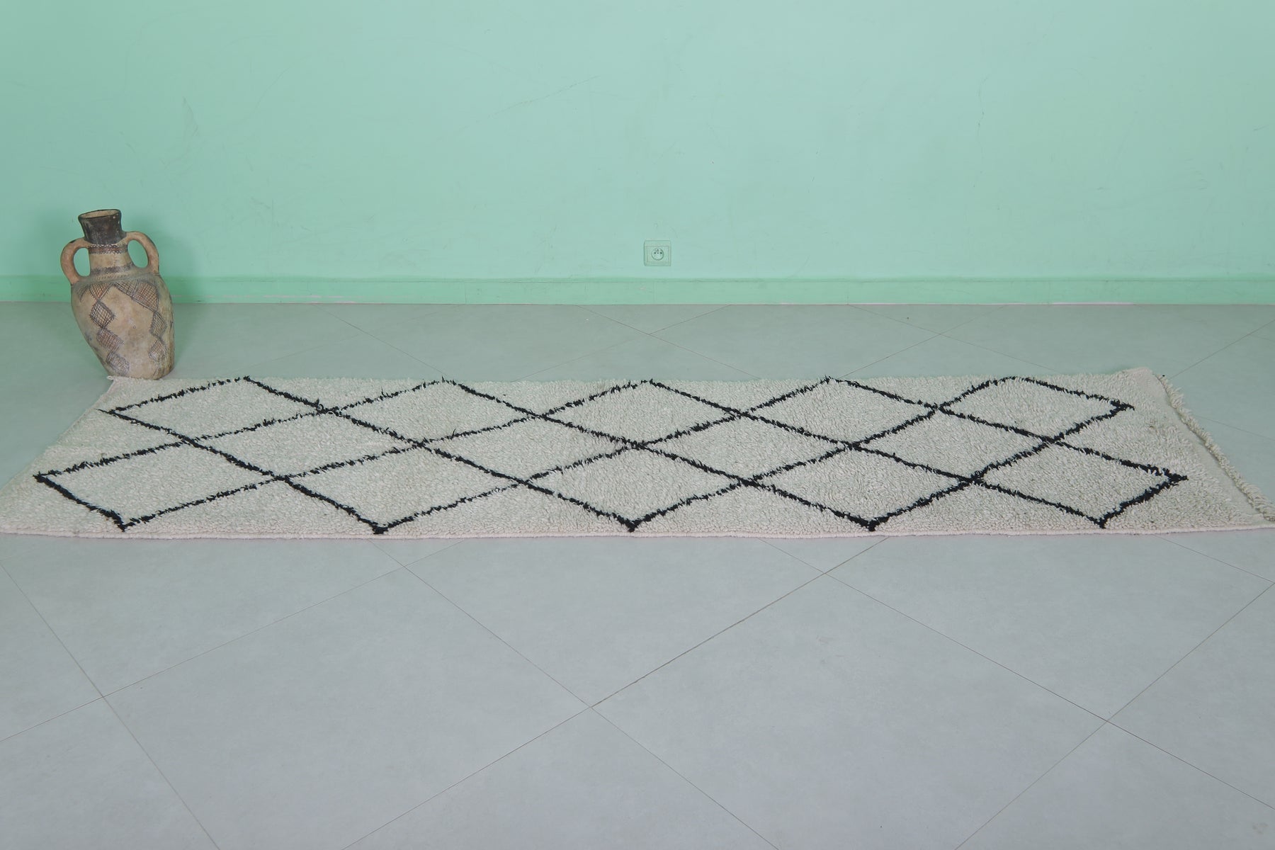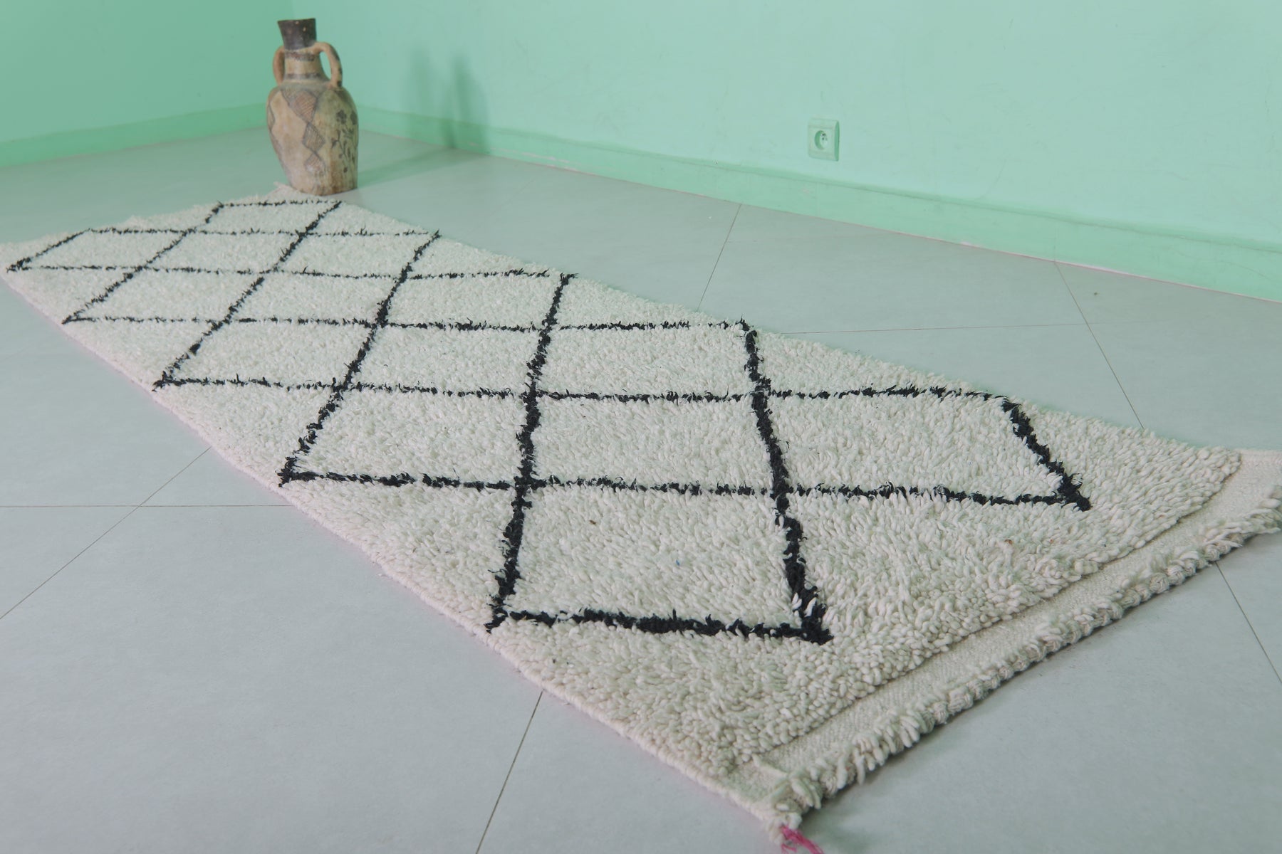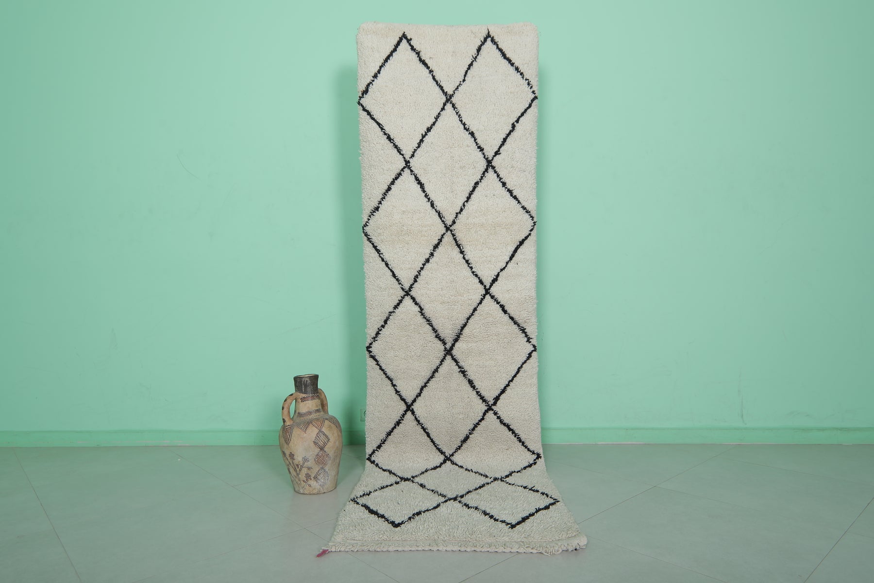 - Classic Beni Ourain black diamond lattice on a beige base.