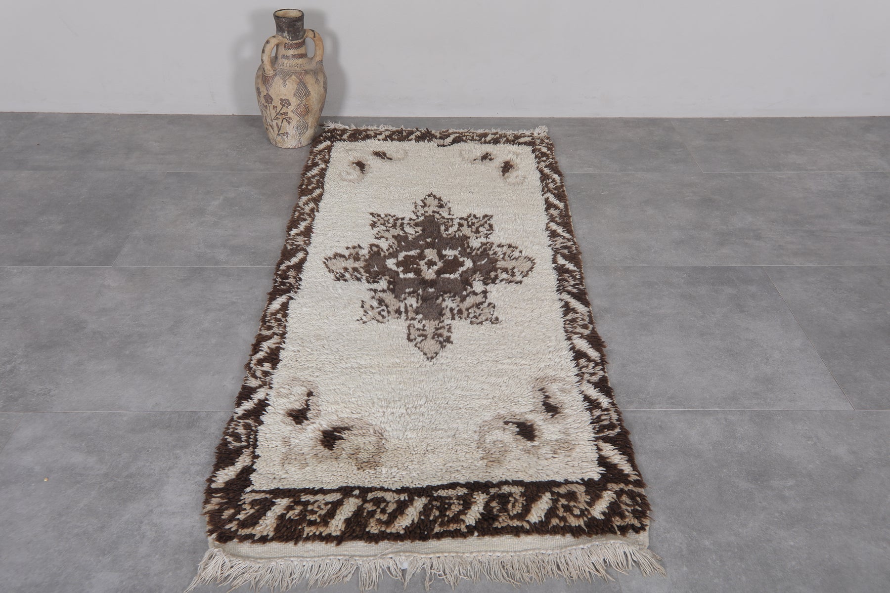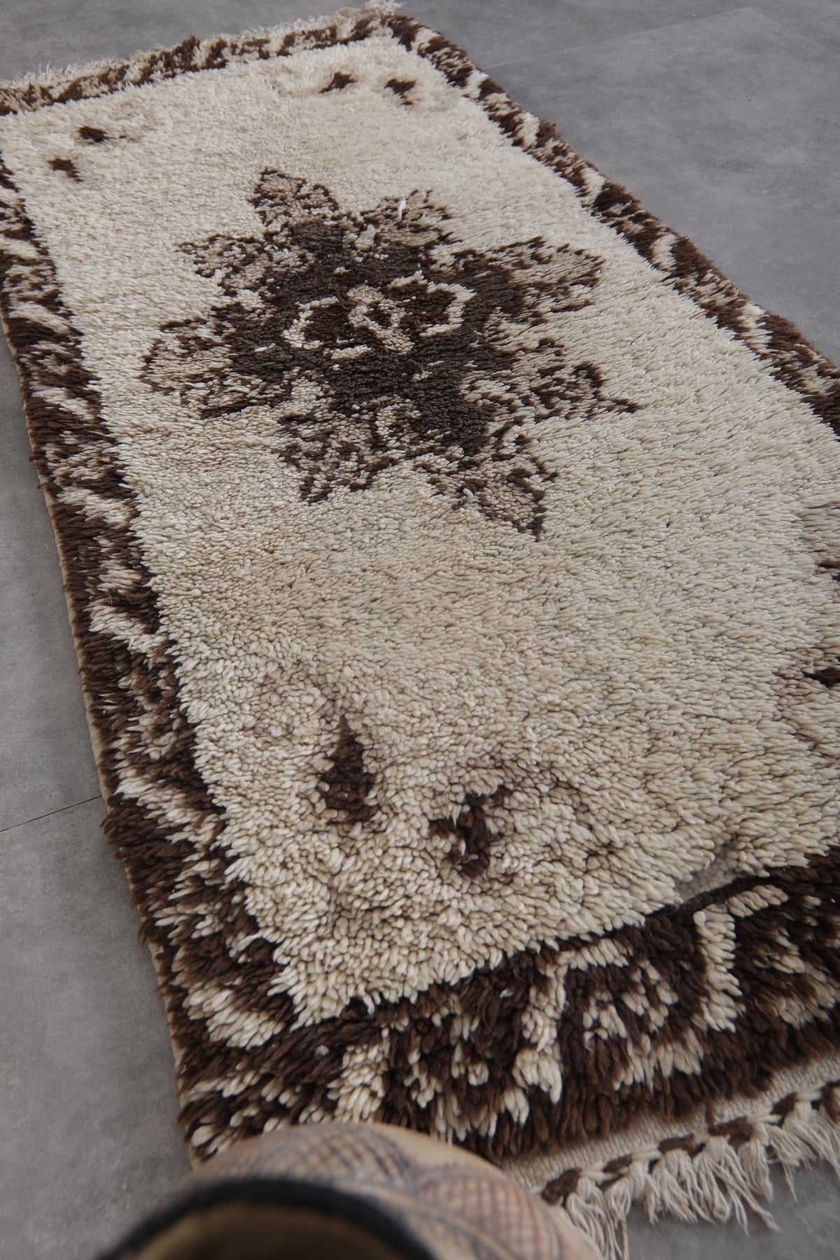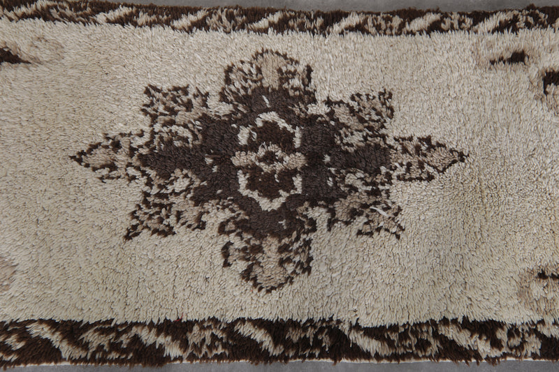 Enhance your home with this Vintage Berber Carpet, sized at 2.3 x 6.3 feet (84 CM x 194 CM). Featuring a traditional geometric medallion design with intricate brown and ivory patterns, this handcrafted Moroccan rug adds warmth and culture to any space.