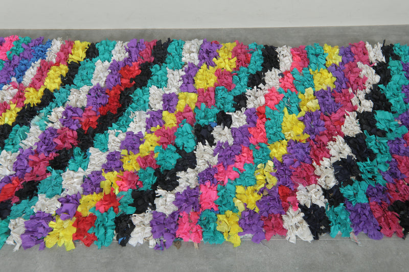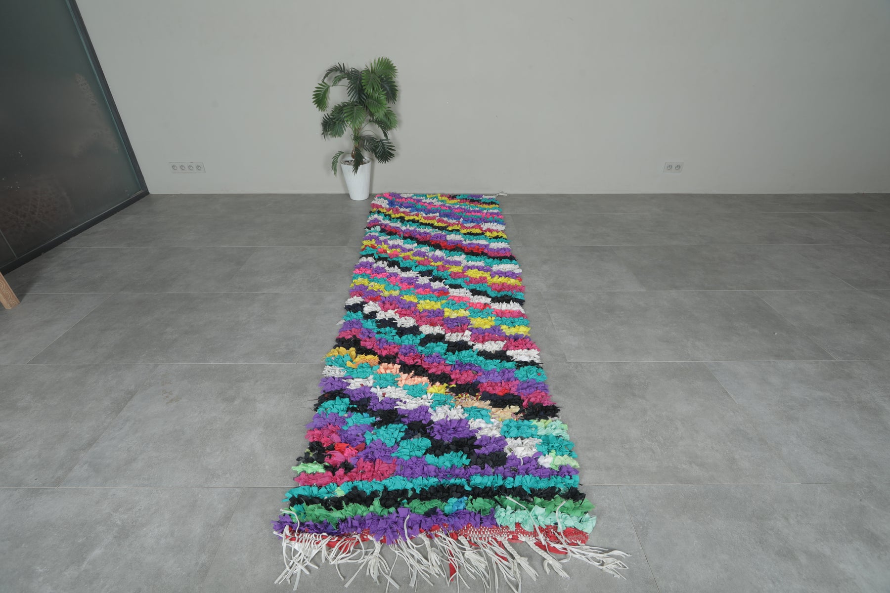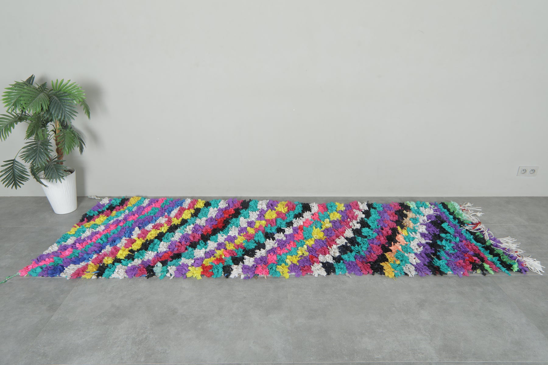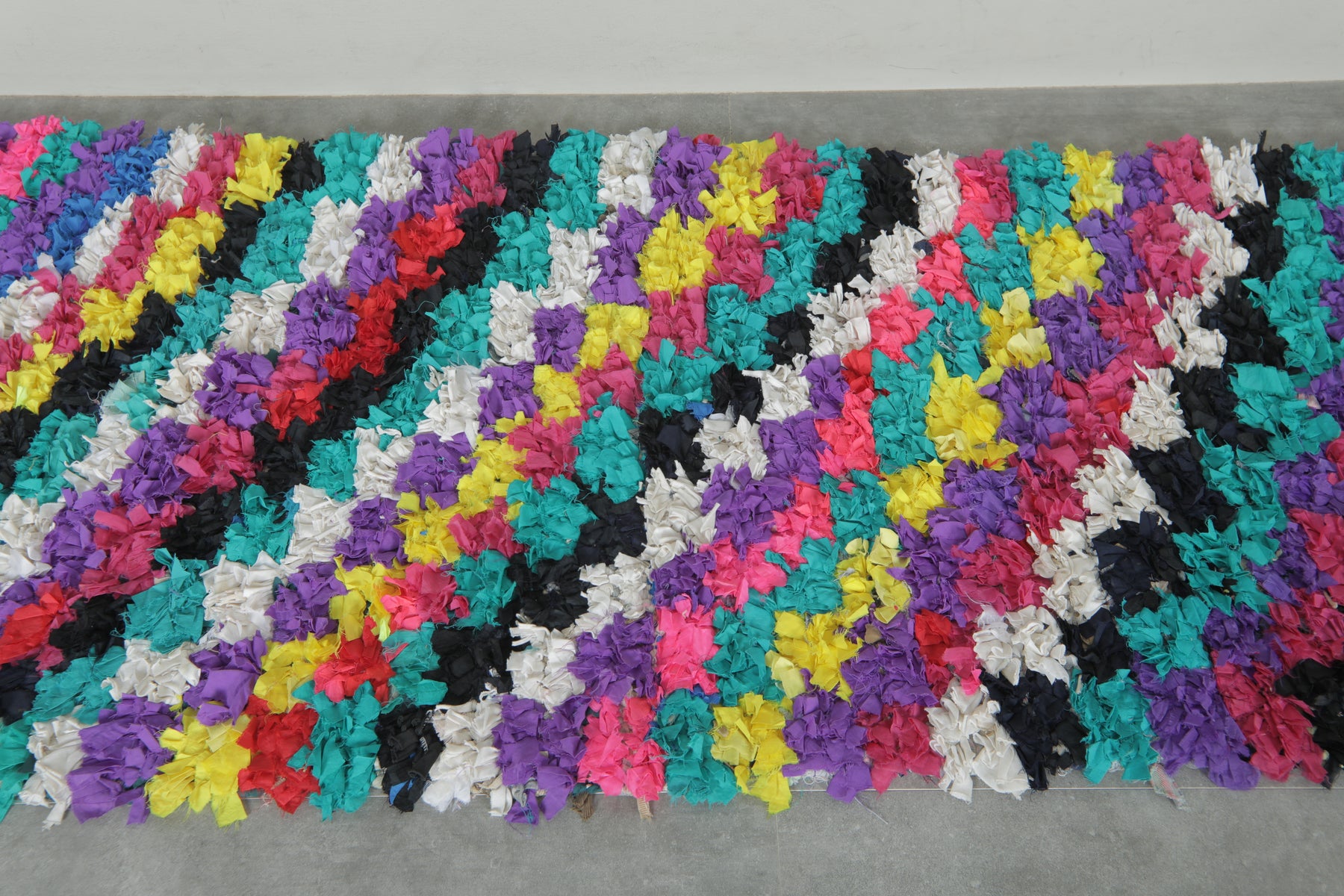 Turn up the color with this electrifying Moroccan Boucherouite runner. Measuring 3 x 9.6 ft, it features cascading diagonal waves of vivid color—from teal, hot pink, and purple to bright yellow, black, and white—all hand-knotted using repurposed fabric strips. It’s a joyful expression of movement and texture, perfect for lively interiors, kids' rooms, or creative studios.