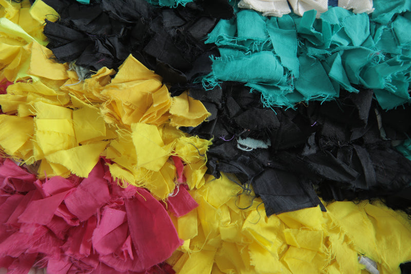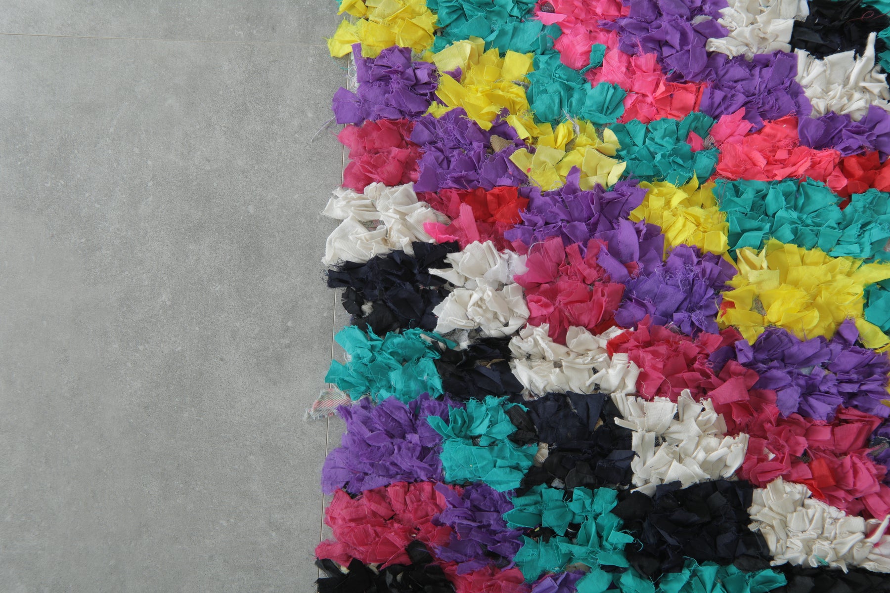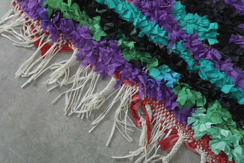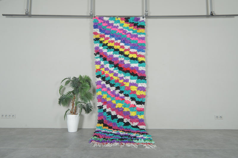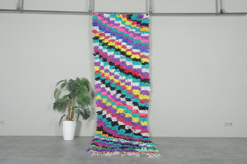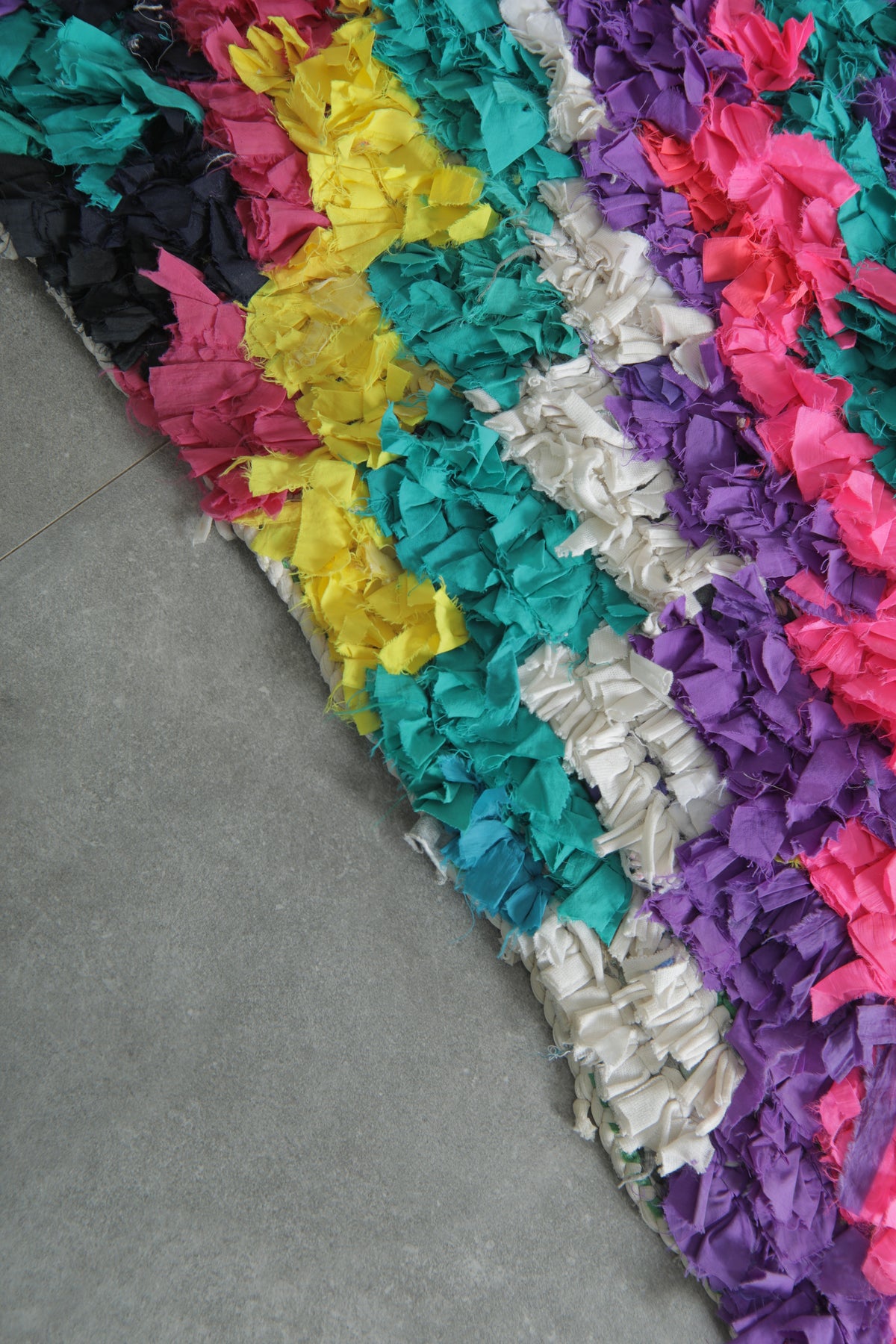 Turn up the color with this electrifying Moroccan Boucherouite runner. Measuring 3 x 9.6 ft, it features cascading diagonal waves of vivid color—from teal, hot pink, and purple to bright yellow, black, and white—all hand-knotted using repurposed fabric strips. It’s a joyful expression of movement and texture, perfect for lively interiors, kids' rooms, or creative studios.