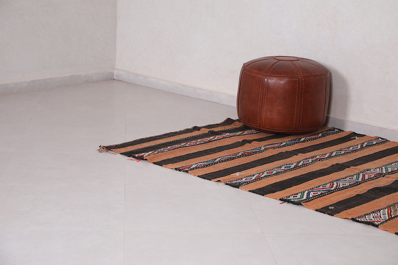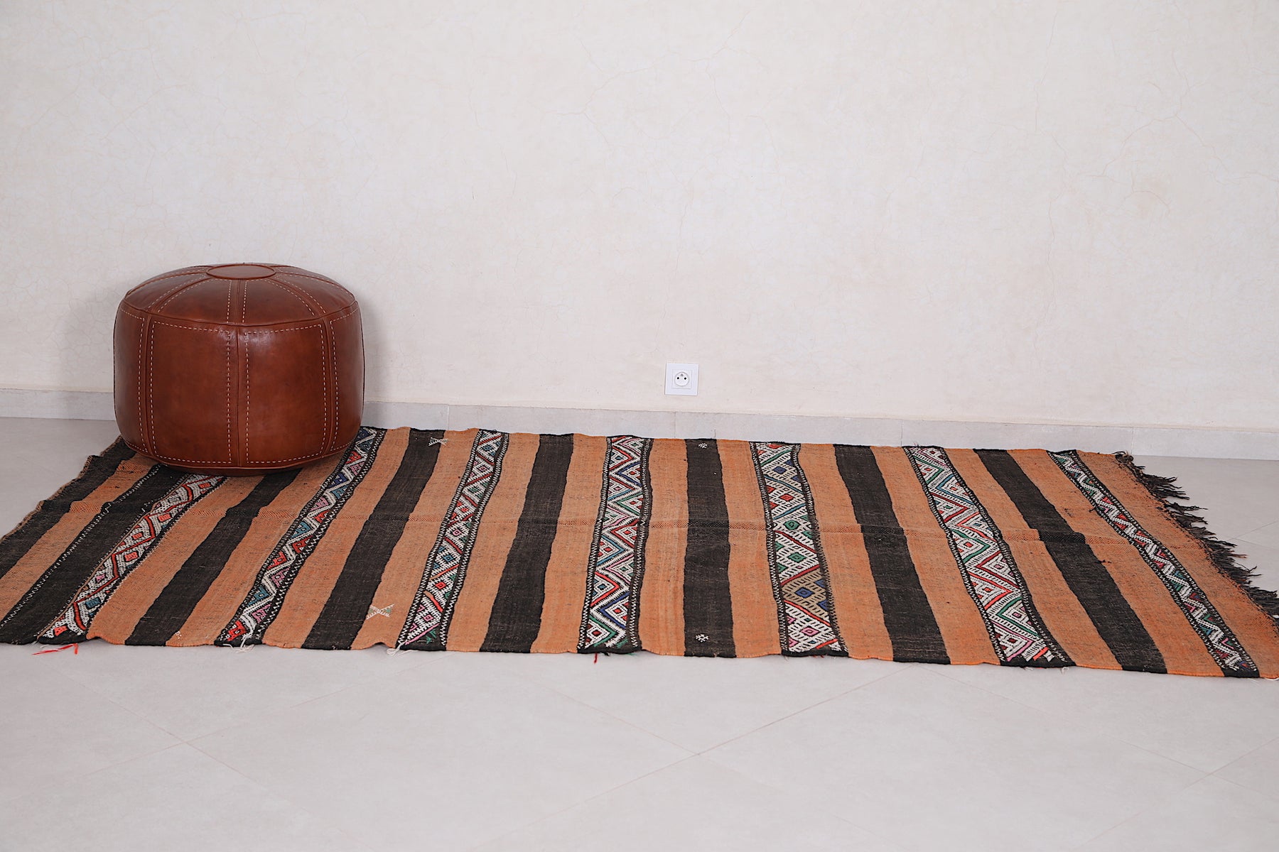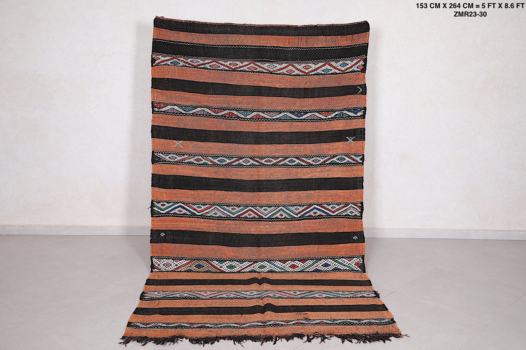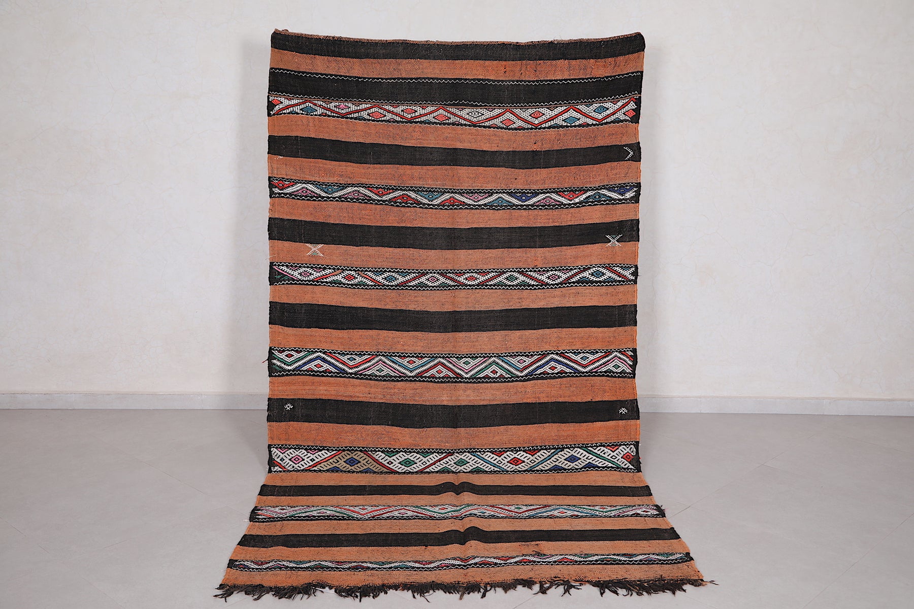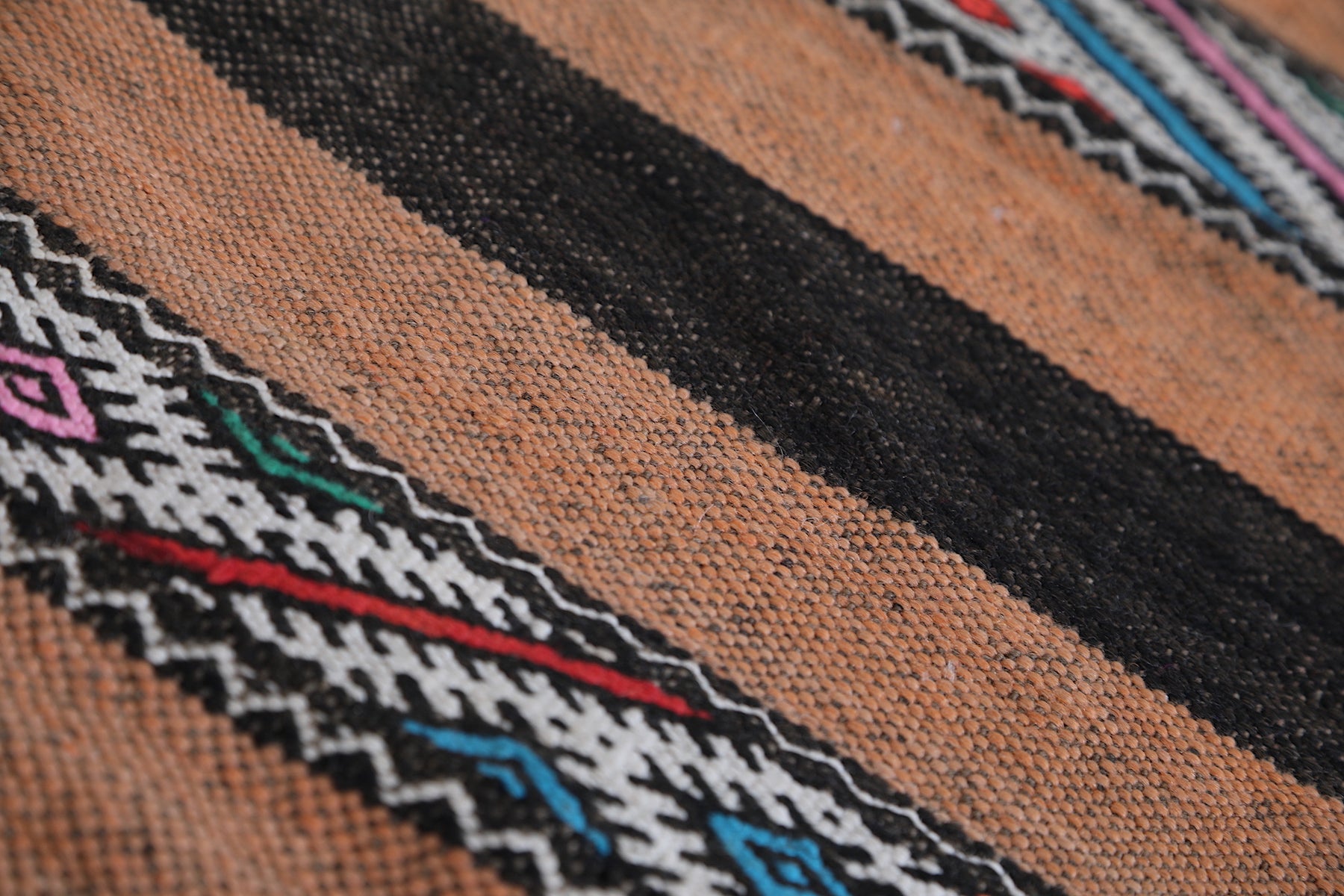 • Rich earthy tones and geometric Berber motifs in horizontal stripes.