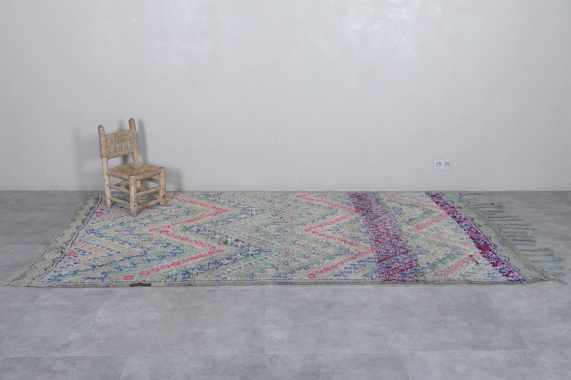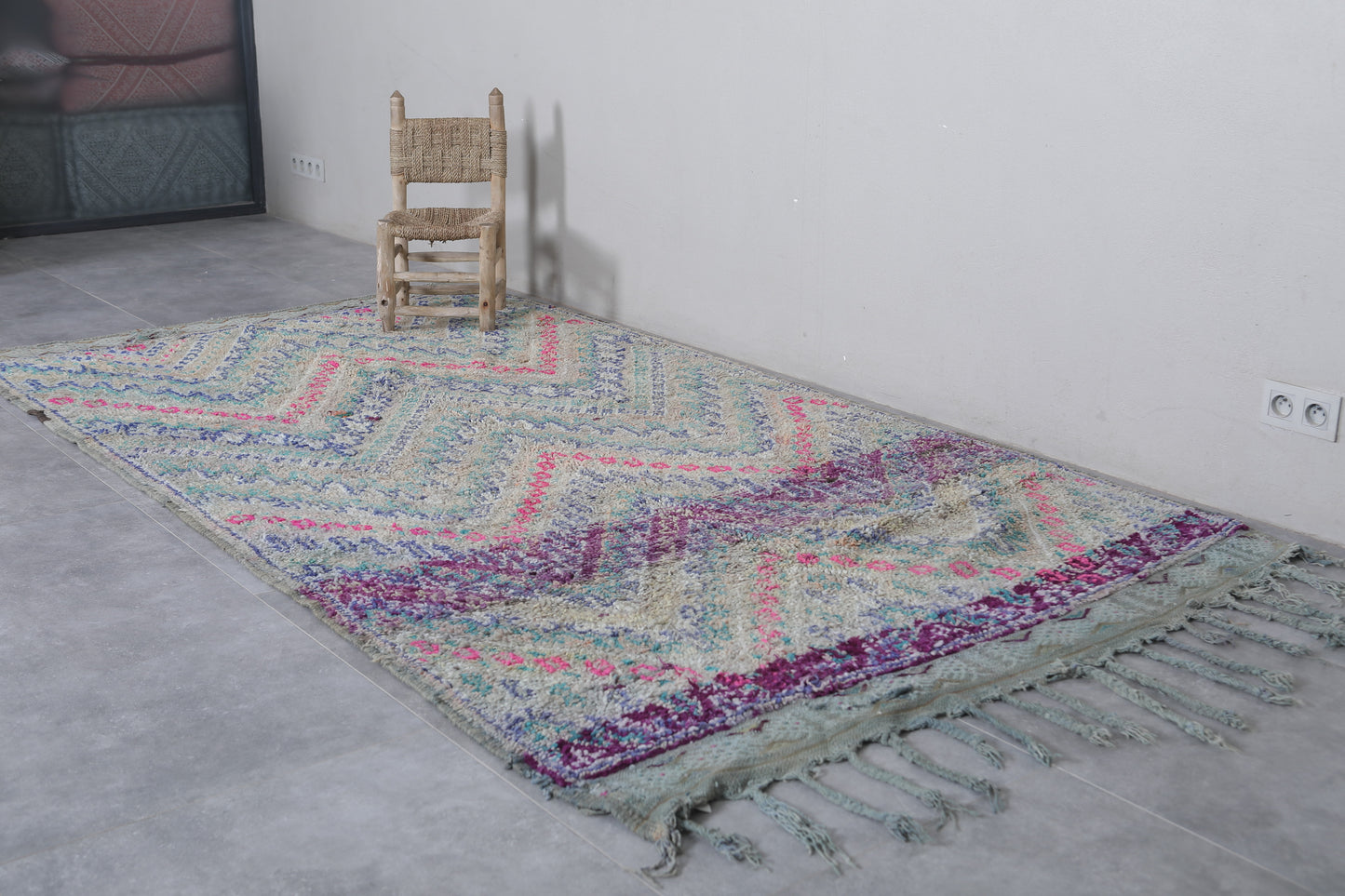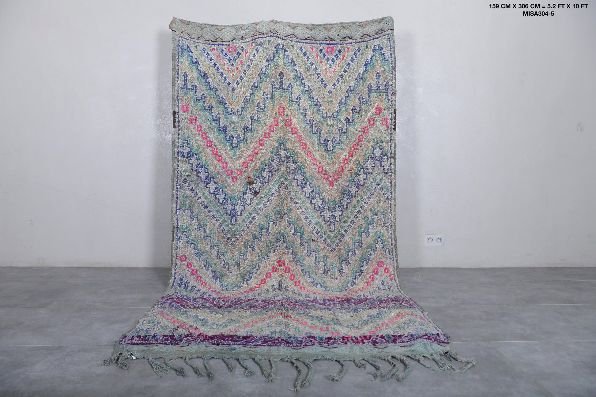 This 5.2 x 10 feet vintage Berber rug features intricate tribal chevron patterns in soft hues of blue, pink, and beige. Handwoven with expert craftsmanship, this one-of-a-kind treasure exudes timeless elegance and cultural charm. Perfect for larger living areas or bedrooms, it adds warmth, texture, and a unique Moroccan touch to any space.
