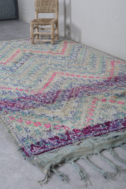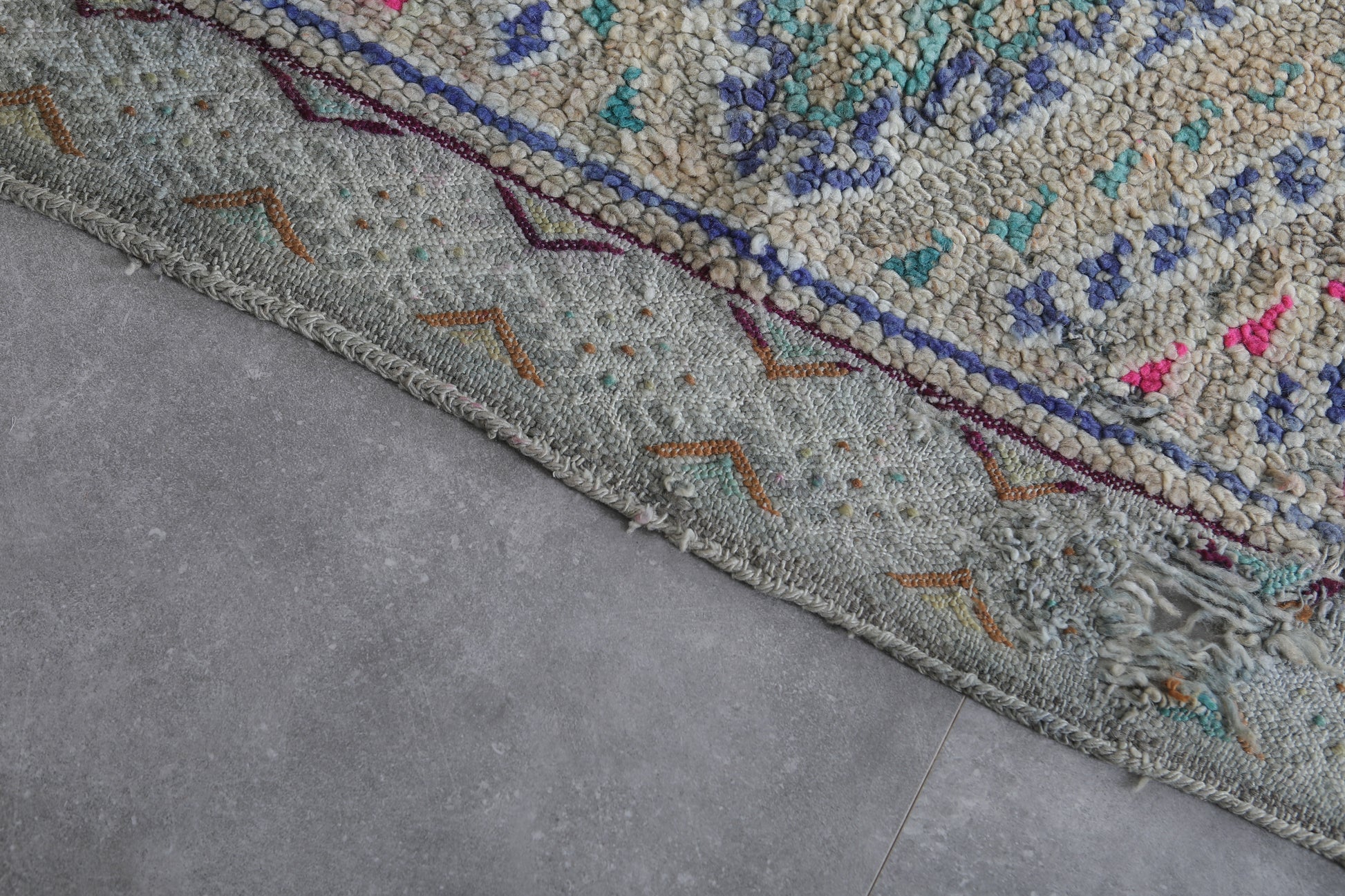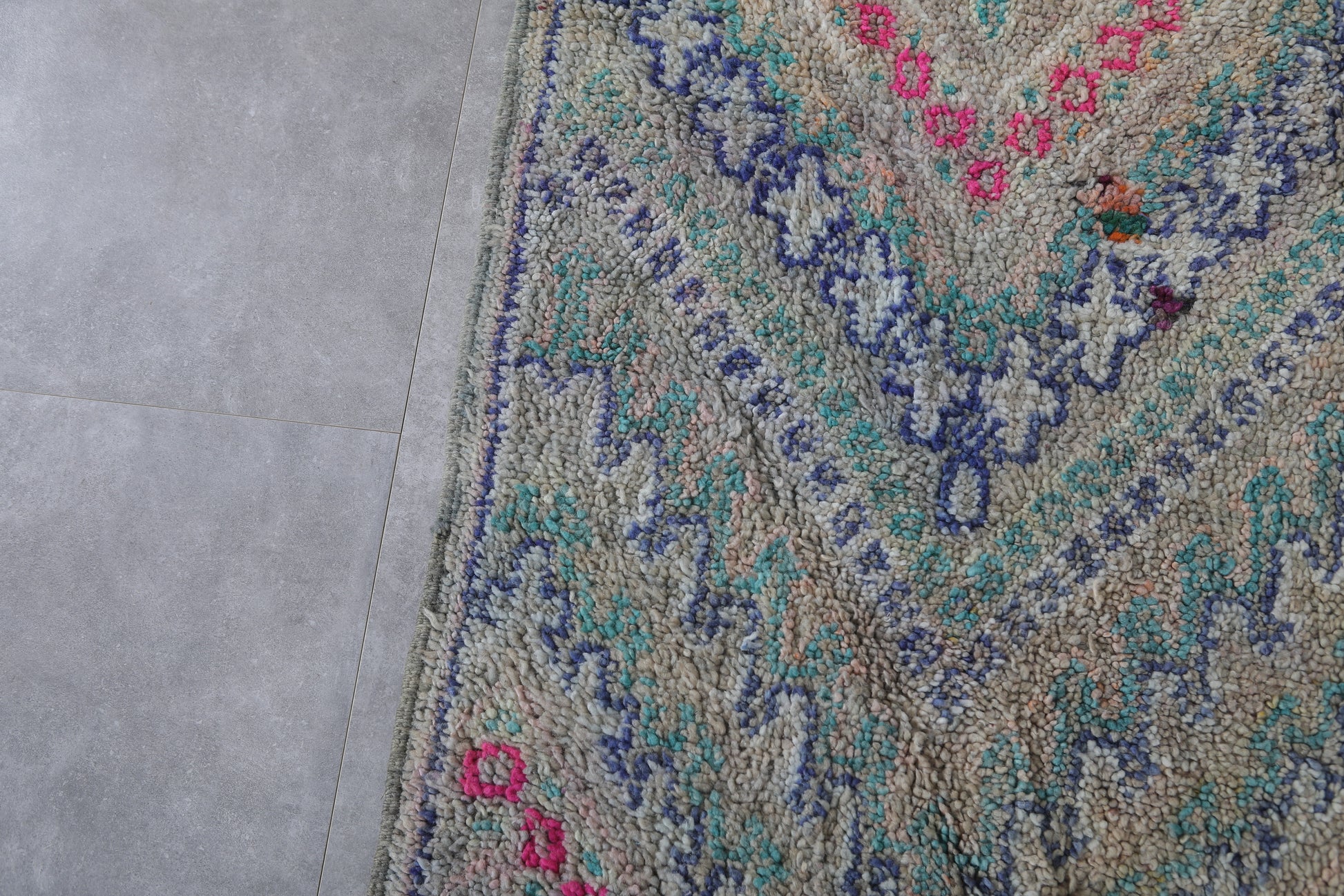 This 5.2 x 10 feet vintage Berber rug features intricate tribal chevron patterns in soft hues of blue, pink, and beige. Handwoven with expert craftsmanship, this one-of-a-kind treasure exudes timeless elegance and cultural charm. Perfect for larger living areas or bedrooms, it adds warmth, texture, and a unique Moroccan touch to any space.