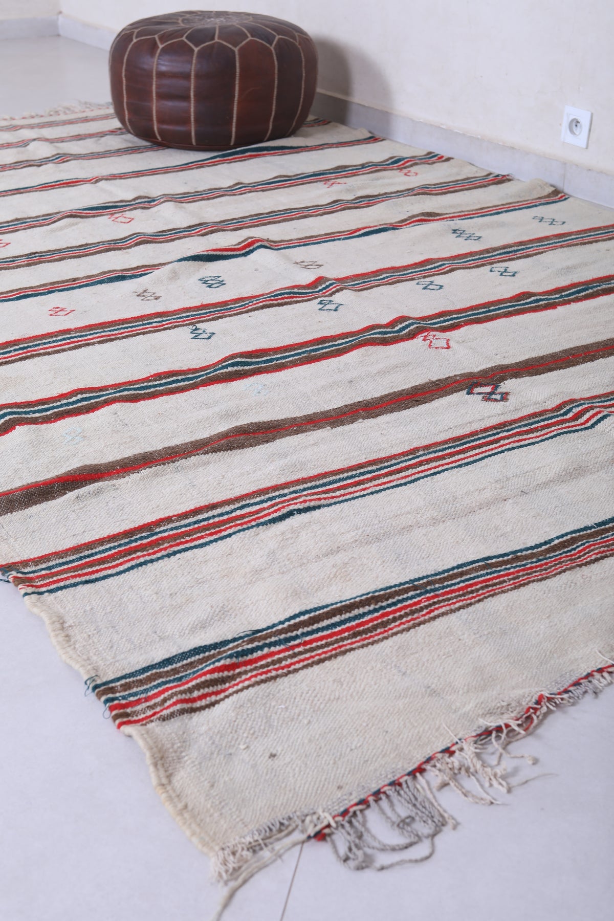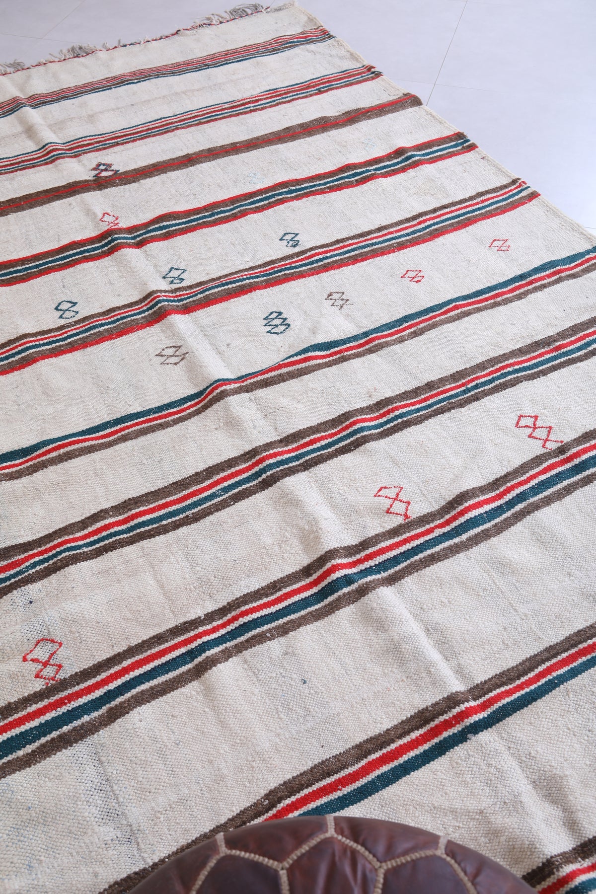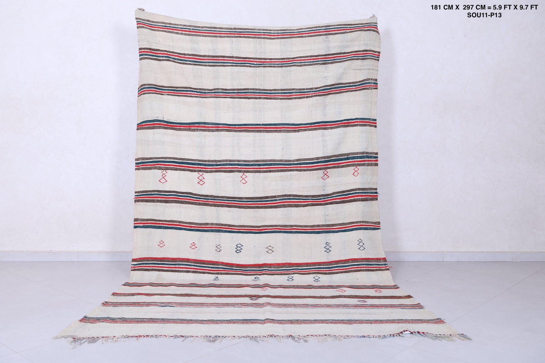 This 5.9 x 9.7 feet vintage handmade Berber rug showcases traditional Moroccan striped patterns with earthy tribal motifs, adding a unique cultural charm to any space. Handwoven from high-quality wool, this rug offers a soft yet durable texture, making it ideal for living rooms, dining areas, or statement spaces.