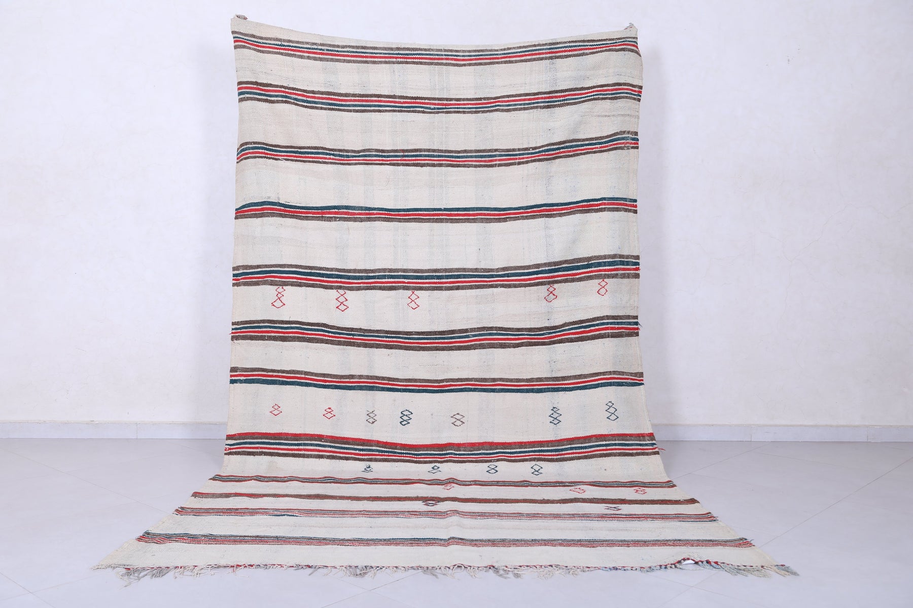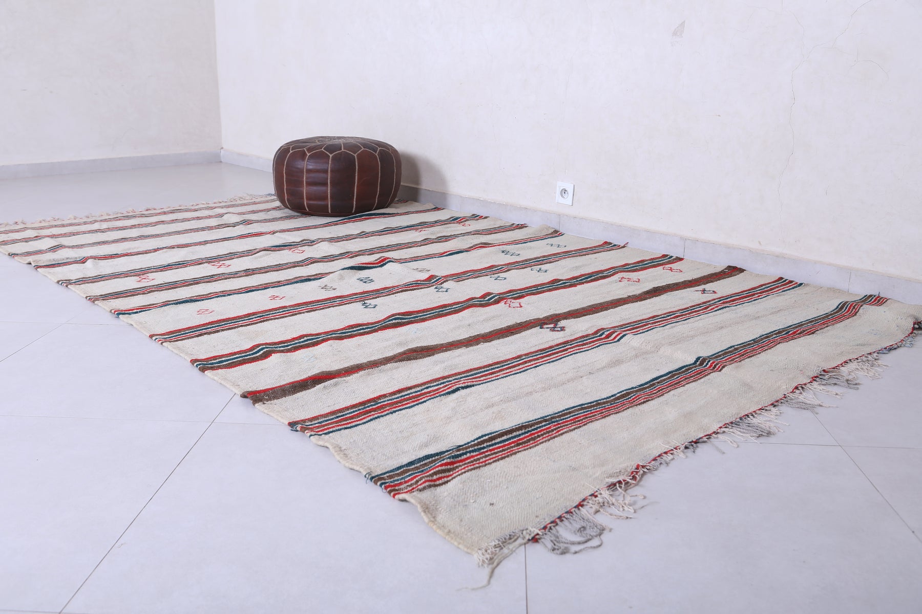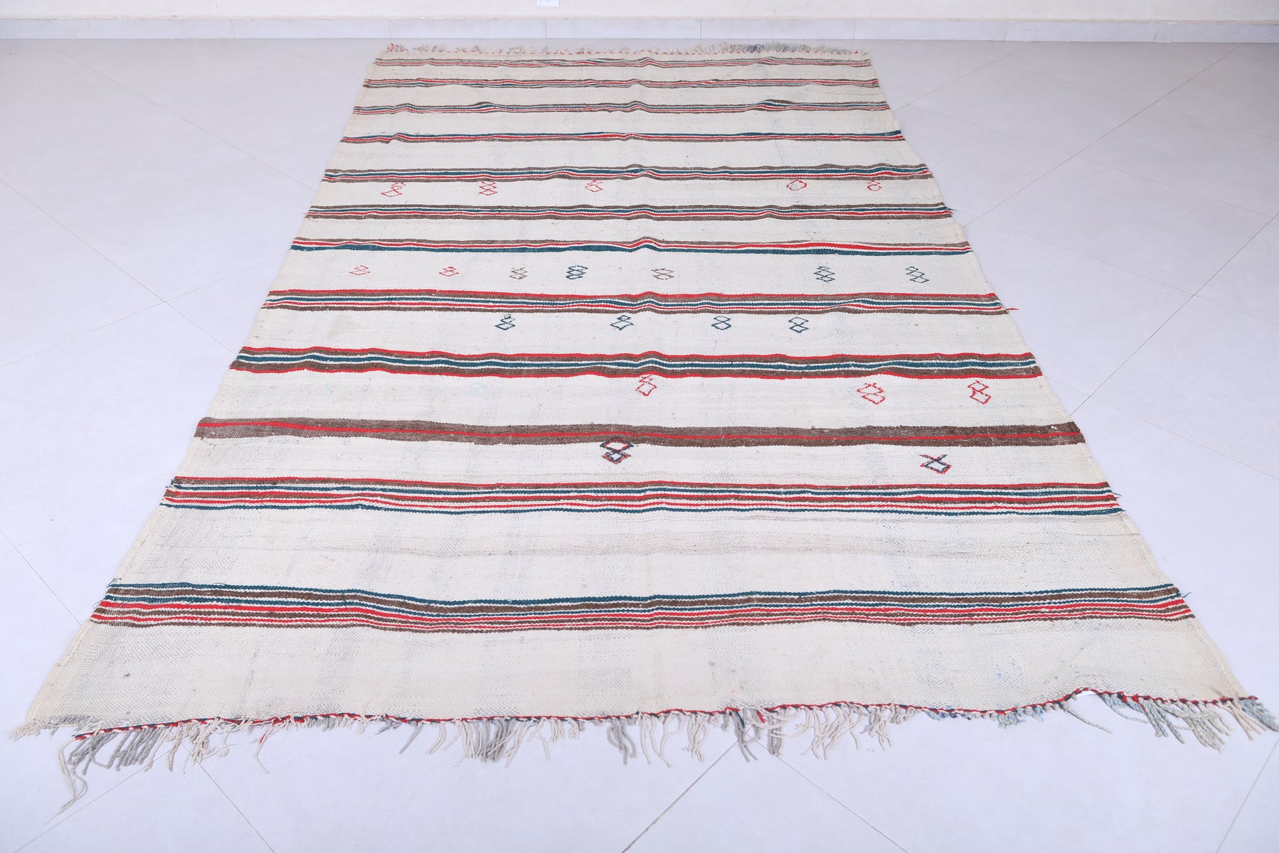 This 5.9 x 9.7 feet vintage handmade Berber rug showcases traditional Moroccan striped patterns with earthy tribal motifs, adding a unique cultural charm to any space. Handwoven from high-quality wool, this rug offers a soft yet durable texture, making it ideal for living rooms, dining areas, or statement spaces.