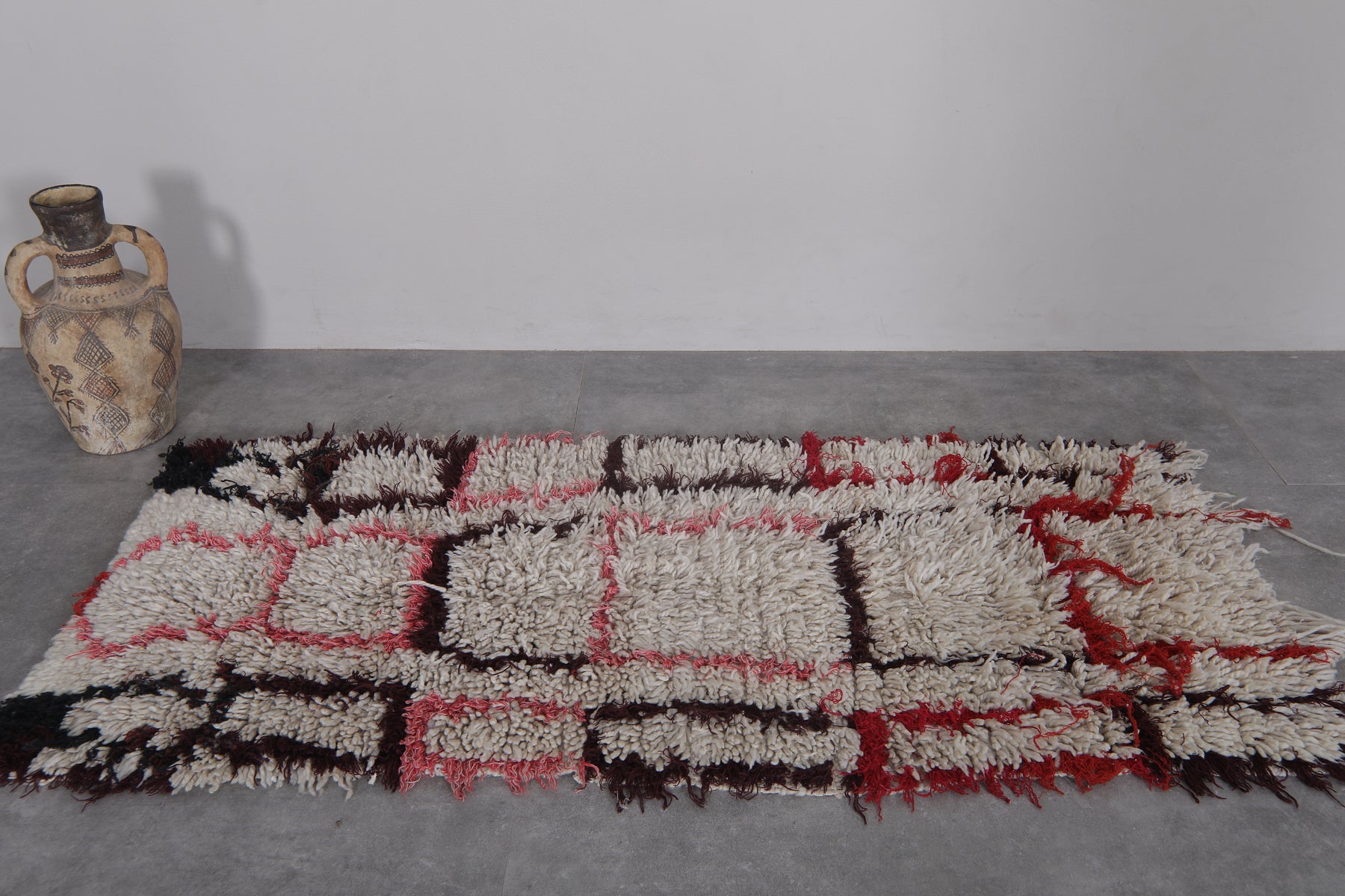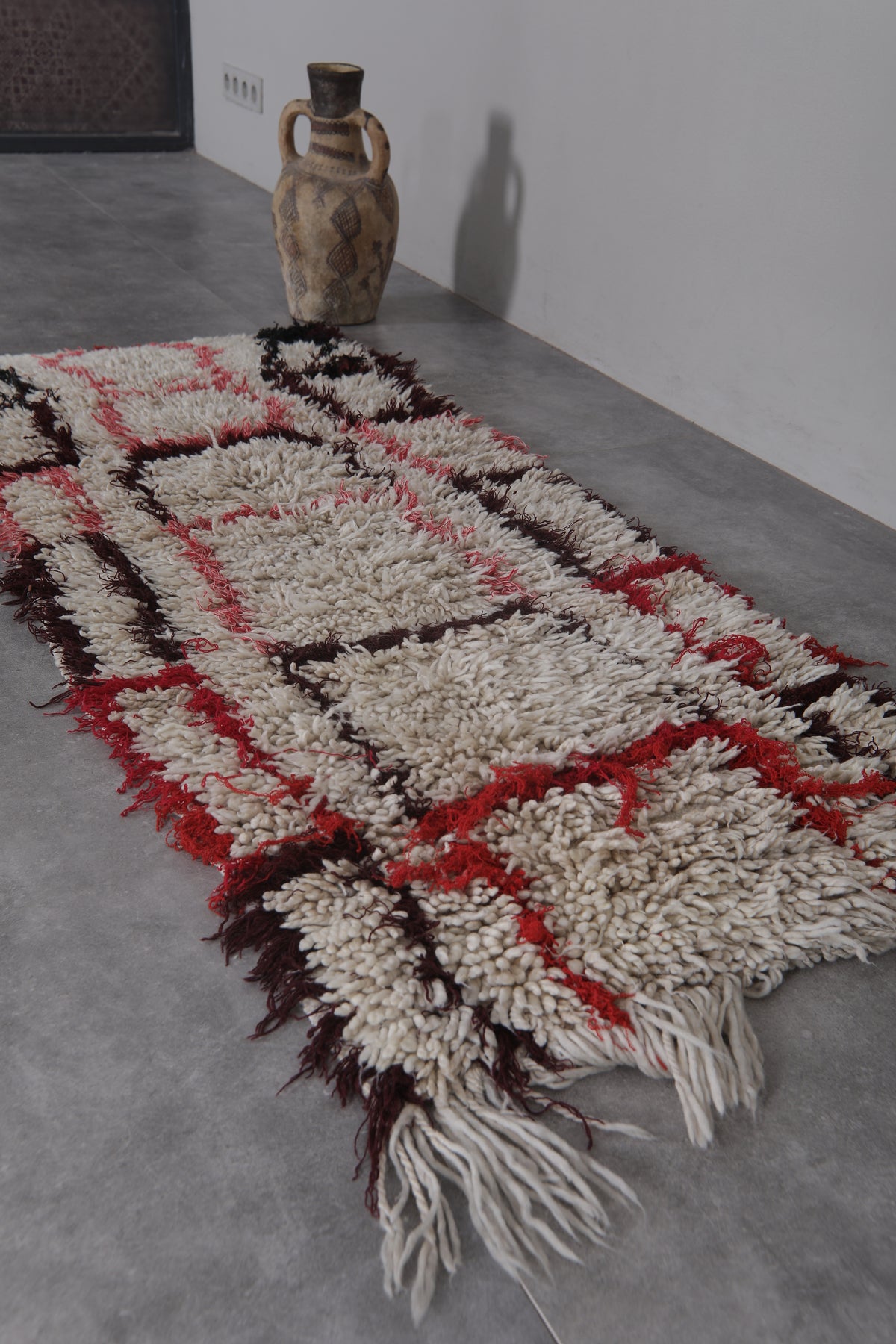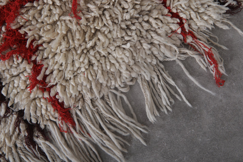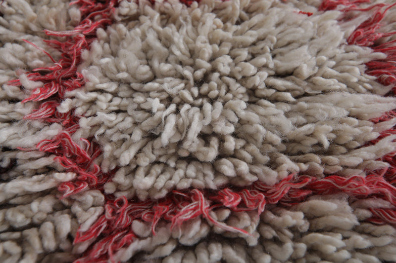 Add vintage charm to your space with this handmade Berber rug, crafted from Moroccan wool and sized at 2.5 x 5.7 FT. Its high-pile shag texture and bold red, pink, and black geometric pattern on an ivory base make it a standout accent for bedrooms, reading corners, or creative interiors.