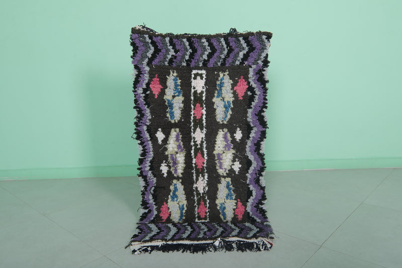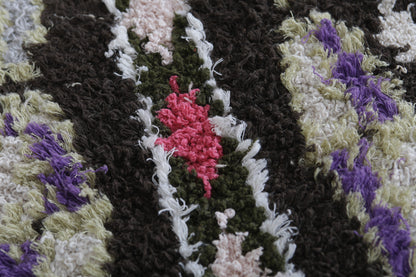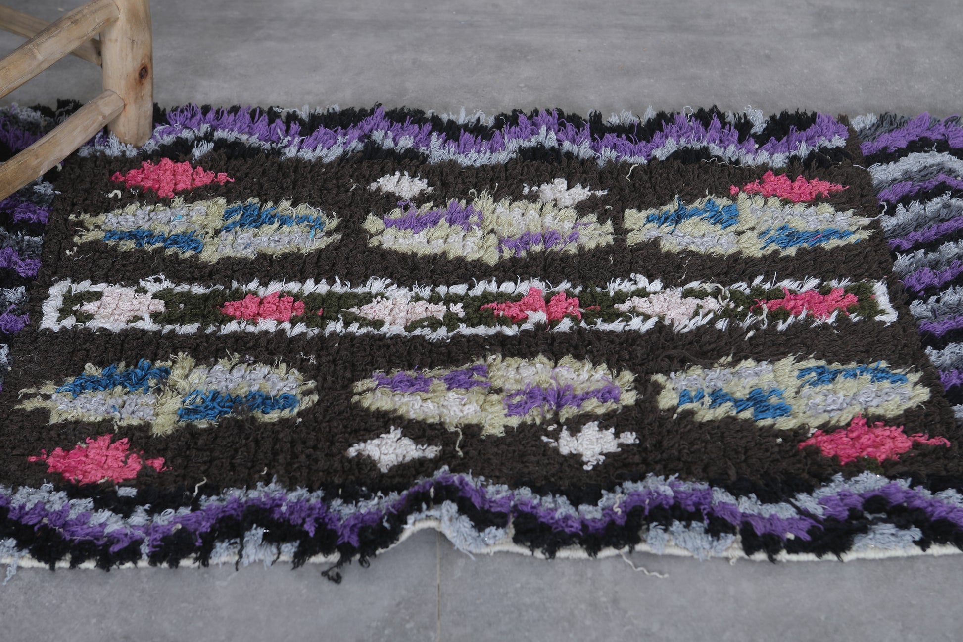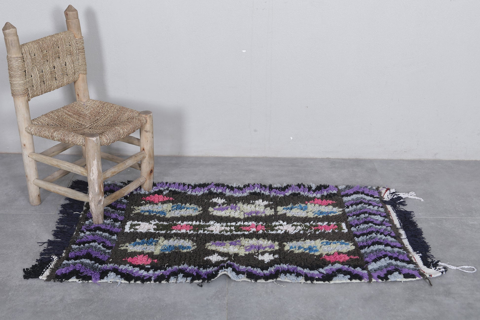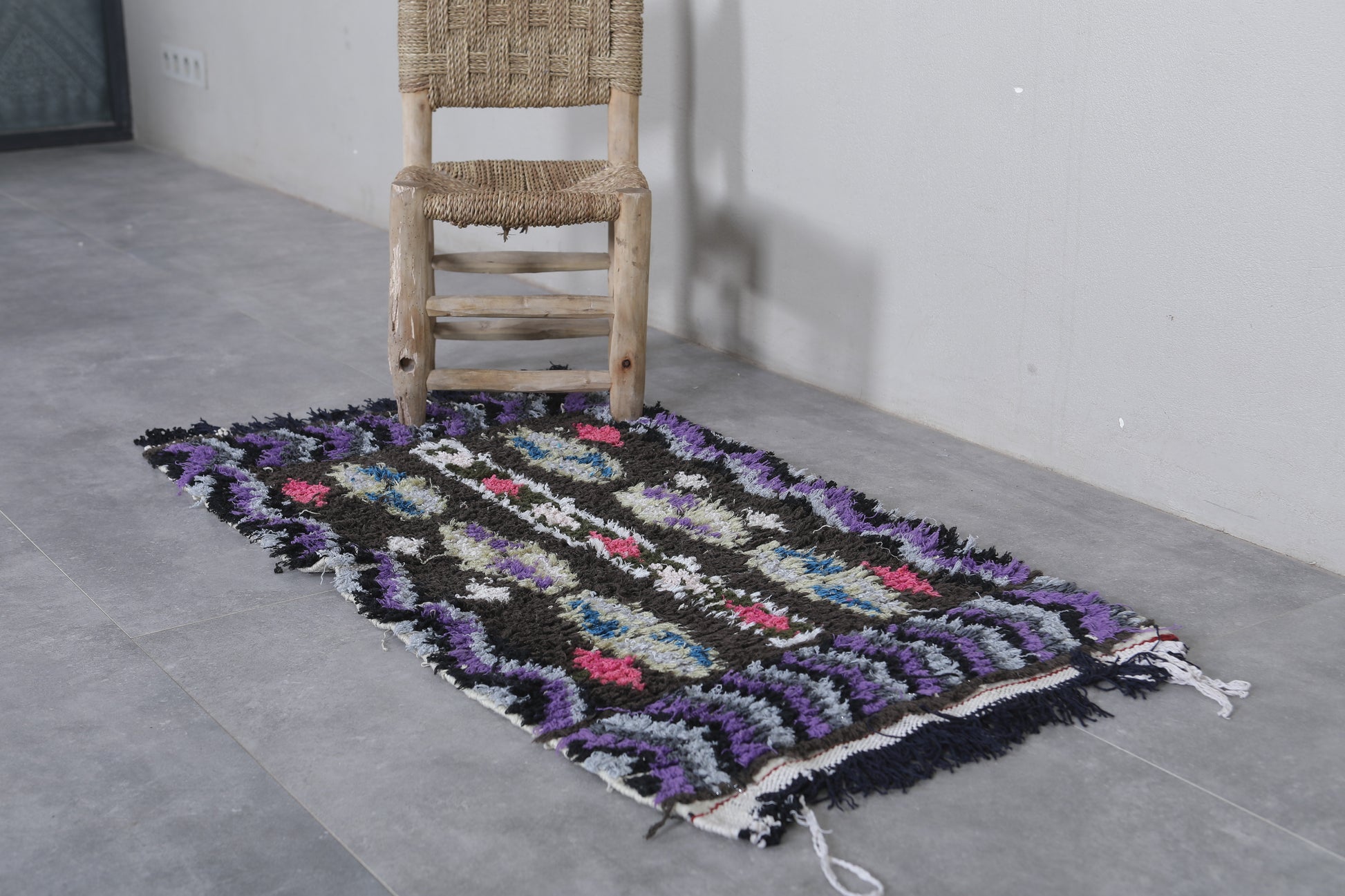 Make a bold statement with this Vintage Handmade Berber Runner Rug, measuring 2 x 3.6 feet. Handcrafted in Morocco, this small yet striking rug showcases traditional Berber artistry with vibrant accents of pink, white, and blue set against a deep black and purple base. Perfect for adding character to entryways, bedside areas, or cozy reading nooks, this rug blends cultural heritage with eye-catching design.