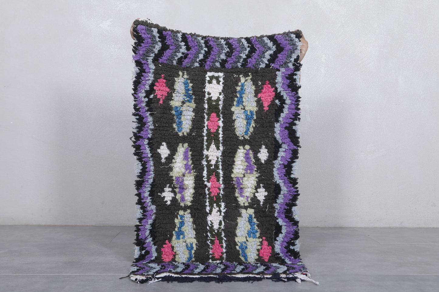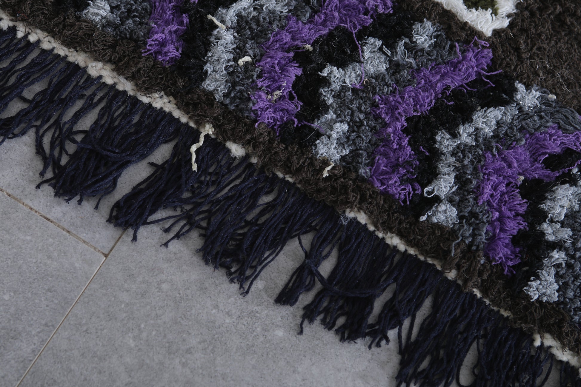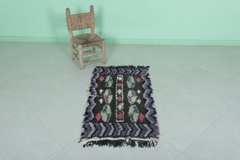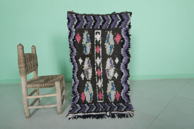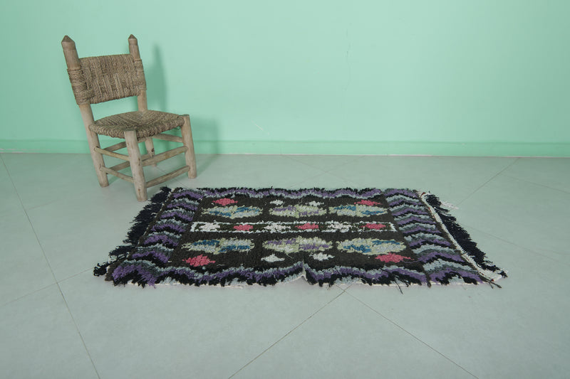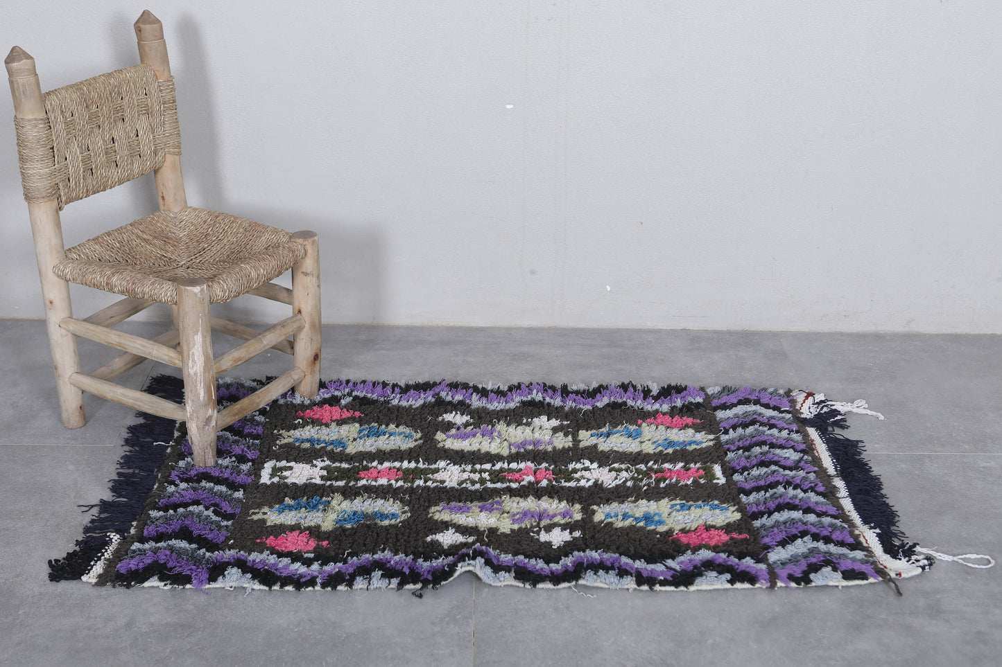 Make a bold statement with this Vintage Handmade Berber Runner Rug, measuring 2 x 3.6 feet. Handcrafted in Morocco, this small yet striking rug showcases traditional Berber artistry with vibrant accents of pink, white, and blue set against a deep black and purple base. Perfect for adding character to entryways, bedside areas, or cozy reading nooks, this rug blends cultural heritage with eye-catching design.