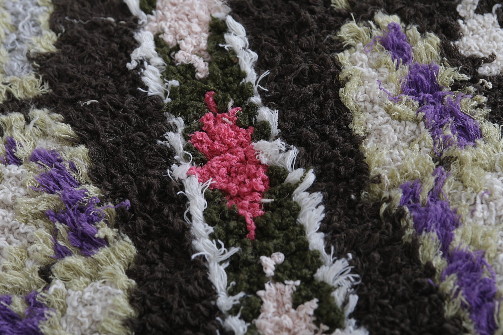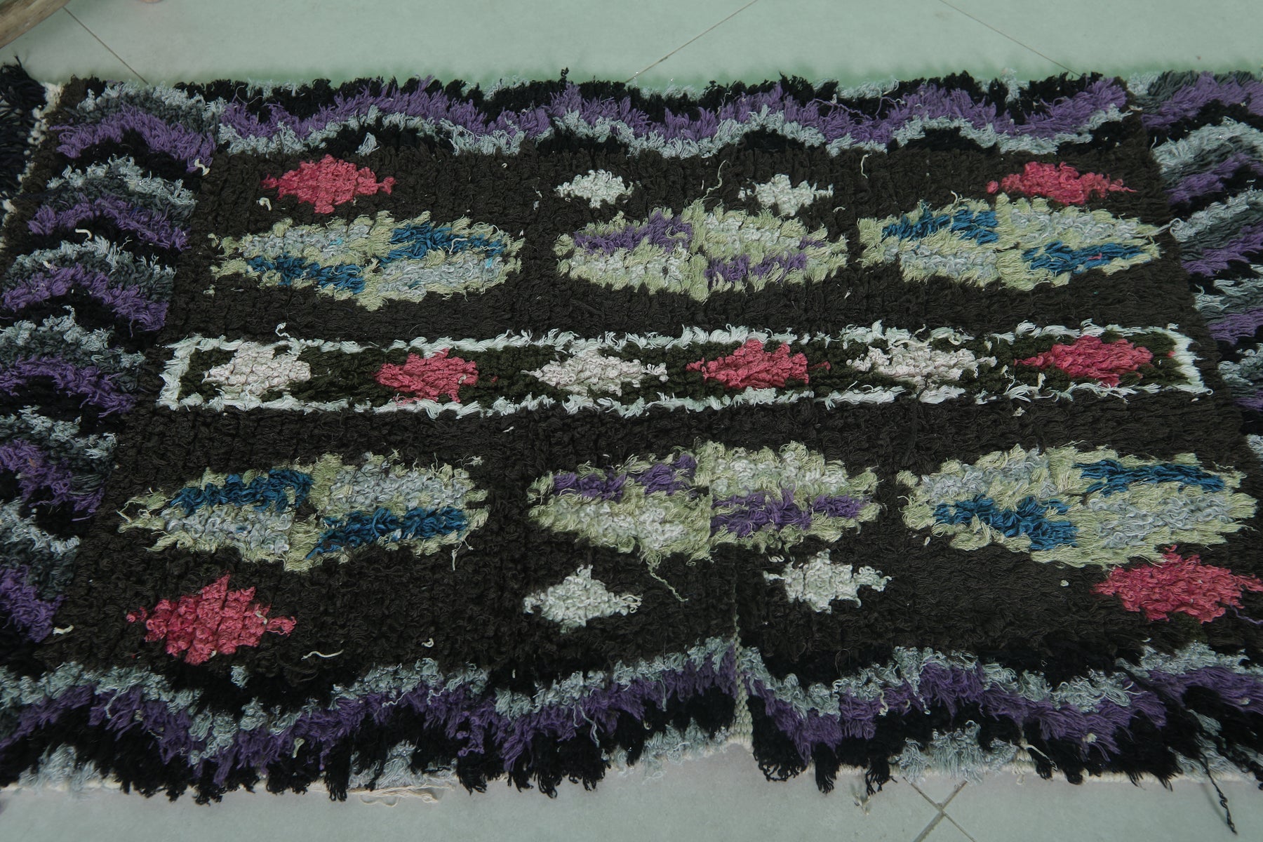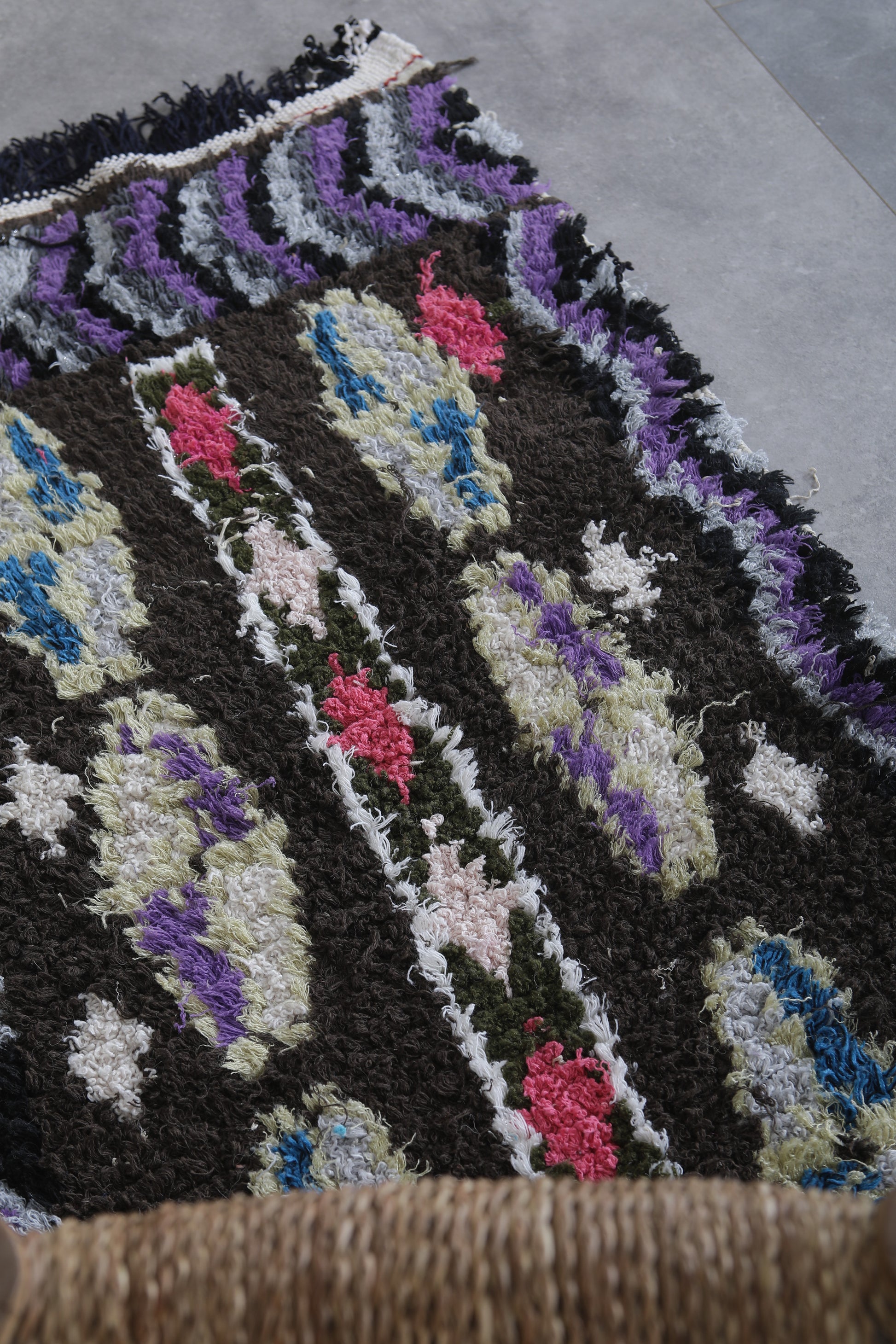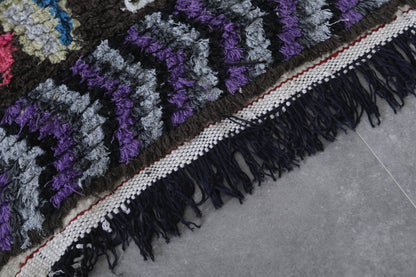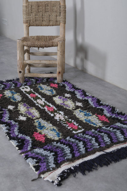 Make a bold statement with this Vintage Handmade Berber Runner Rug, measuring 2 x 3.6 feet. Handcrafted in Morocco, this small yet striking rug showcases traditional Berber artistry with vibrant accents of pink, white, and blue set against a deep black and purple base. Perfect for adding character to entryways, bedside areas, or cozy reading nooks, this rug blends cultural heritage with eye-catching design.