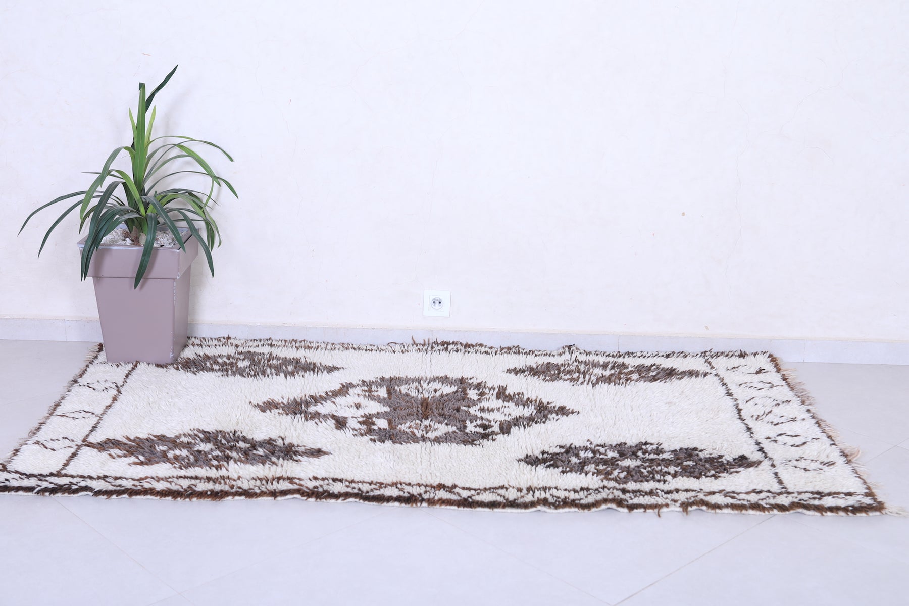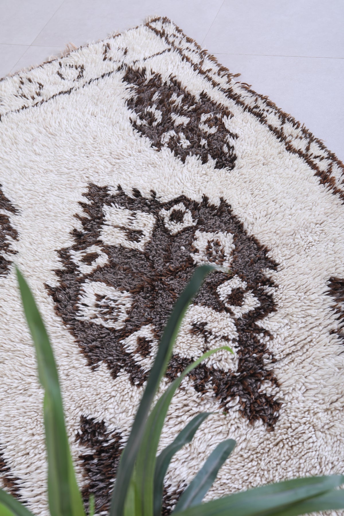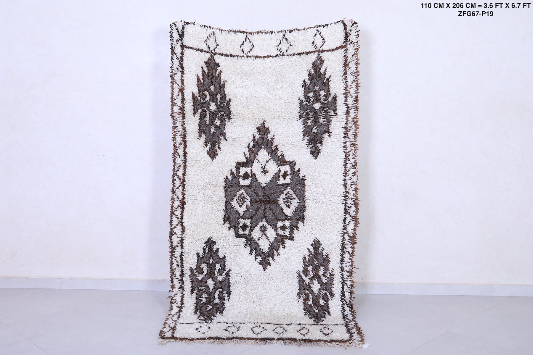 Experience the charm of tradition with this Vintage Handmade Moroccan Berber Runner Rug, measuring 3.6 FT x 6.7 FT. Adorned with bold tribal medallions in deep brown on an ivory wool base, this artisan-crafted piece brings authentic Moroccan elegance to hallways, living rooms, or bohemian interiors.
