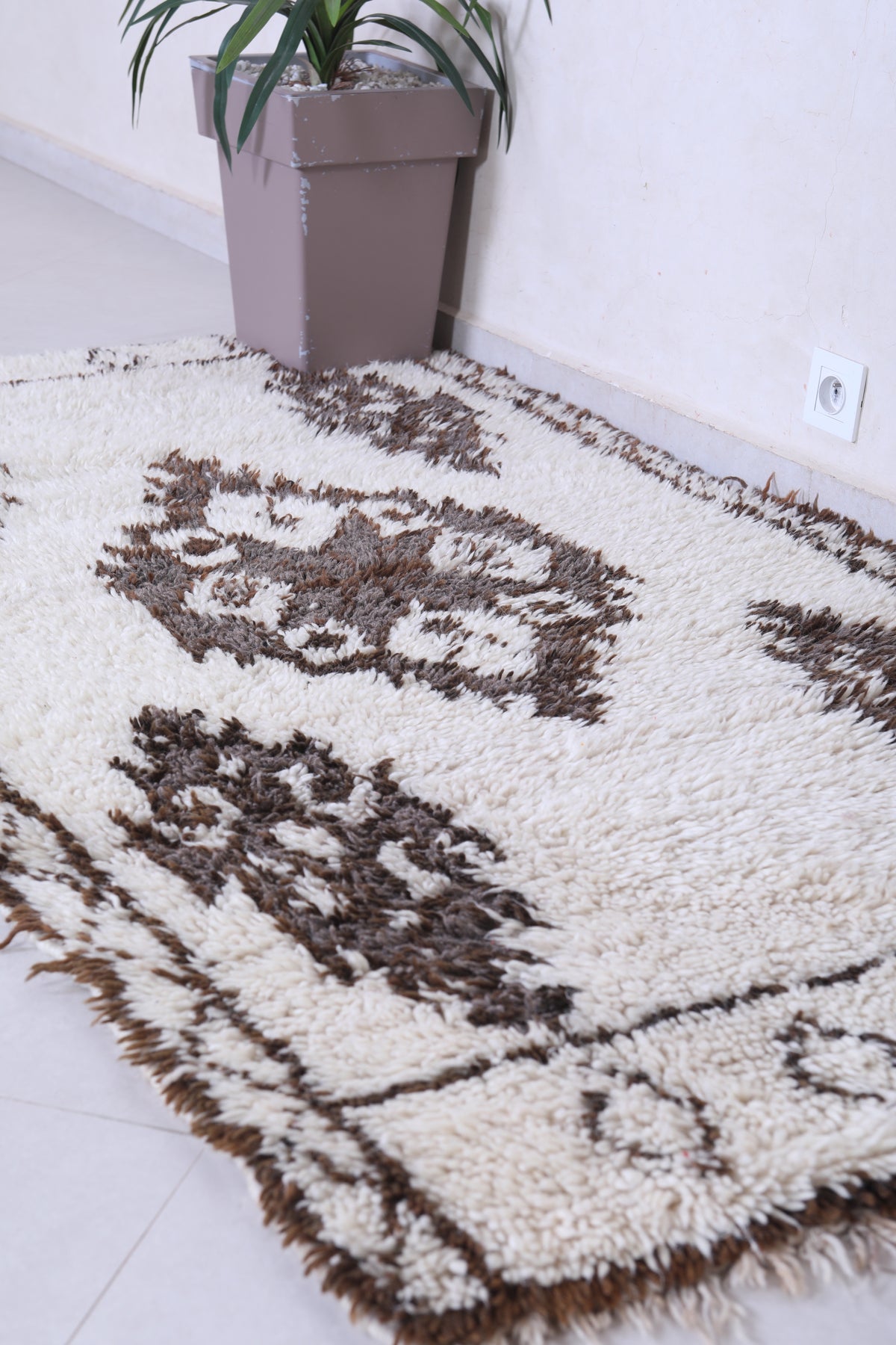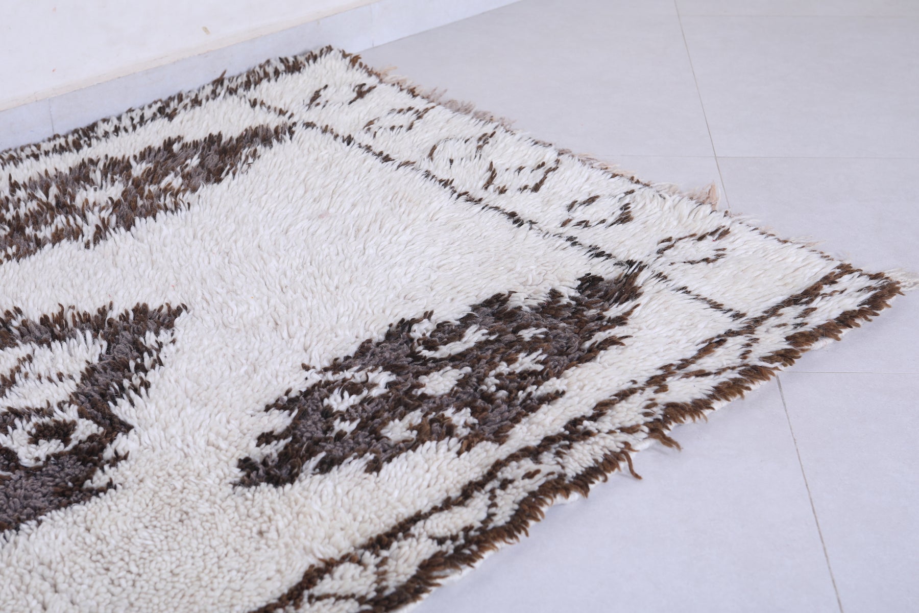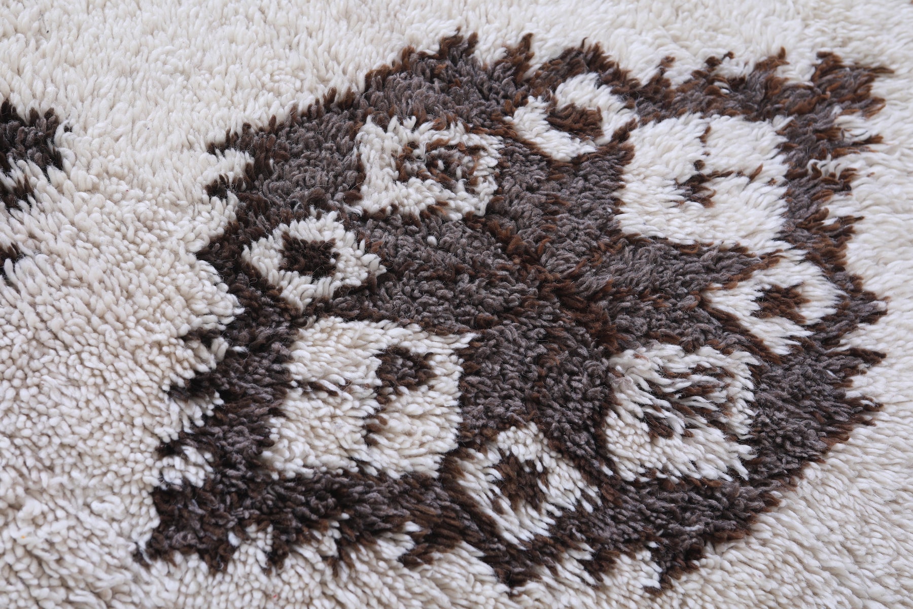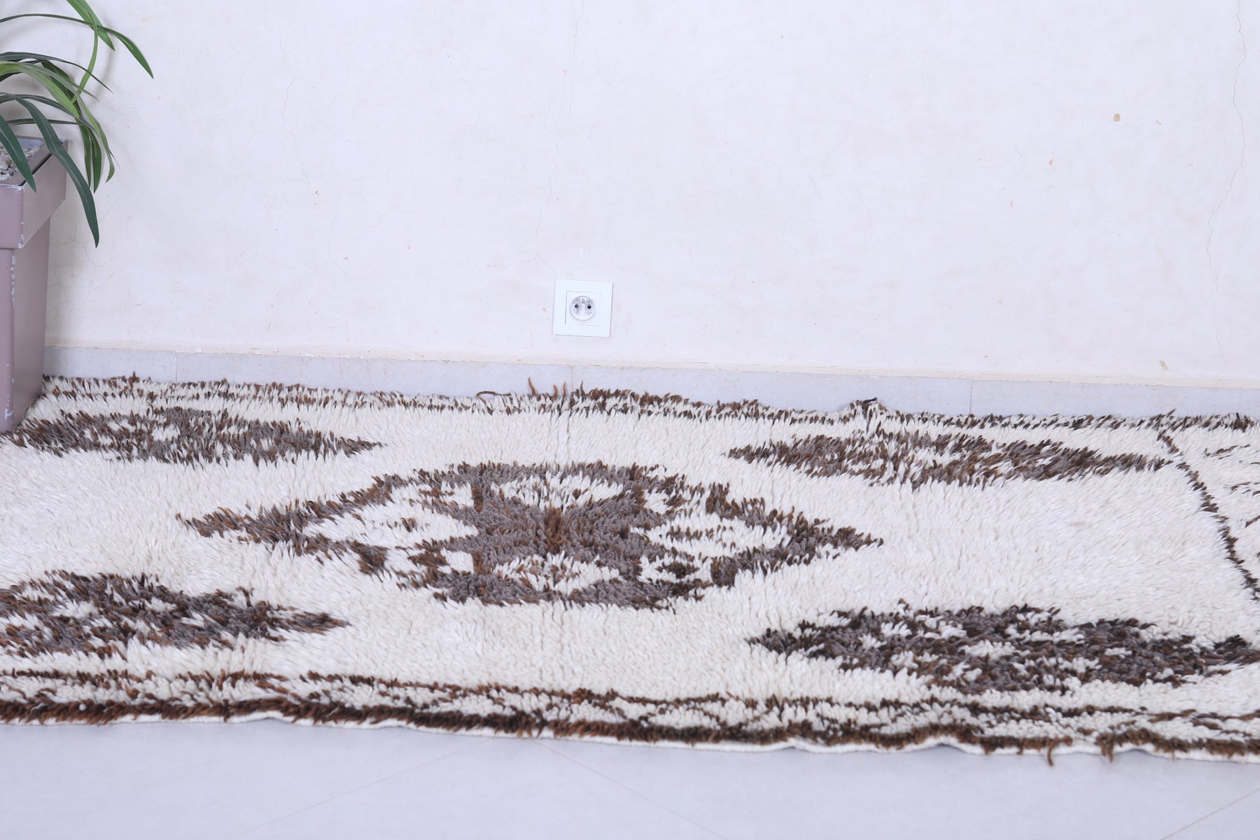 Experience the charm of tradition with this Vintage Handmade Moroccan Berber Runner Rug, measuring 3.6 FT x 6.7 FT. Adorned with bold tribal medallions in deep brown on an ivory wool base, this artisan-crafted piece brings authentic Moroccan elegance to hallways, living rooms, or bohemian interiors.