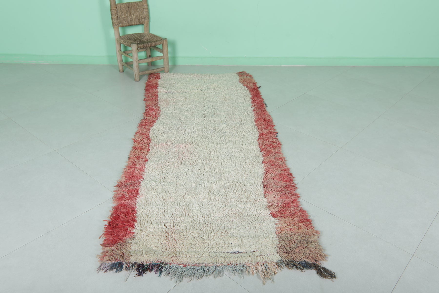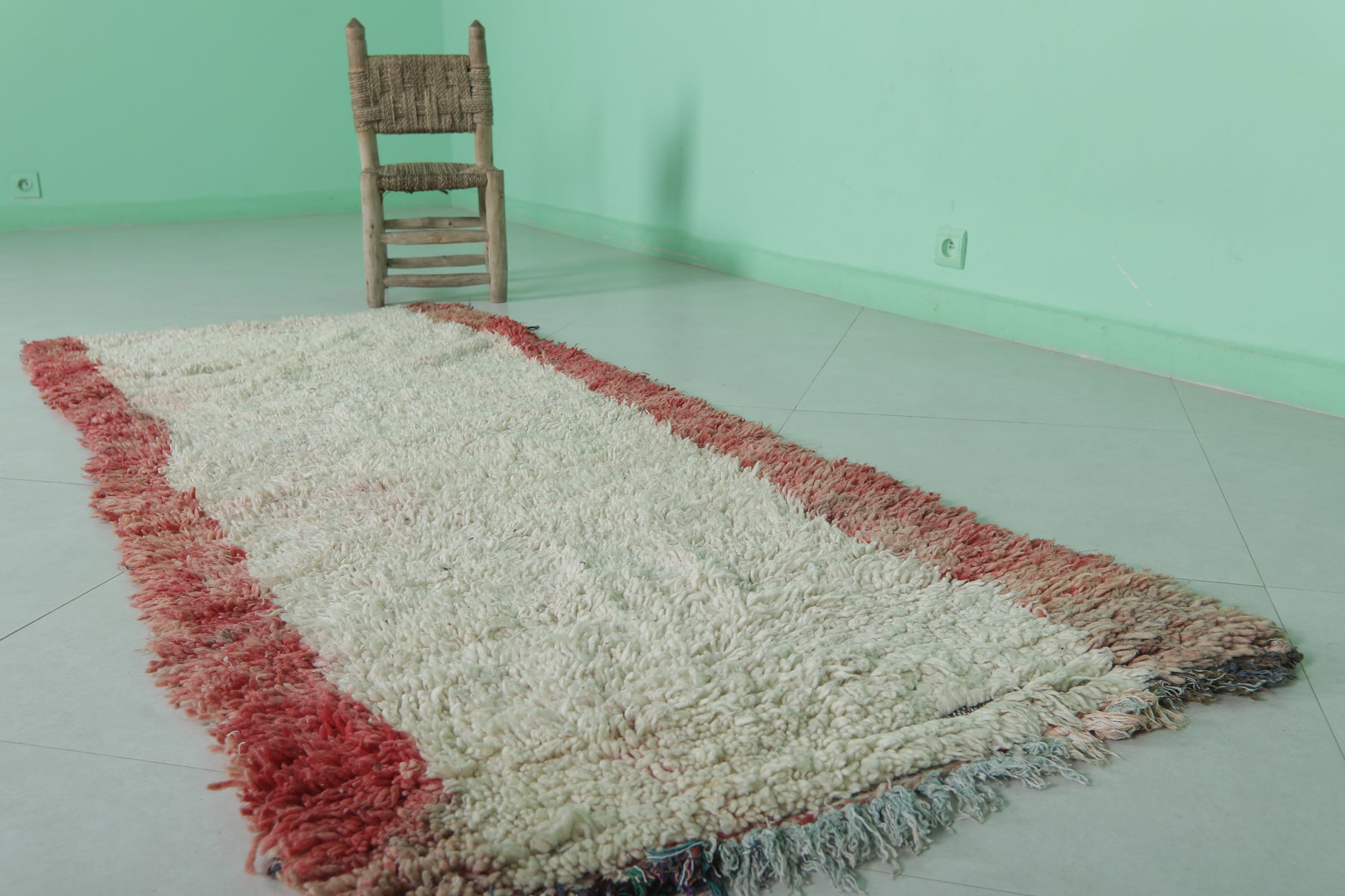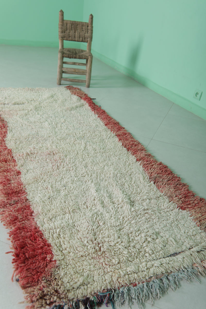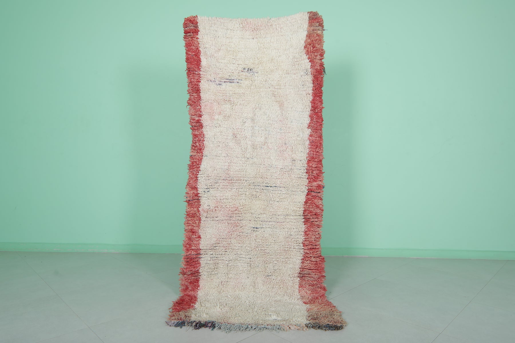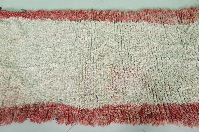 Keep it classic with a twist using this Vintage Handmade Runner Rug (2.8 x 7 FT), featuring a minimalist ivory base framed by bold, fuzzy borders in coral red and charcoal.