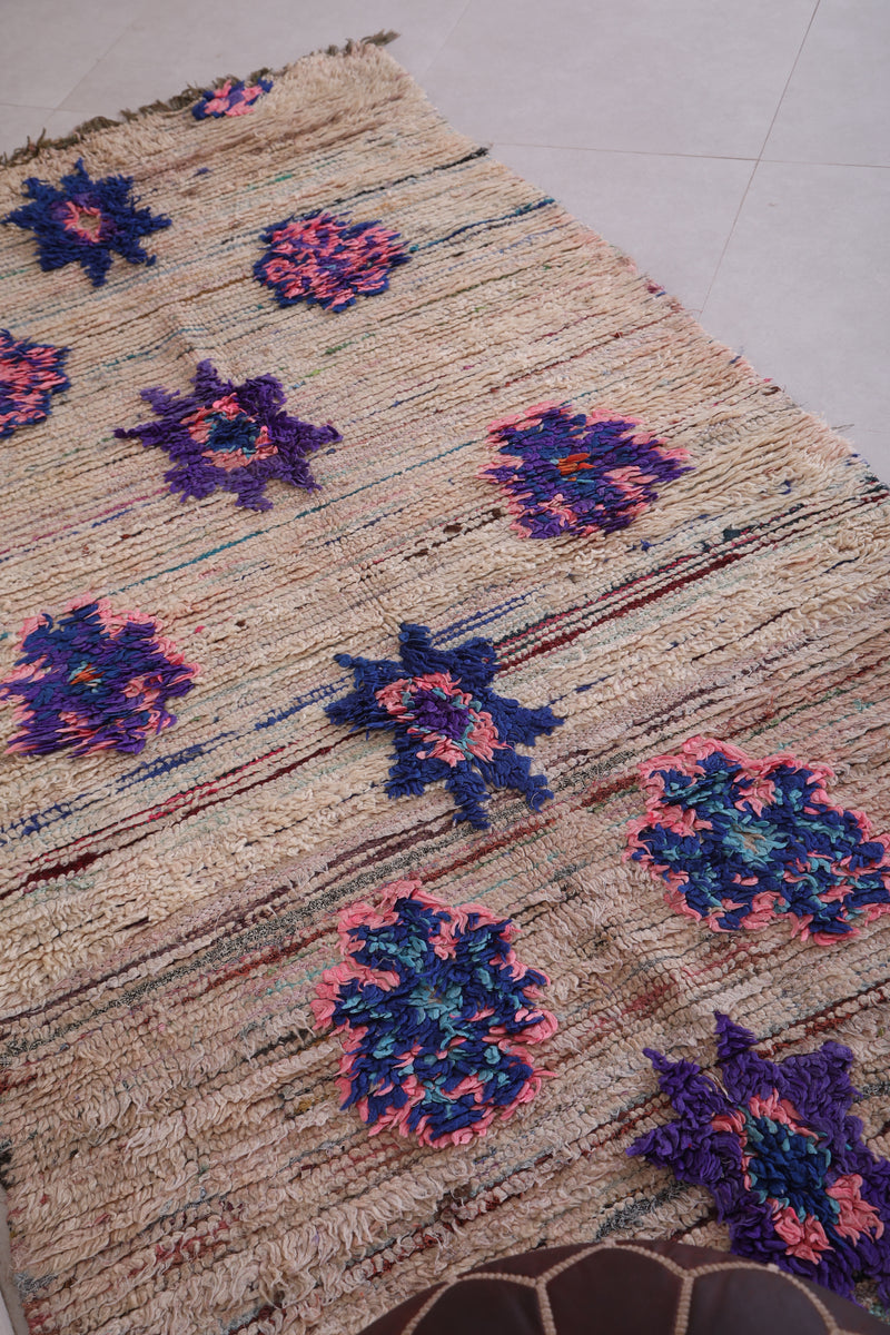 Add charm and character to your space with this Vintage Handmade Runner Rug (3.9 x 5.6 FT), featuring playful floral motifs in rich purples and pinks against a soft neutral base.