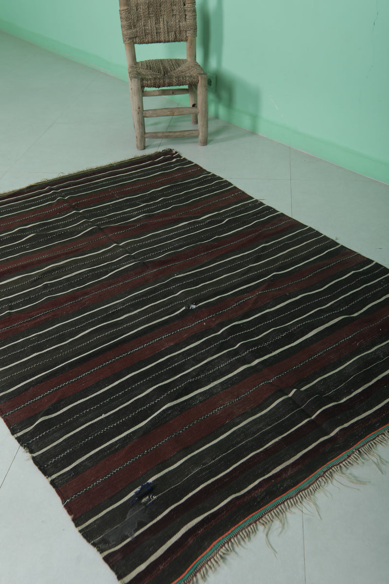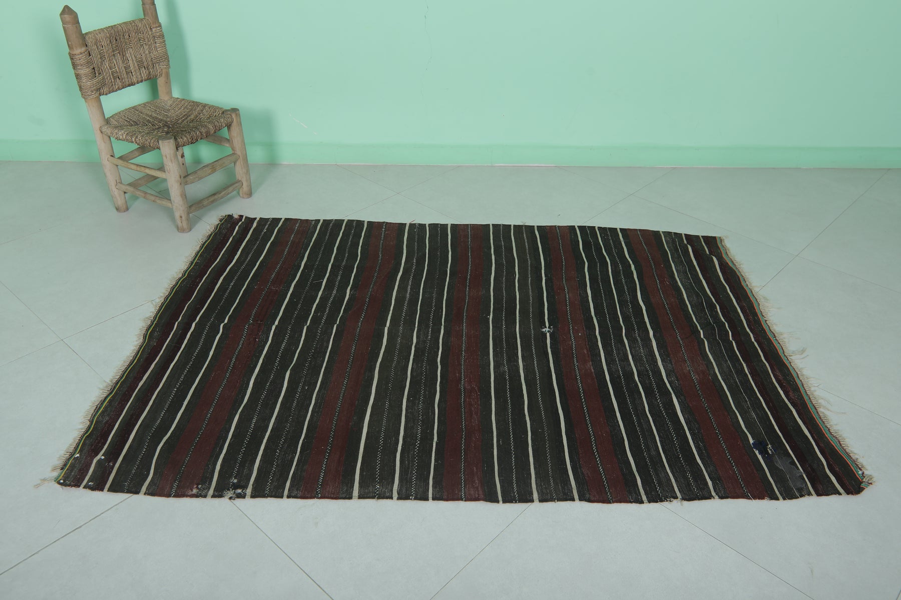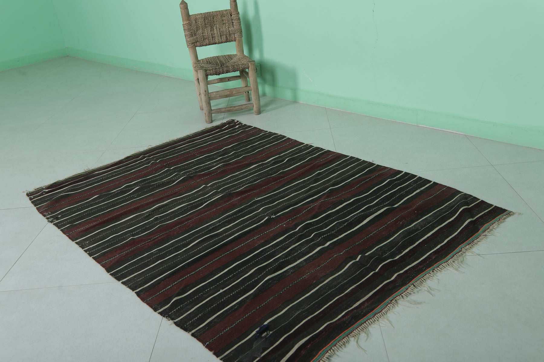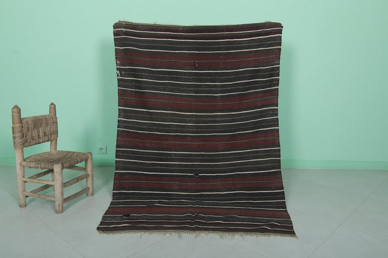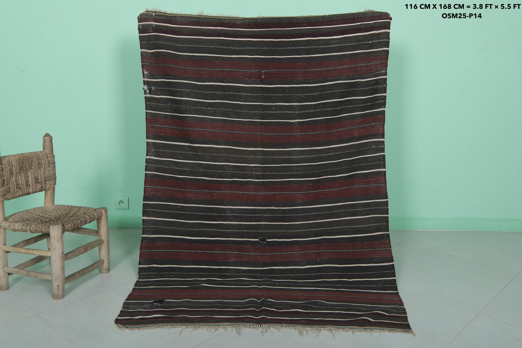 This 3.8 x 5.5 feet Vintage Handwoven Kilim Rug features rich black and red tones accented with intricate striped patterns, showcasing exceptional Moroccan craftsmanship. With its soft texture and durable weave, this kilim is ideal for high-traffic areas, living rooms, or as a striking statement piece.