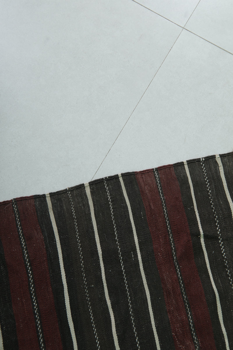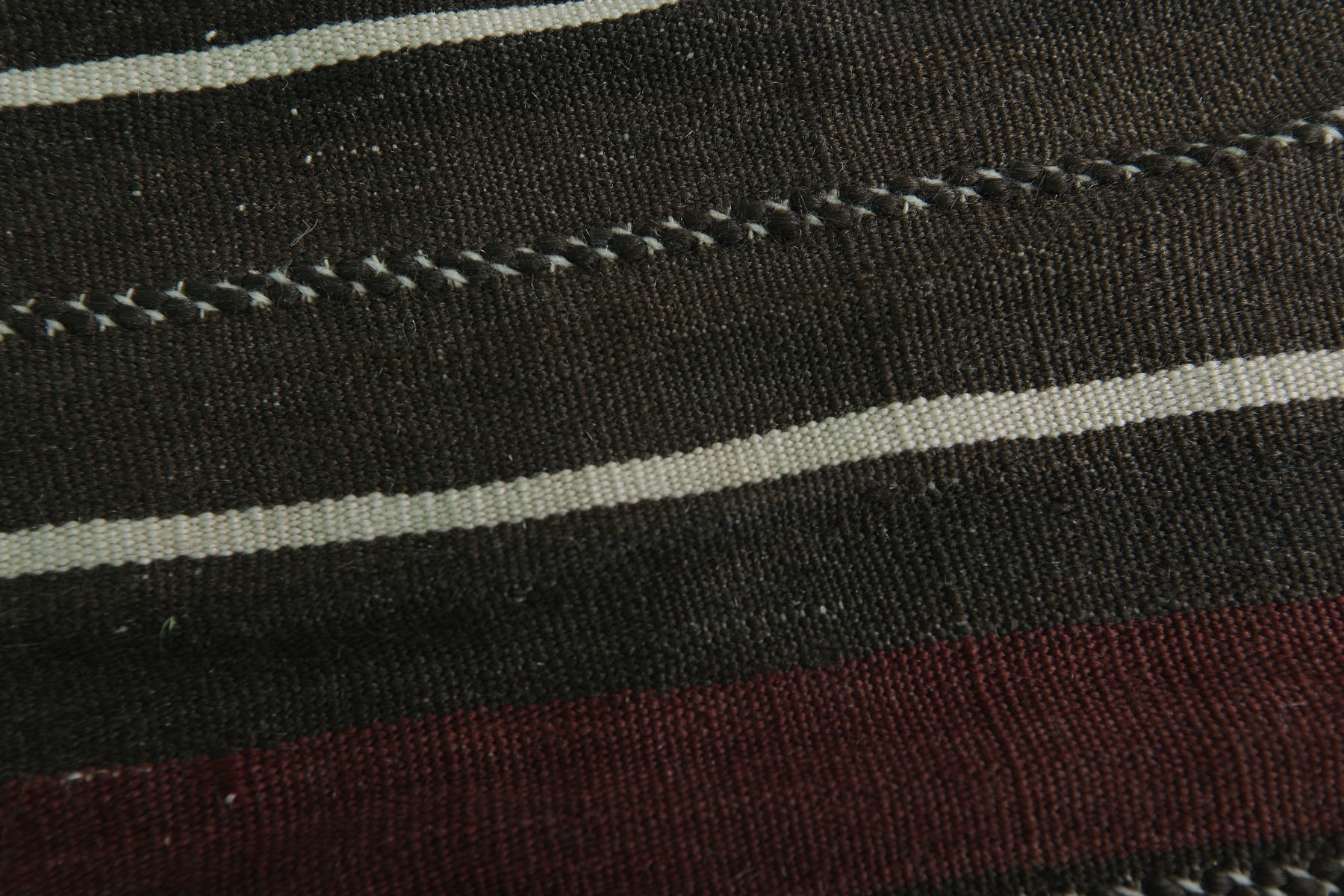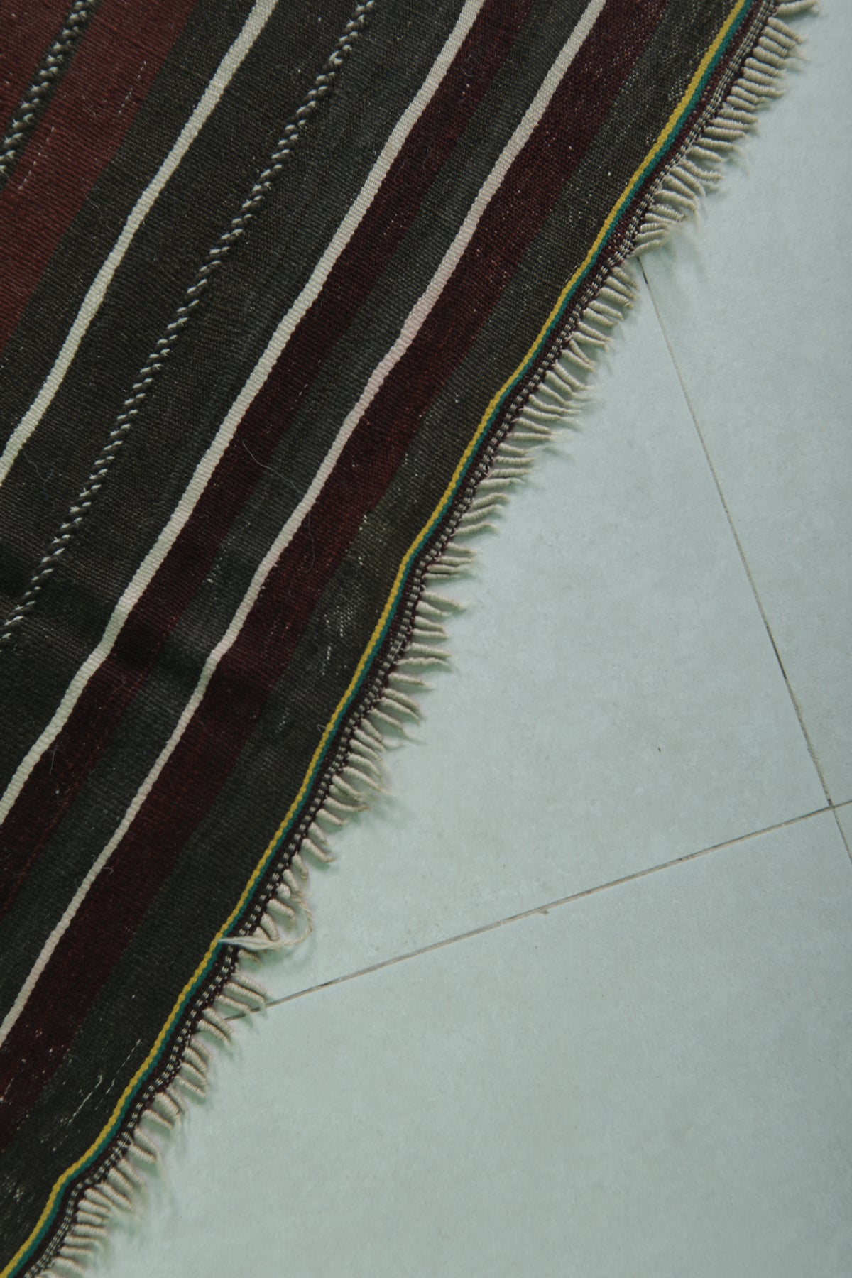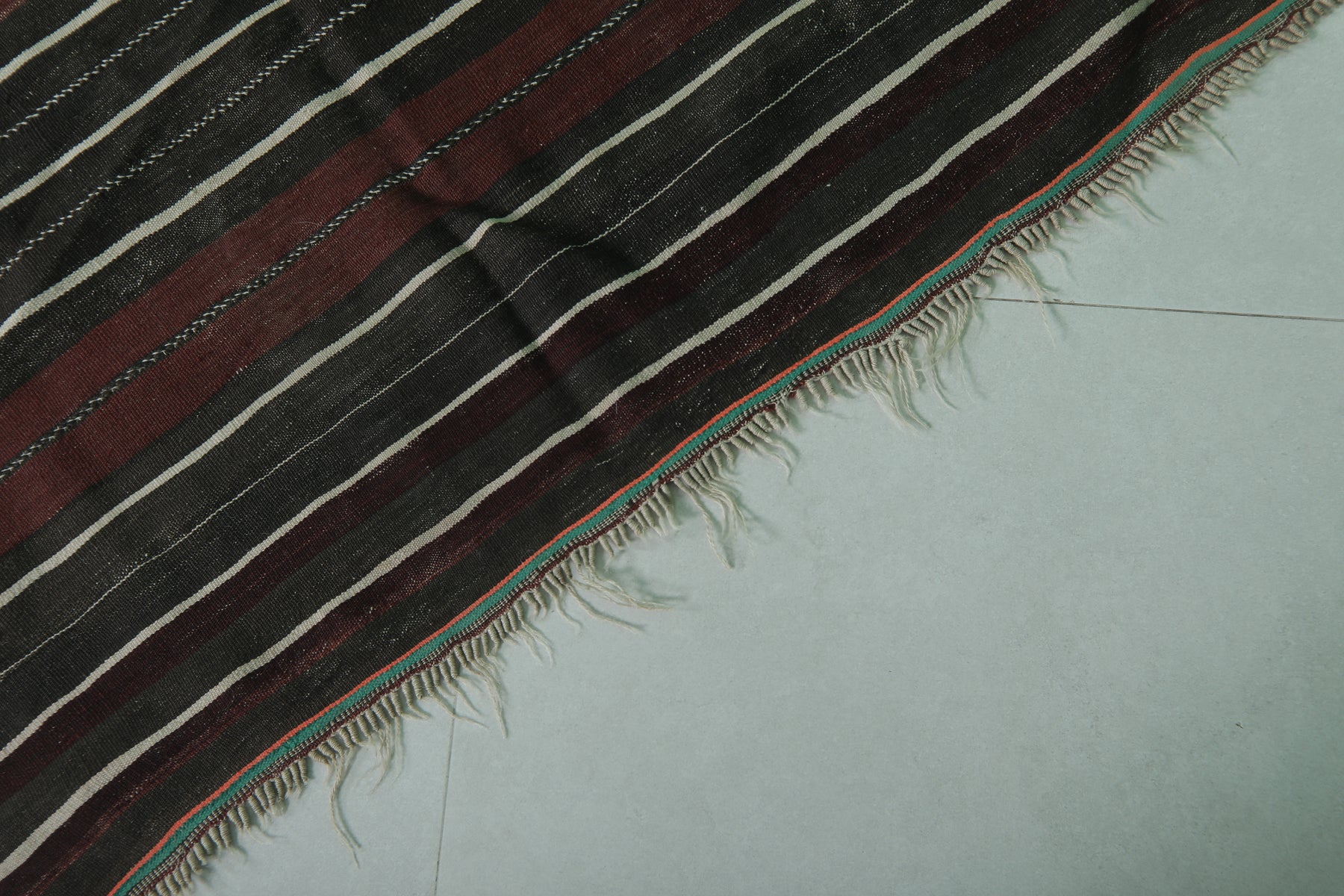 This 3.8 x 5.5 feet Vintage Handwoven Kilim Rug features rich black and red tones accented with intricate striped patterns, showcasing exceptional Moroccan craftsmanship. With its soft texture and durable weave, this kilim is ideal for high-traffic areas, living rooms, or as a striking statement piece.