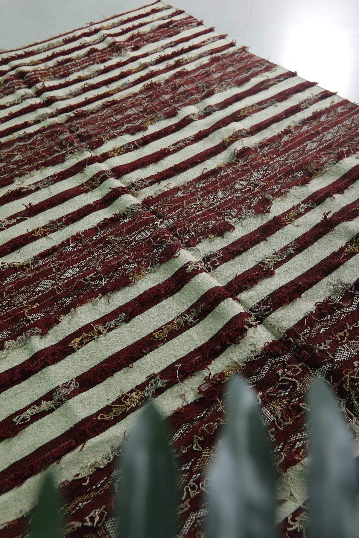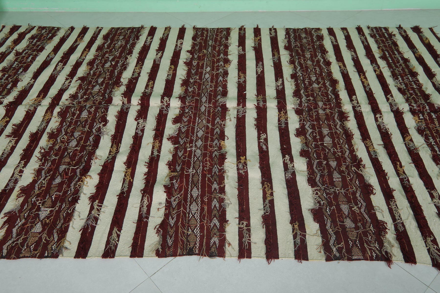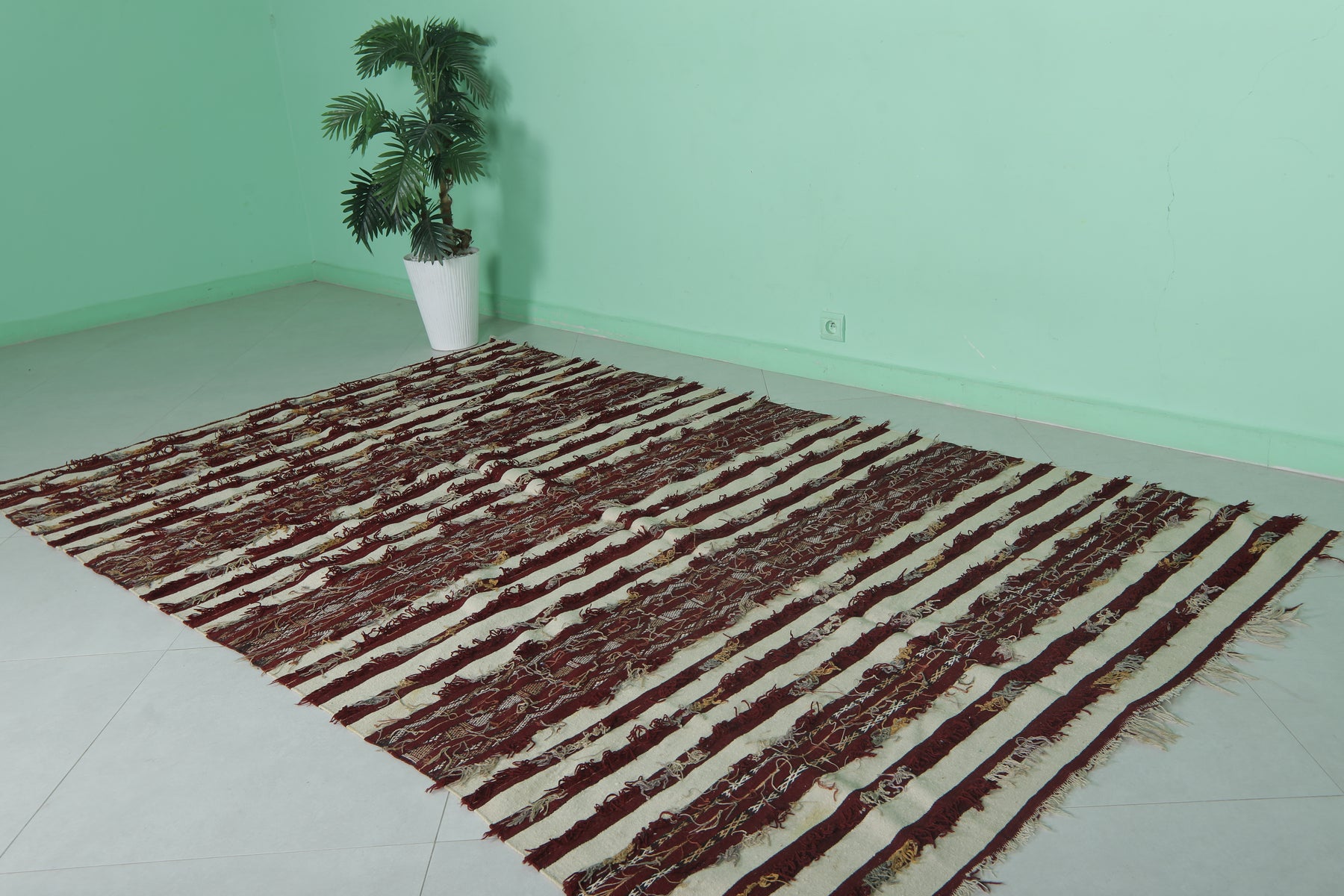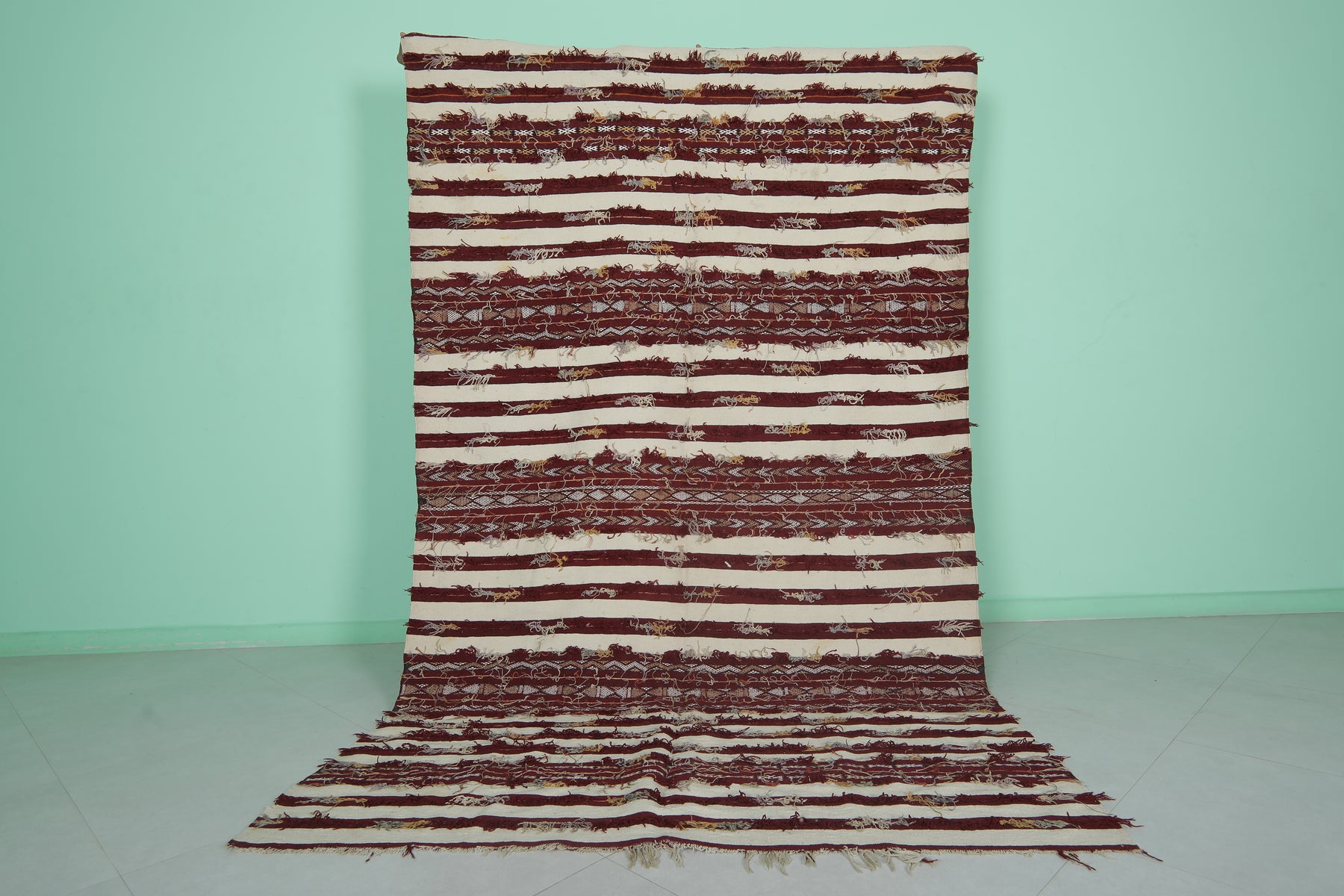 This 5.3 FT x 8.8 FT Vintage Handwoven Kilim Rug brings traditional Moroccan charm to your space with bold stripes and earthy textures. Handcrafted by skilled artisans, it blends time-honored design with modern versatility.