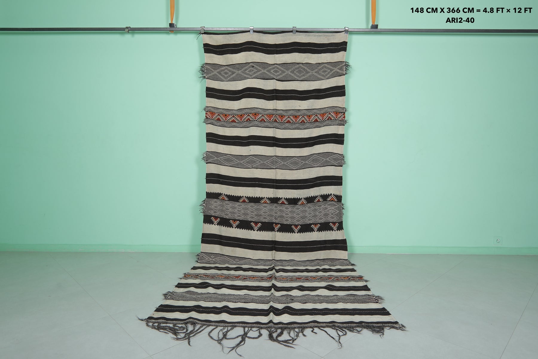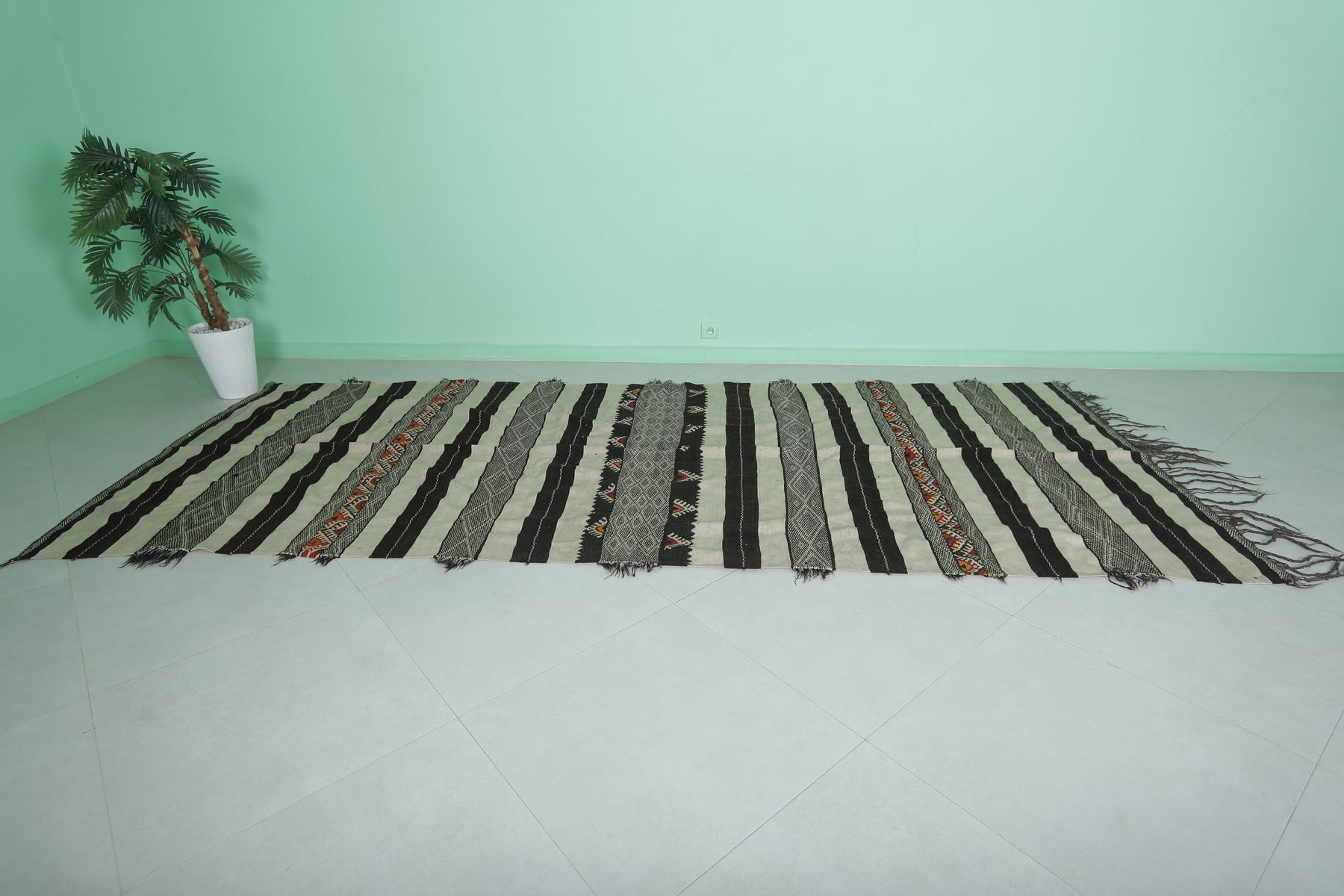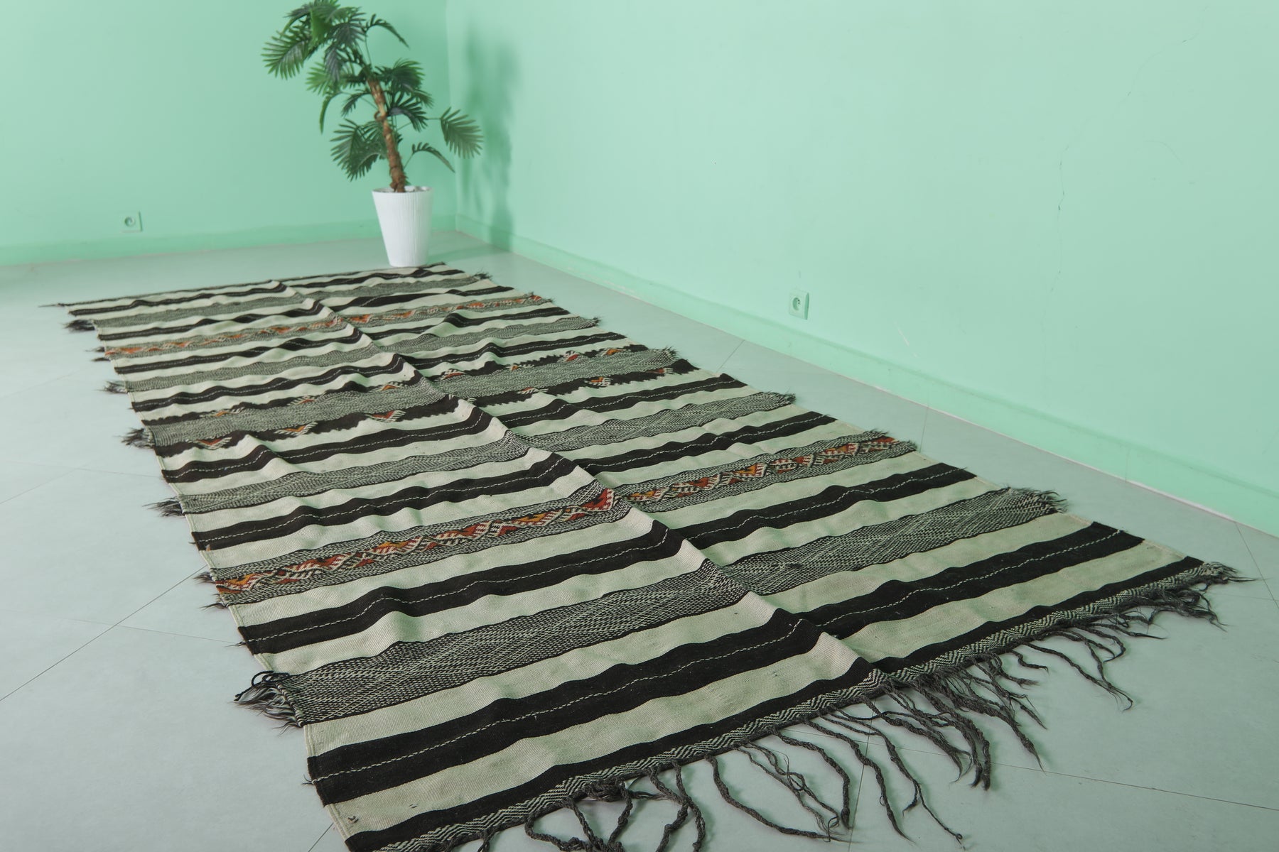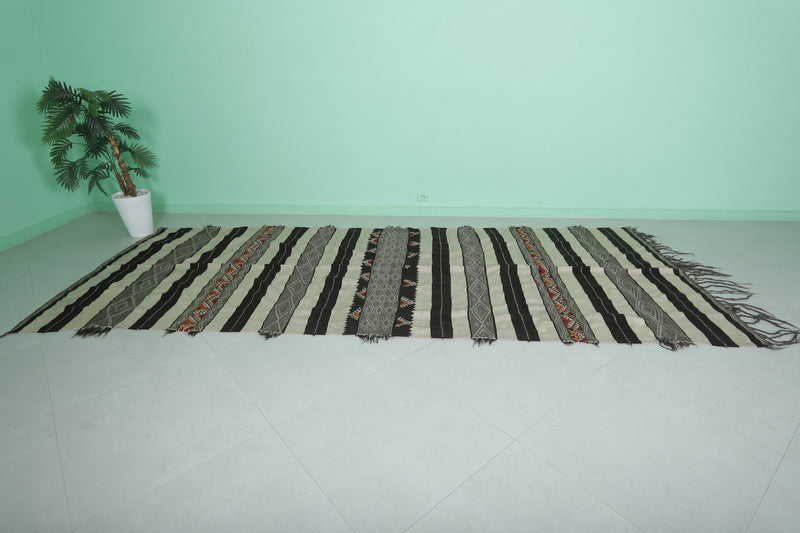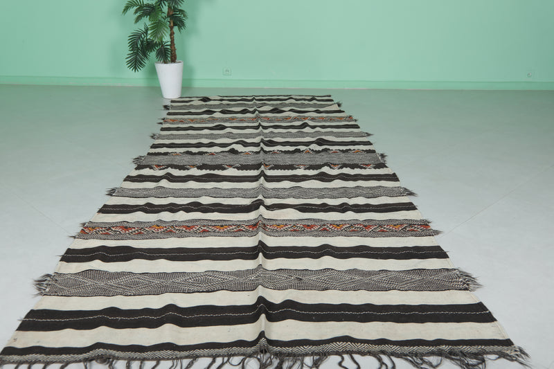 This 4.8 x 12 feet Vintage Handwoven Moroccan Hallway Kilim features bold black and cream stripes interwoven with intricate tribal patterns and vibrant accents, blending traditional craftsmanship with striking design. Handwoven from premium wool, it offers exceptional durability and softness, making it ideal for hallways, long spaces, or as a statement rug.