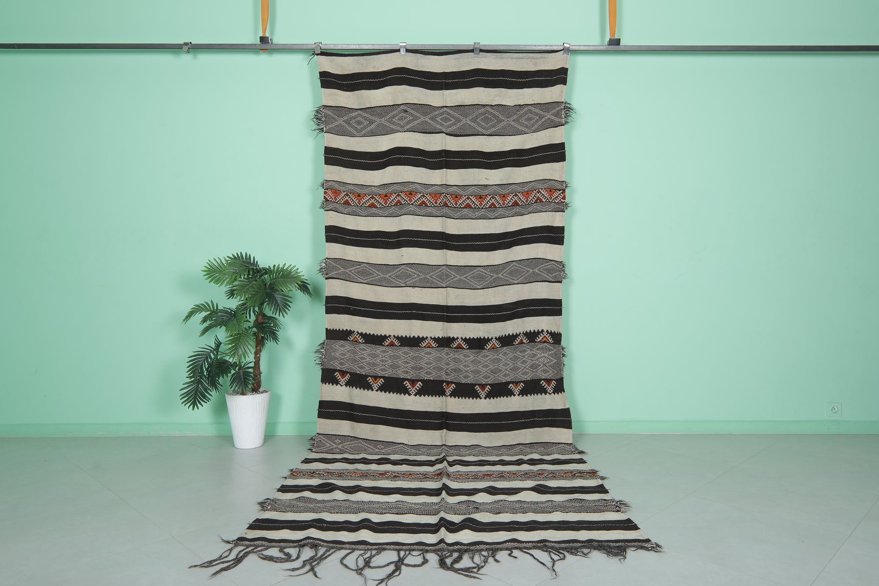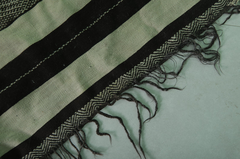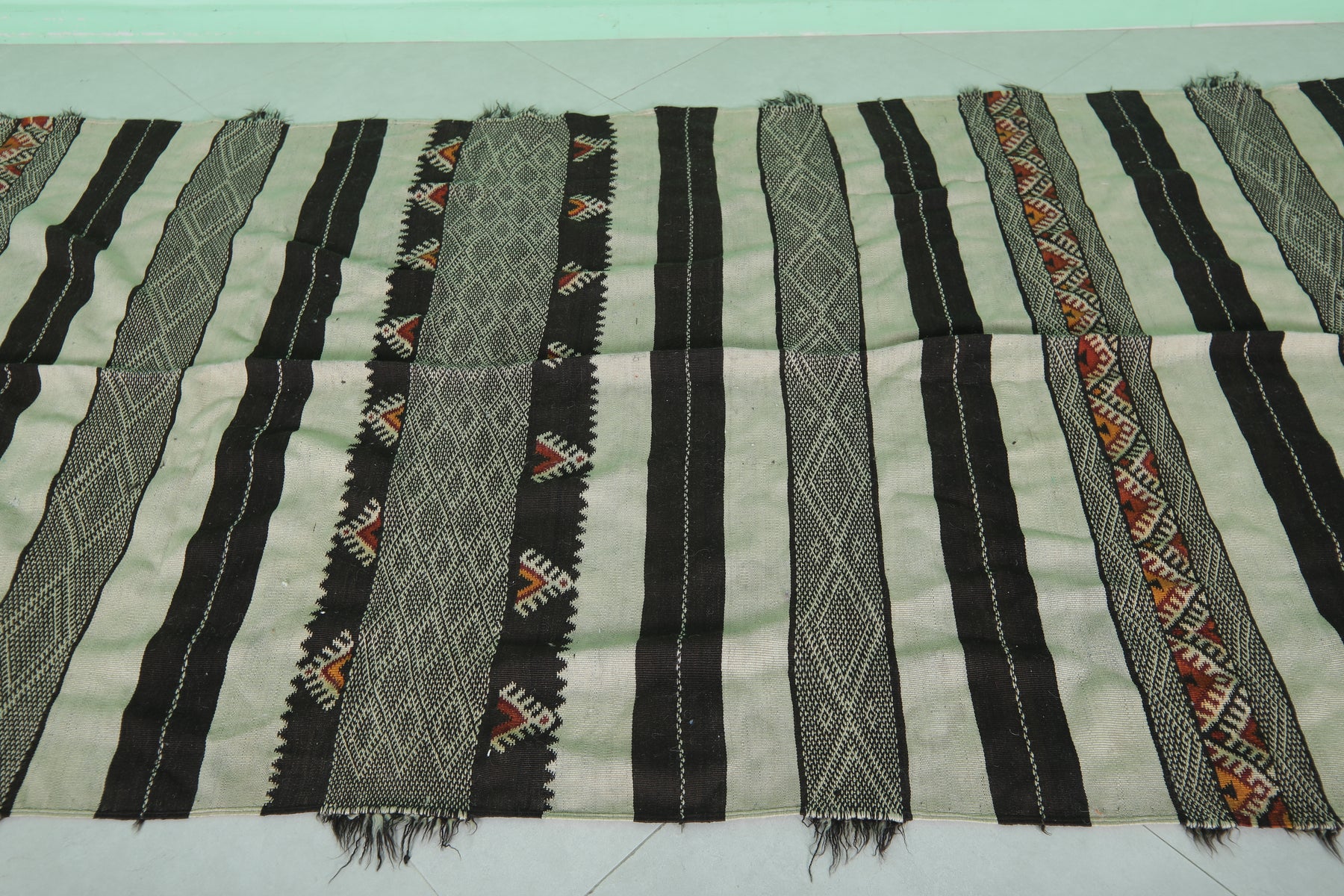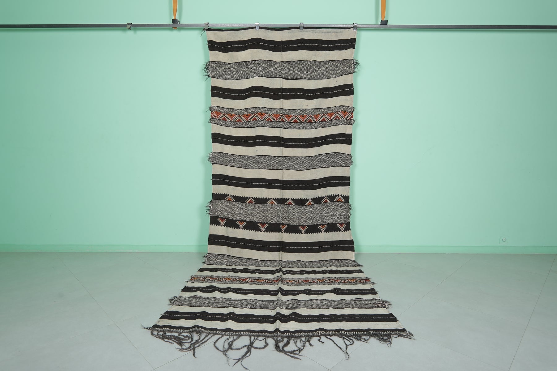 This 4.8 x 12 feet Vintage Handwoven Moroccan Hallway Kilim features bold black and cream stripes interwoven with intricate tribal patterns and vibrant accents, blending traditional craftsmanship with striking design. Handwoven from premium wool, it offers exceptional durability and softness, making it ideal for hallways, long spaces, or as a statement rug.