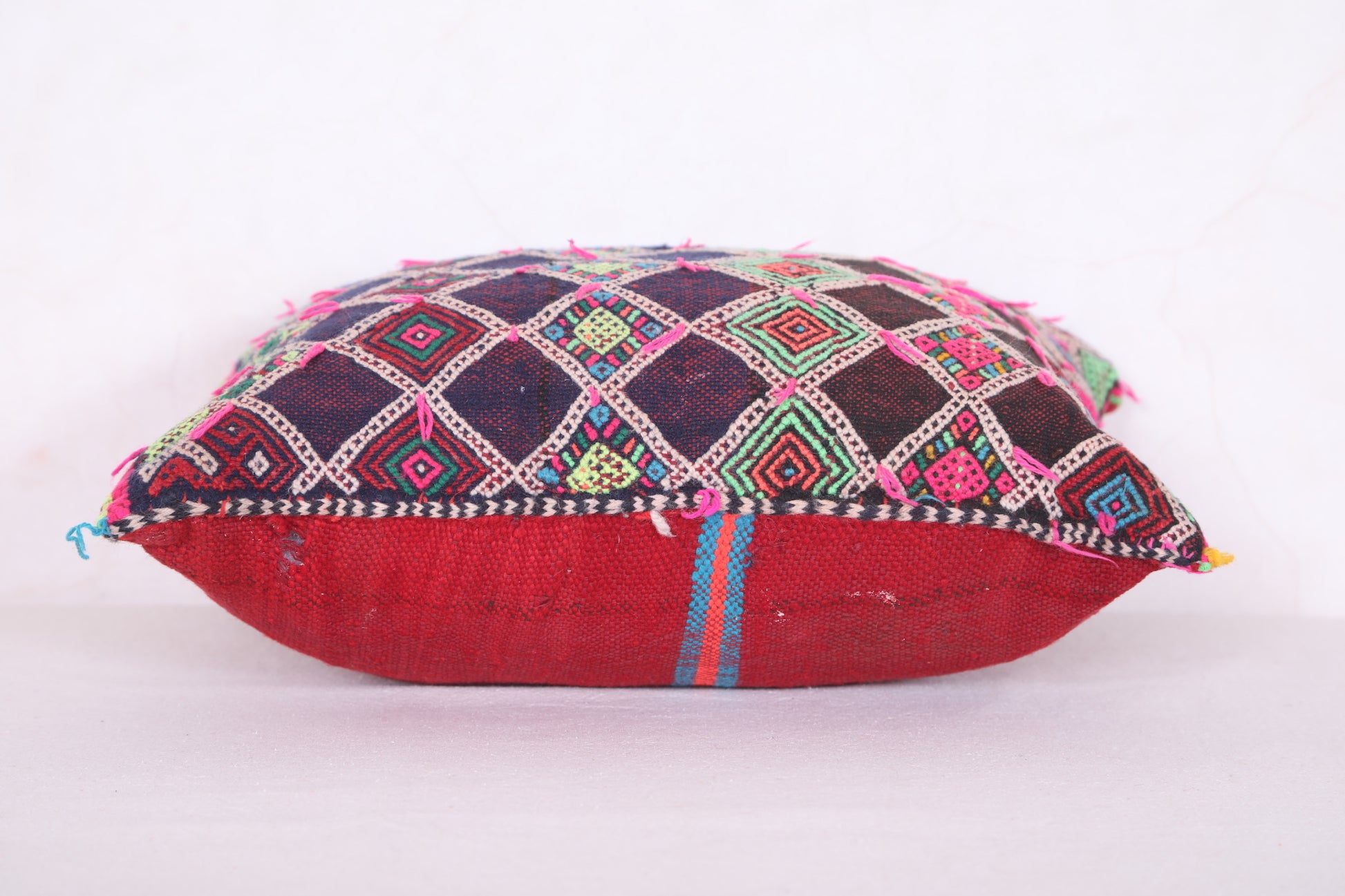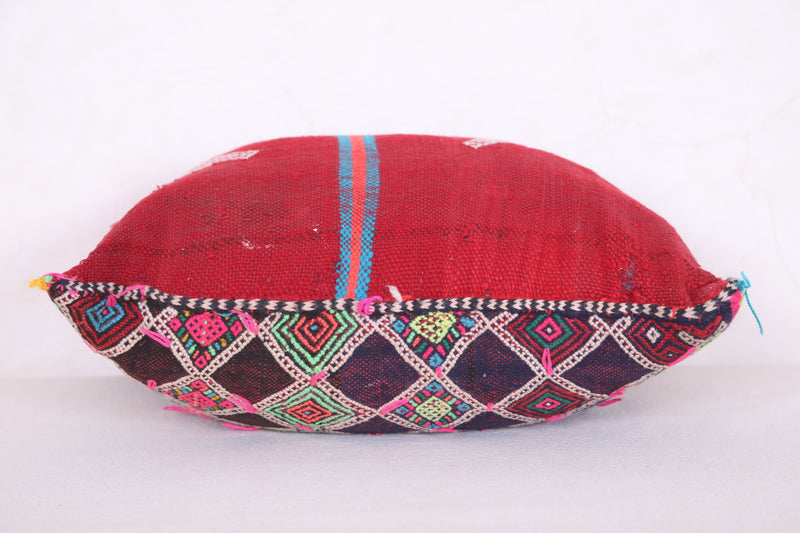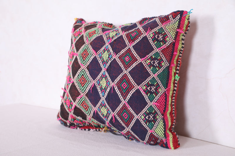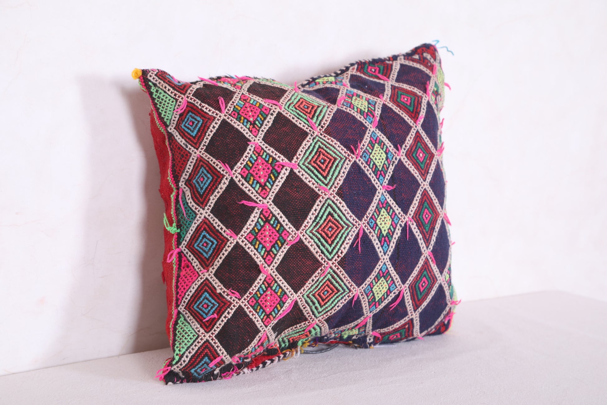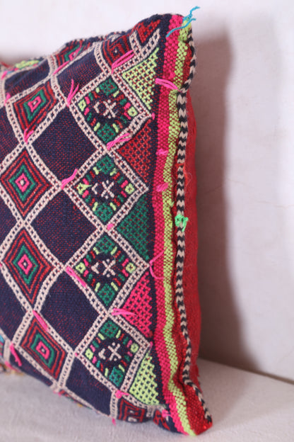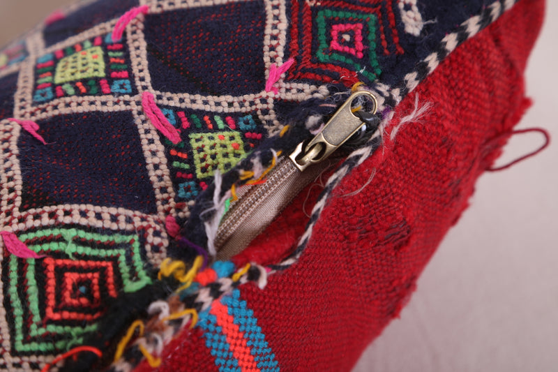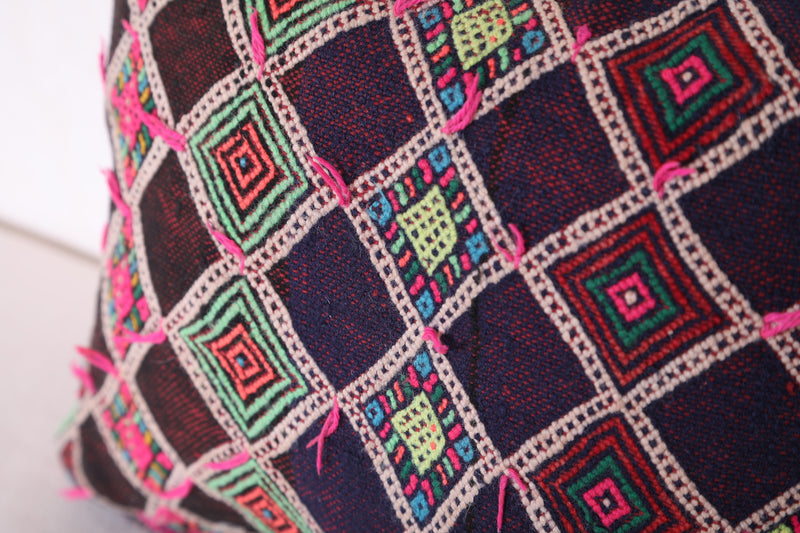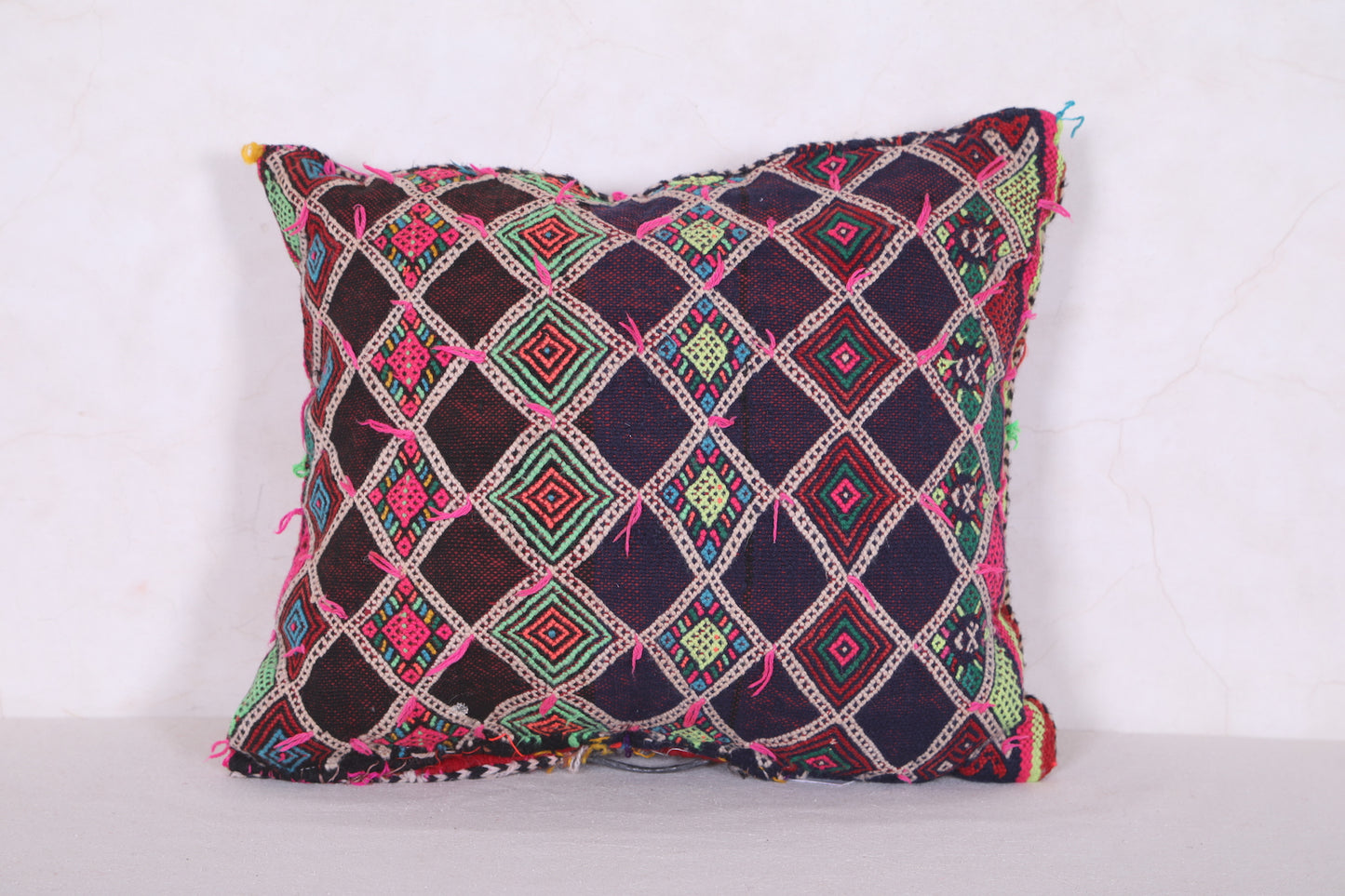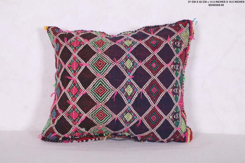 Add authentic Moroccan artistry to your home with this handcrafted Vintage Kilim Moroccan Pillow, sized at 14.5 x 16.5 inches (37 CM x 42 CM). Featuring intricate diamond patterns in vibrant pink, green, and navy hues, this pillow blends traditional Berber craftsmanship with bold, bohemian flair. Perfect for accenting your sofa, bed, or favorite chair.