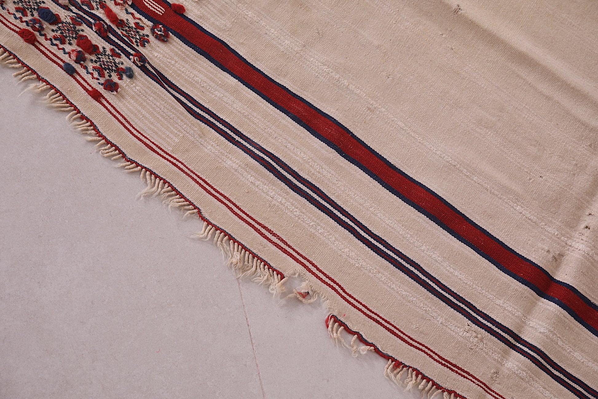 This 3.9 x 12.6 feet Moroccan rug blanket showcases handwoven elegance with a minimalistic ivory base, accented by intricate embroidered details in deep red and earthy tones. Blending tradition and functionality, this oversized piece serves beautifully as a runner or decorative throw for spacious interiors.