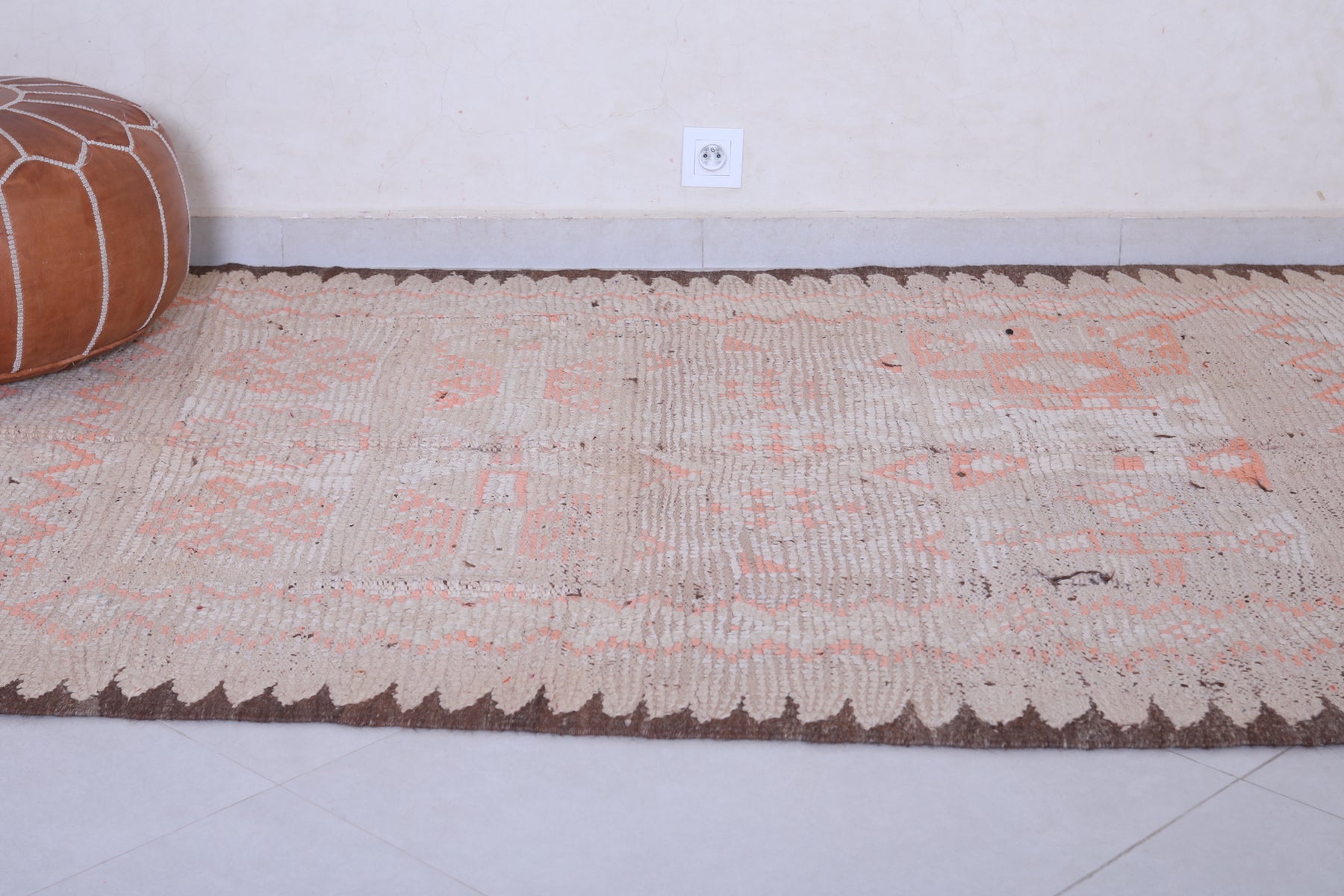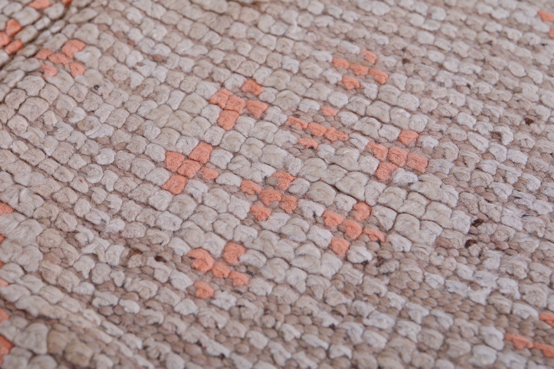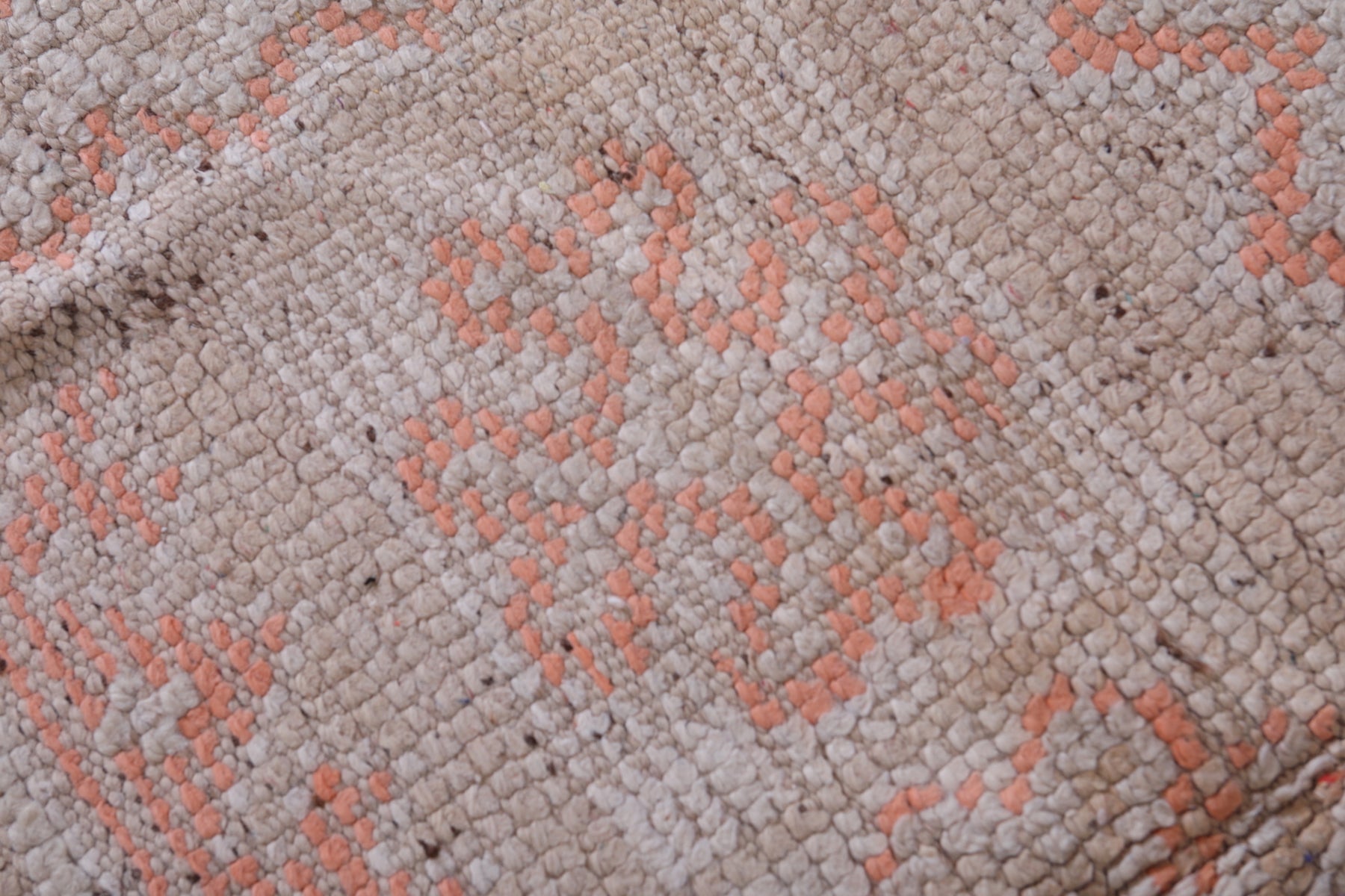 Elevate your home decor with this exquisite Vintage Moroccan Area Rug, featuring intricate geometric and floral patterns in soft peach and beige tones. Measuring 4.6 x 8.9 ft, this handwoven masterpiece exudes warmth and timeless elegance.