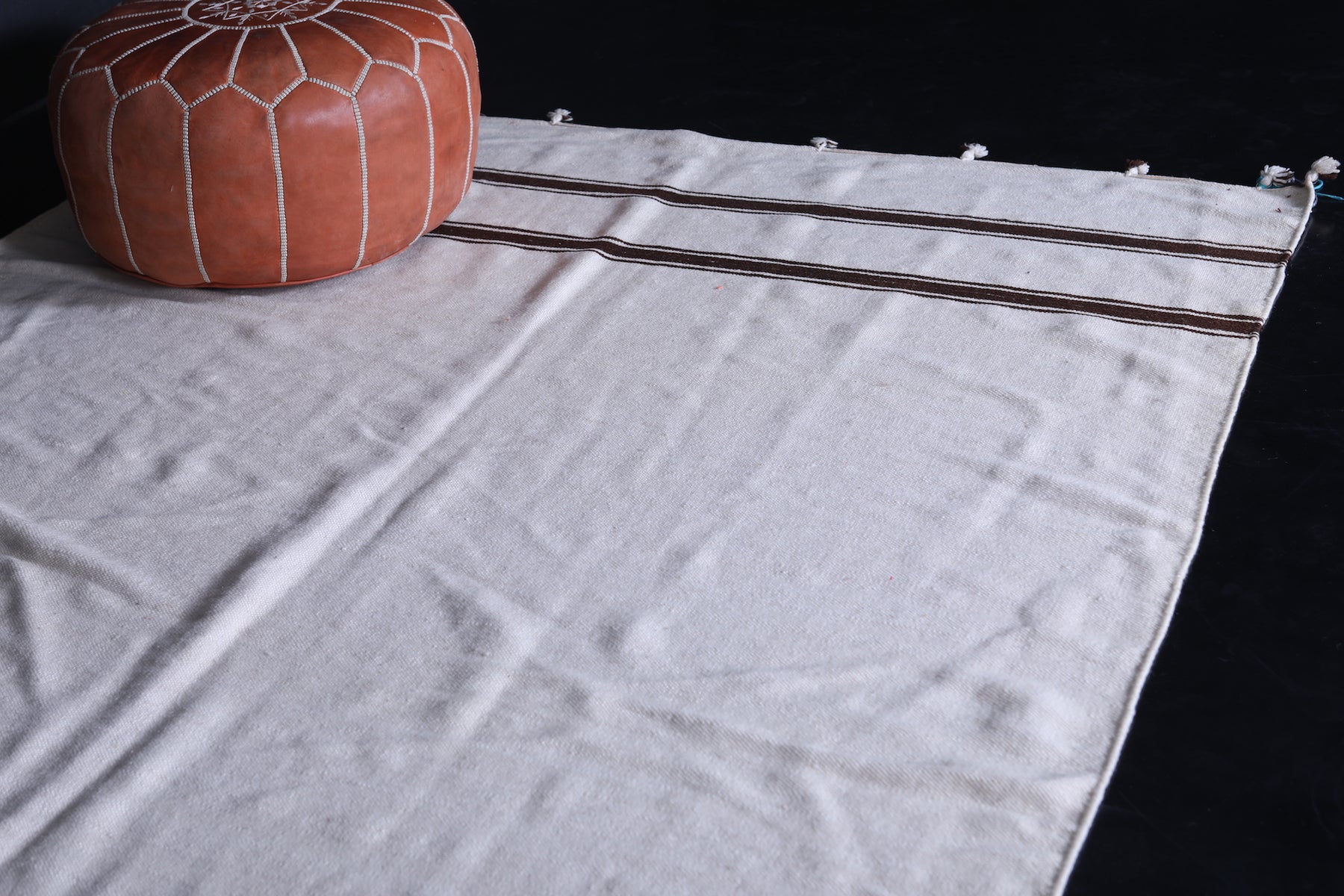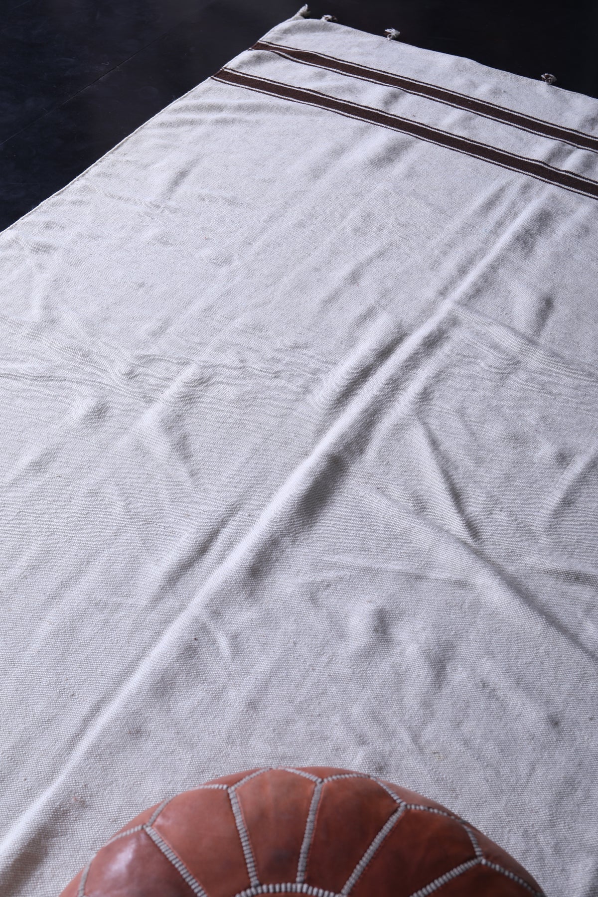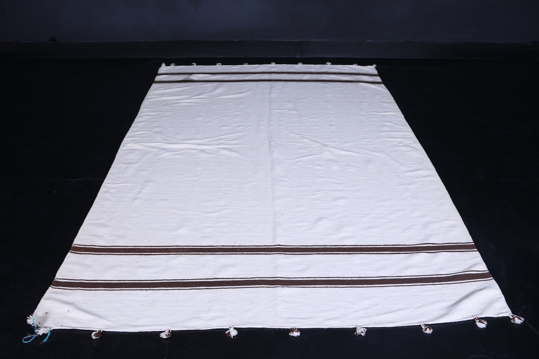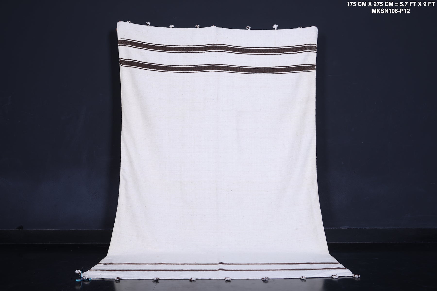 This 5.7 x 9 feet Vintage Moroccan Berber Handwoven Kilim features a creamy white base with subtle dark stripe accents, embodying timeless Moroccan craftsmanship. Handwoven with care, this kilim adds warmth and charm to living rooms, bedrooms, or contemporary interiors.
