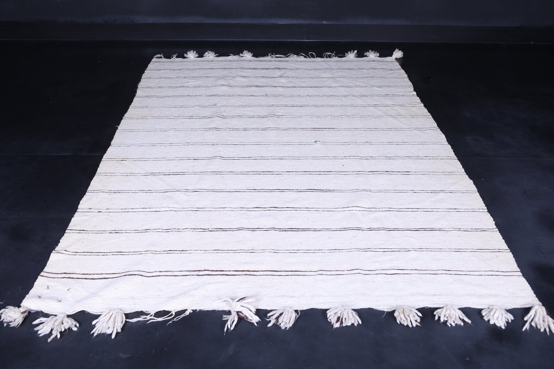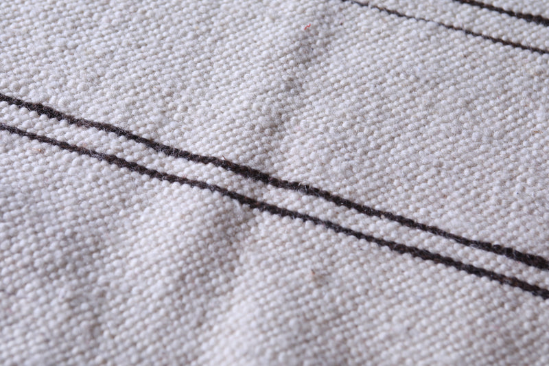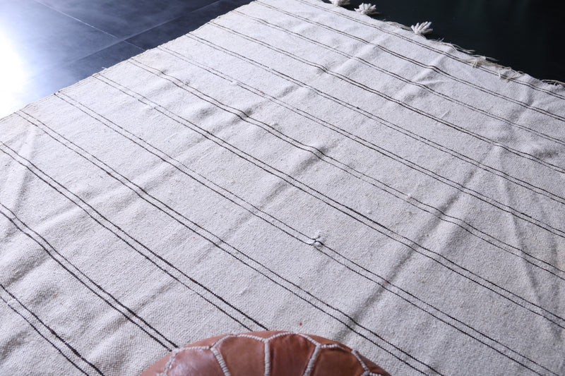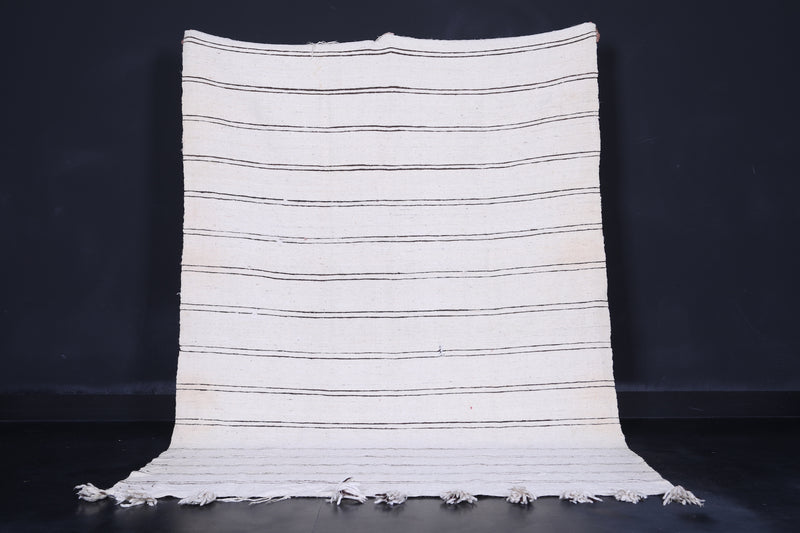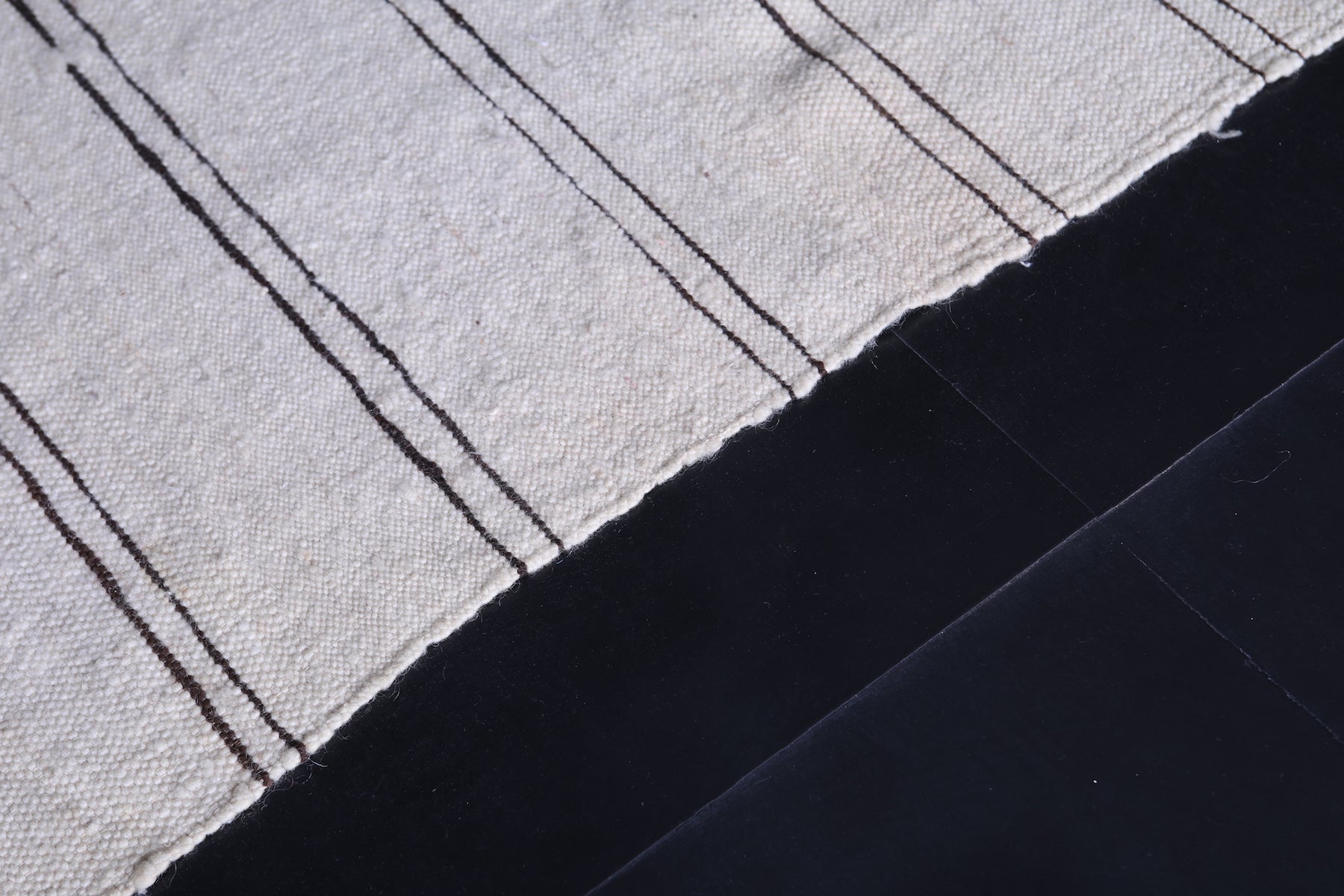 This 5.9 x 8.5 feet Vintage Moroccan Berber Handwoven Kilim Rug features a soft cream base with classic black stripe accents, embodying elegance and minimalism. Handwoven from premium natural wool, this rug is both durable and comfortable, making it perfect for living rooms, bedrooms, or offices.