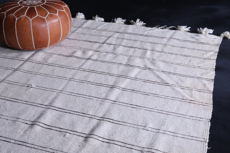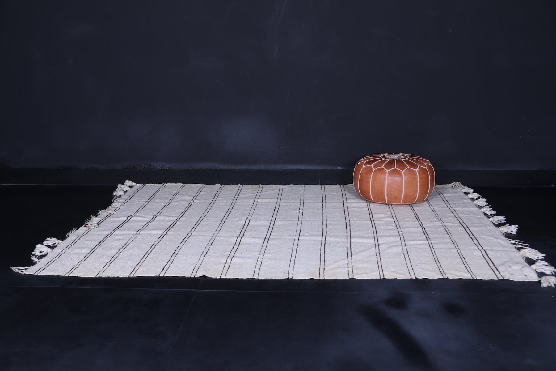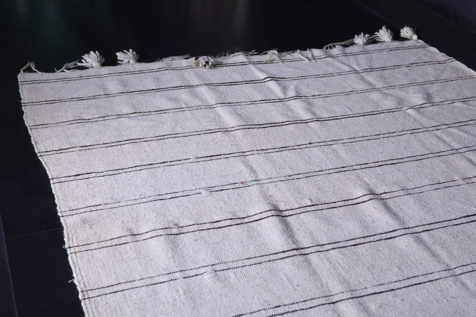 This 5.9 x 8.5 feet Vintage Moroccan Berber Handwoven Kilim Rug features a soft cream base with classic black stripe accents, embodying elegance and minimalism. Handwoven from premium natural wool, this rug is both durable and comfortable, making it perfect for living rooms, bedrooms, or offices.