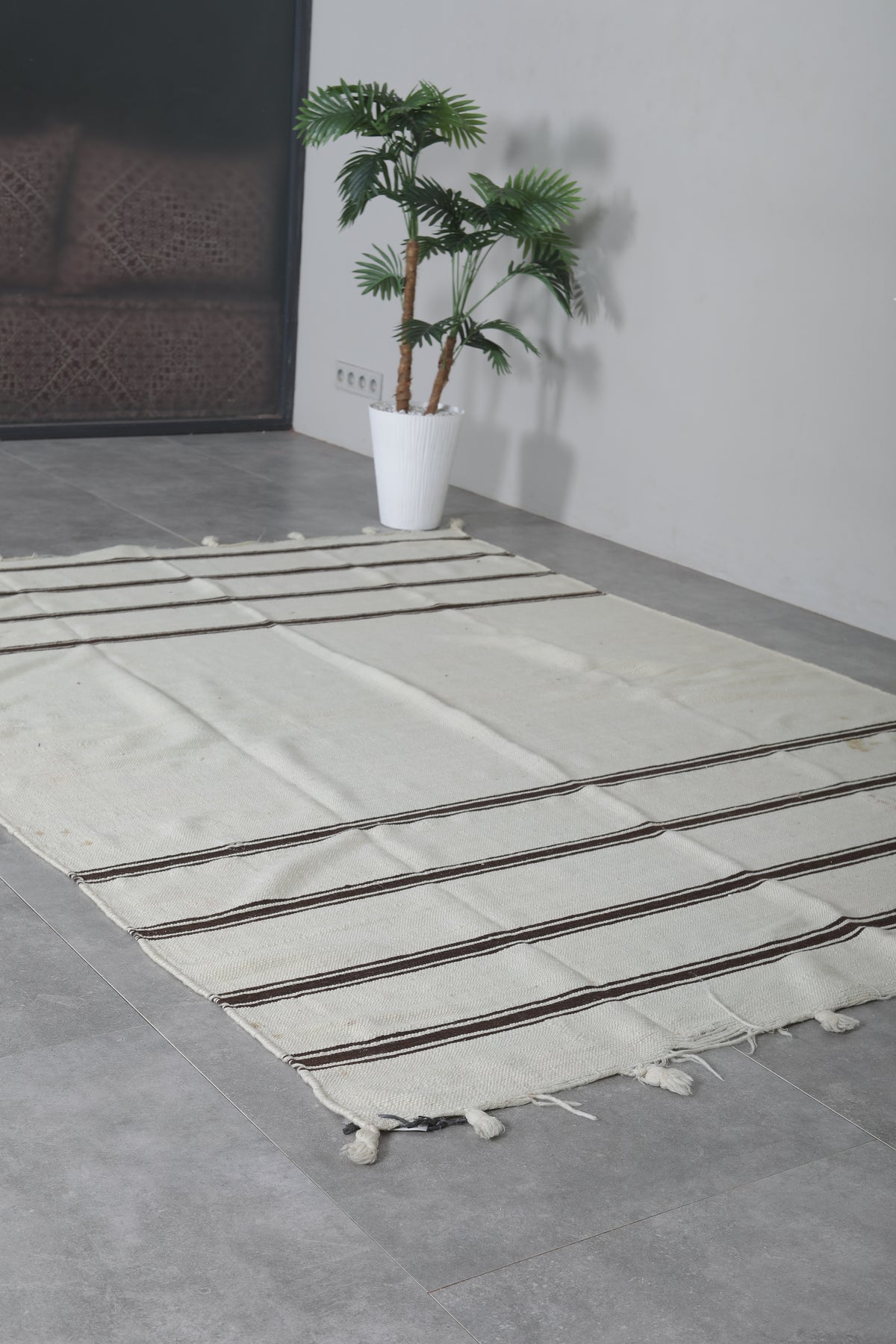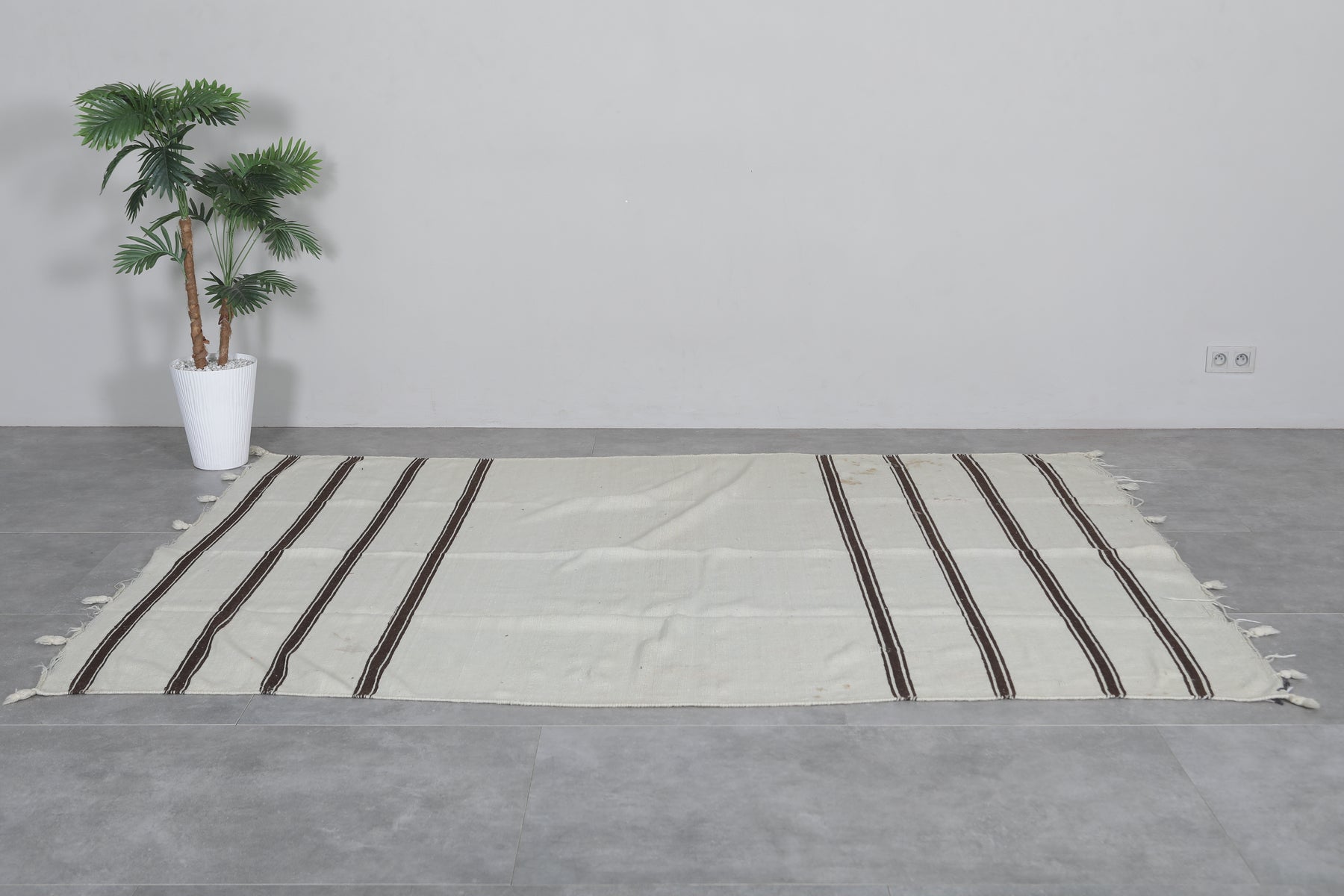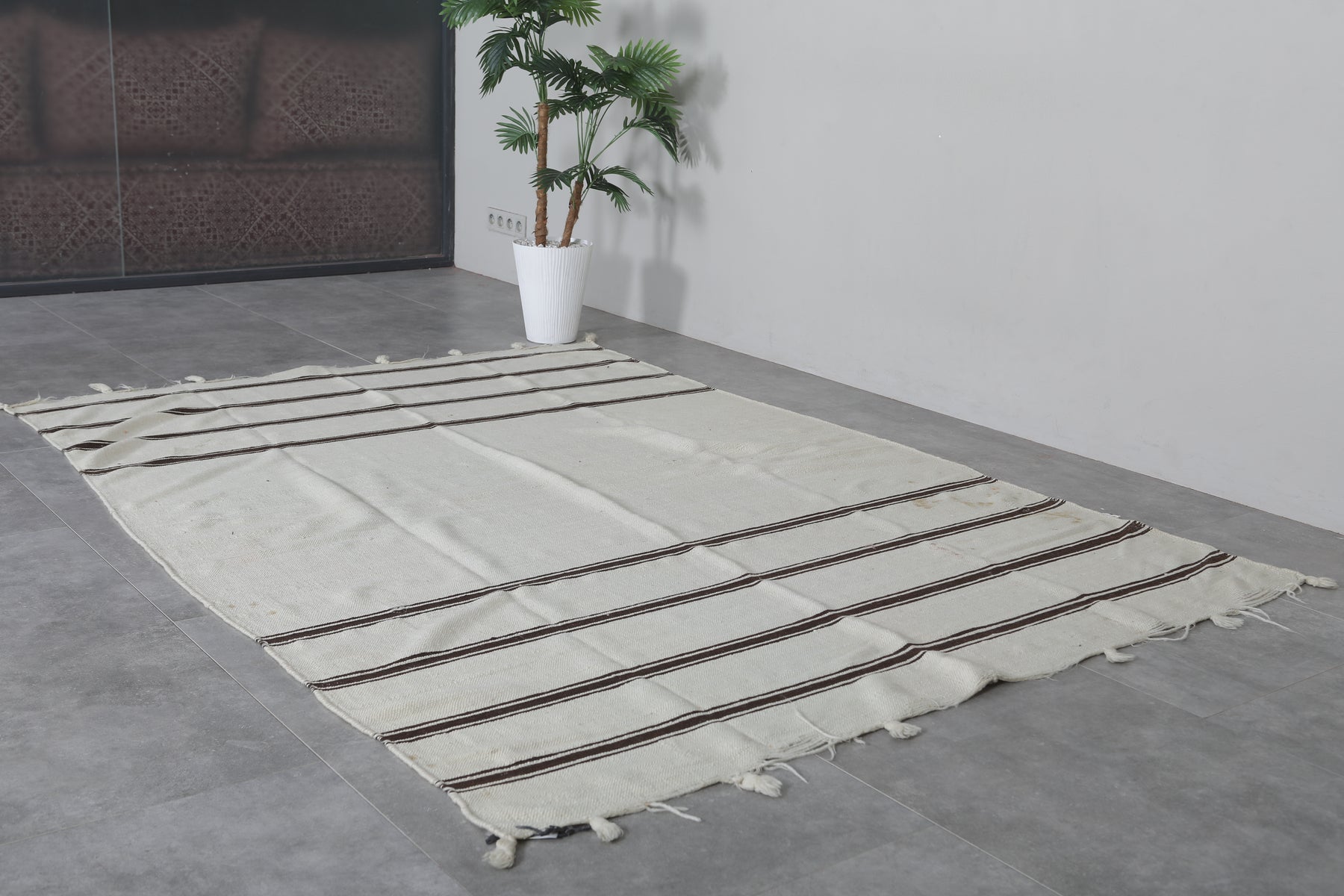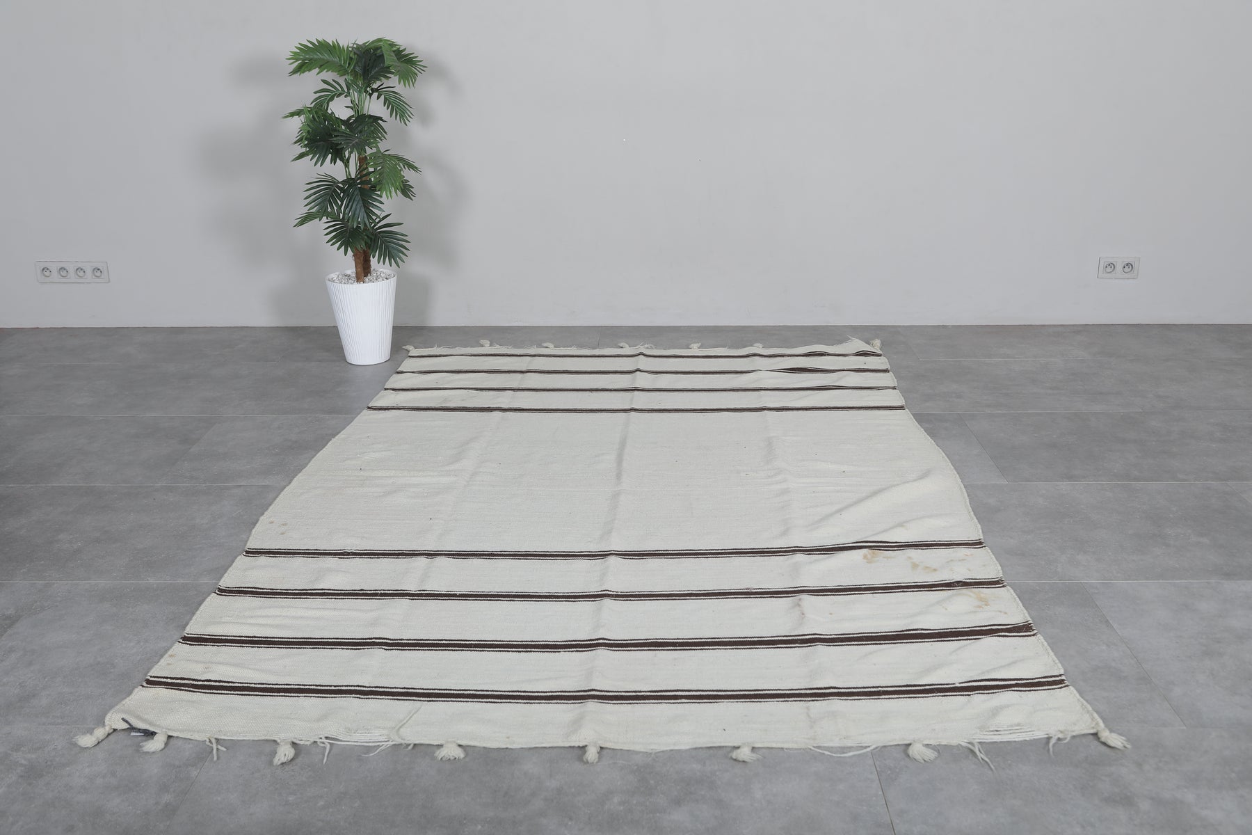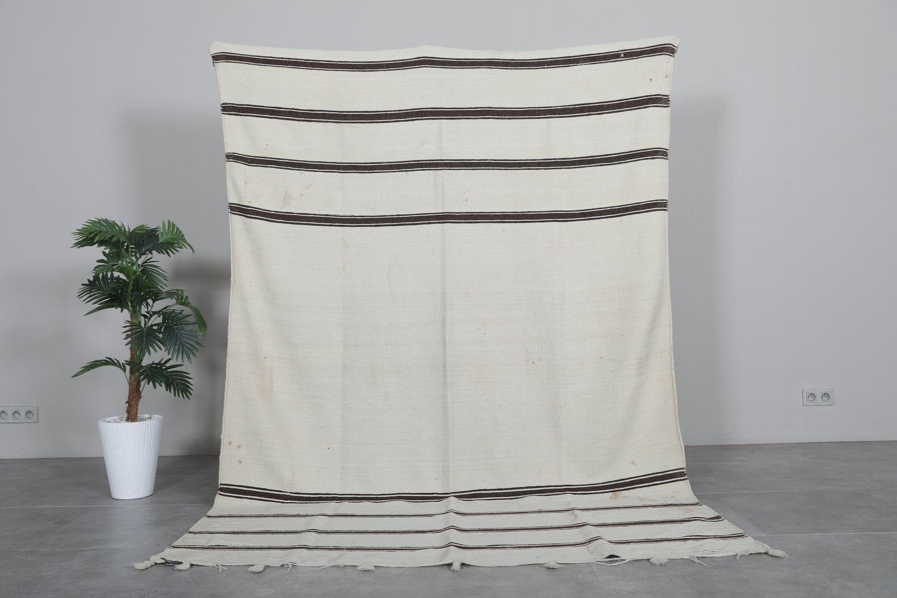 This 6.2 x 8.6 feet Vintage Moroccan Berber Kilim Rug features a minimalist striped pattern in neutral tones, offering a timeless blend of tradition and modernity. Handwoven from premium wool, this unique piece adds warmth and cultural heritage to any space.
