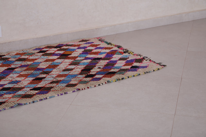 This Vintage Moroccan Berber Rug, sized 3.4 x 5.1 feet, adds a bold statement to any space with its vibrant, handwoven diamond patterns. Expertly crafted using premium wool, the rug showcases an authentic tribal design with a rich mix of colors including reds, blues, purples, and greens. Ideal for living rooms, bedrooms, or as a decorative accent, it combines traditional Moroccan artistry with timeless charm. Durable, soft, and truly one of a kind, this rug is the perfect way to bring warmth and character to your home decor.