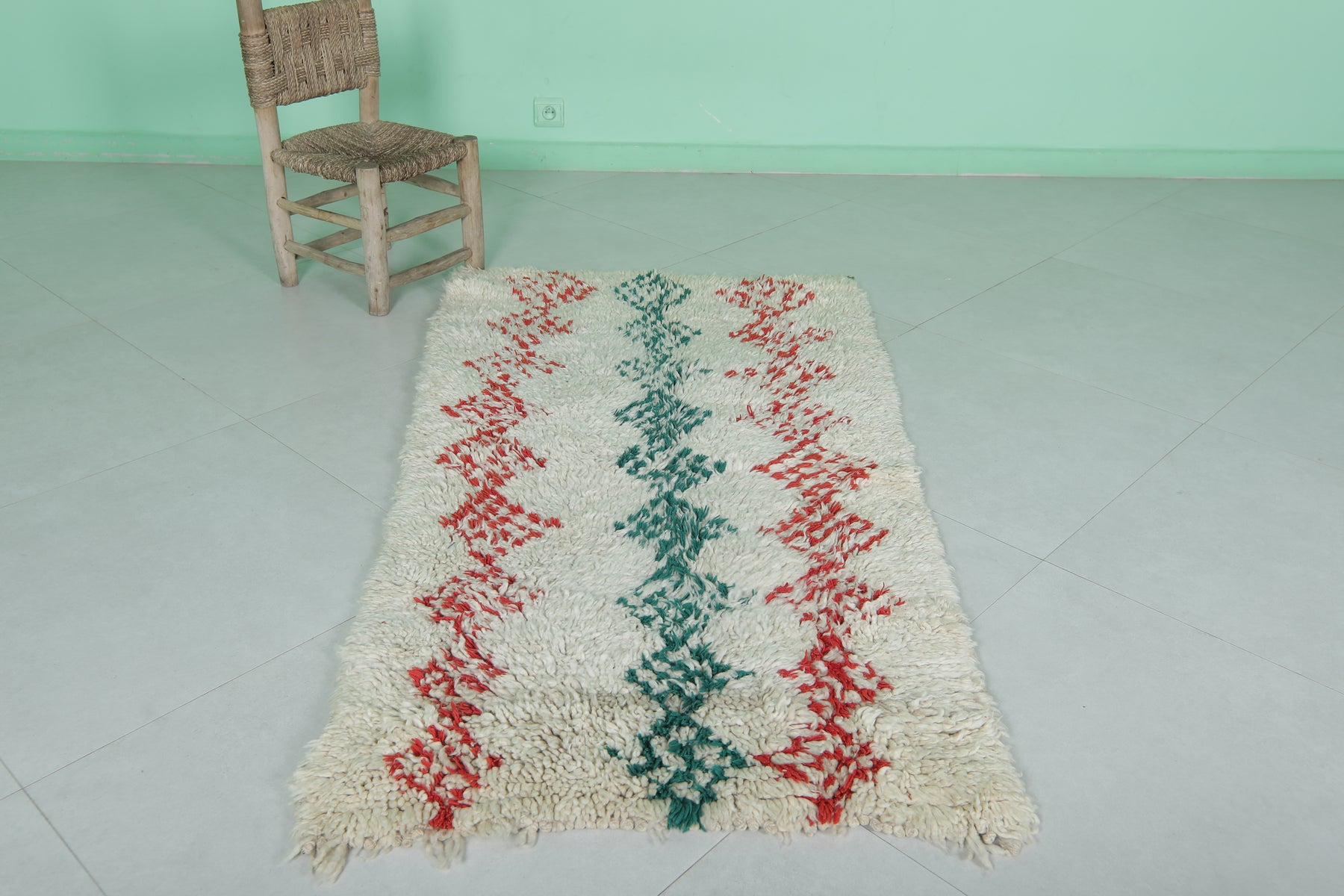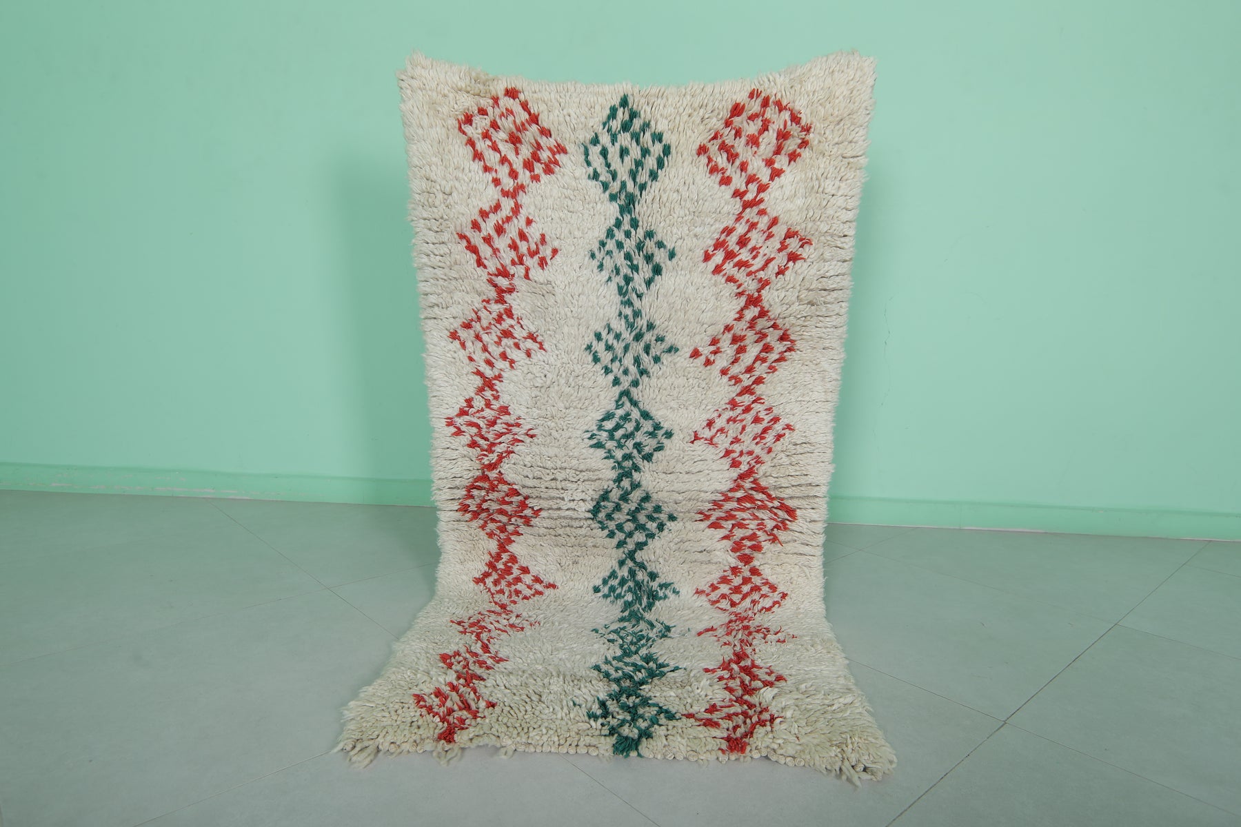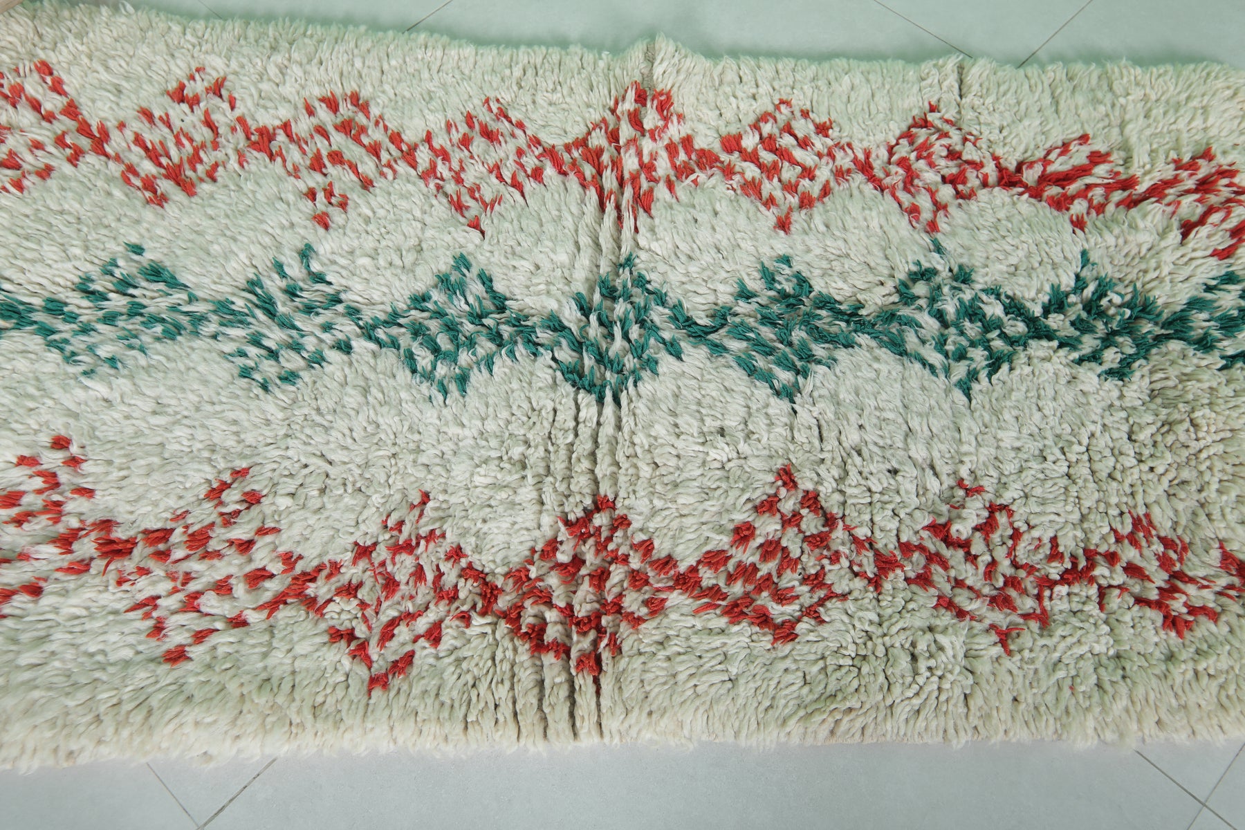 Bring the charm of Moroccan tradition into your home with this Vintage Moroccan Hallway Rug (2.6 x 5.3 FT), featuring a central chain of bold red and teal diamond motifs on a soft ivory base.