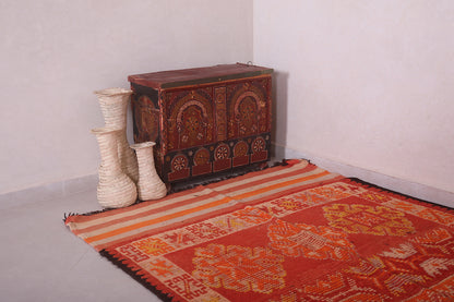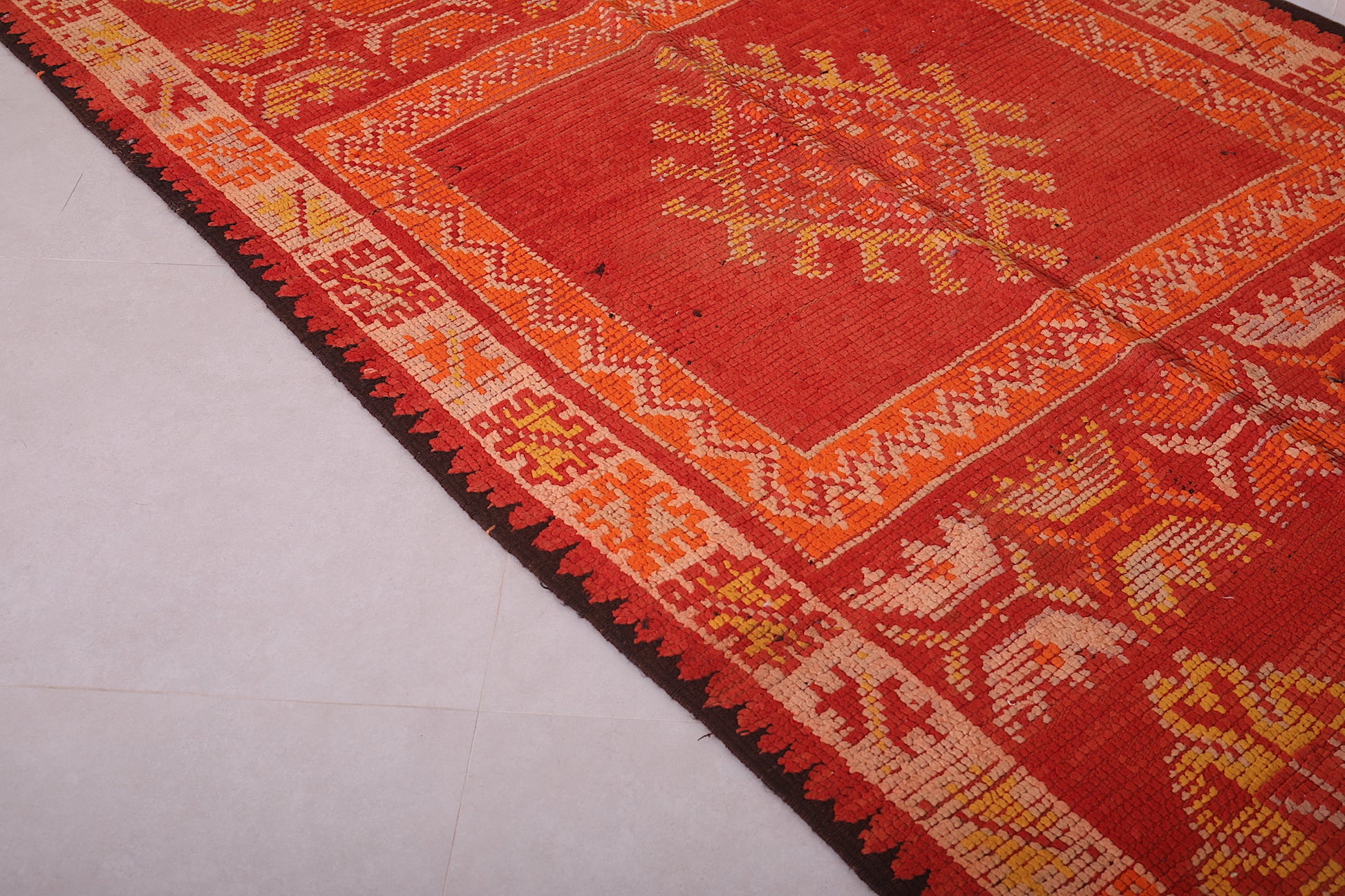 - Traditional Berber motifs woven in earthy red, orange, and gold tones.