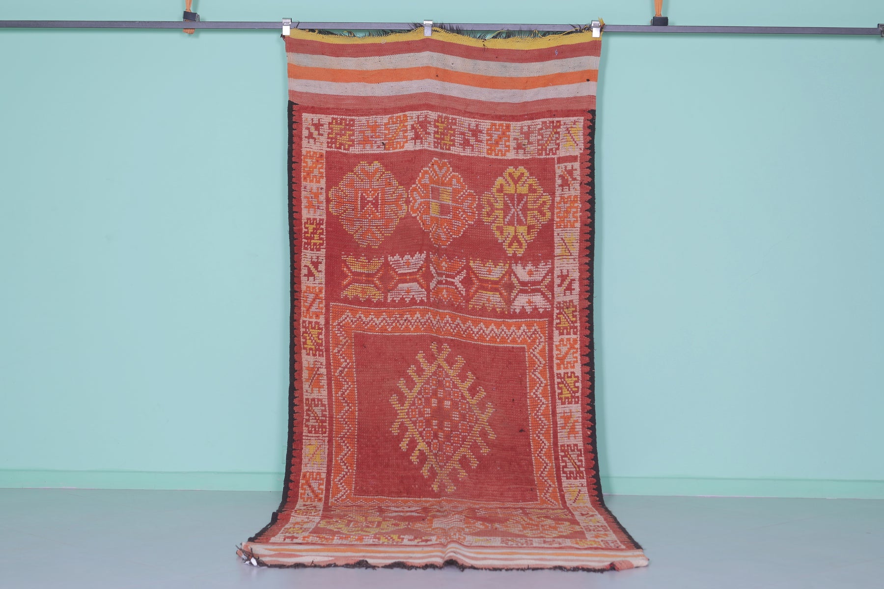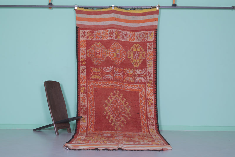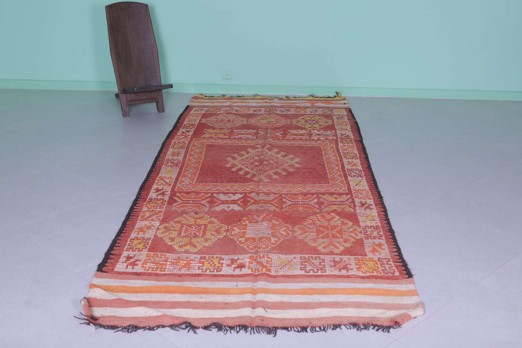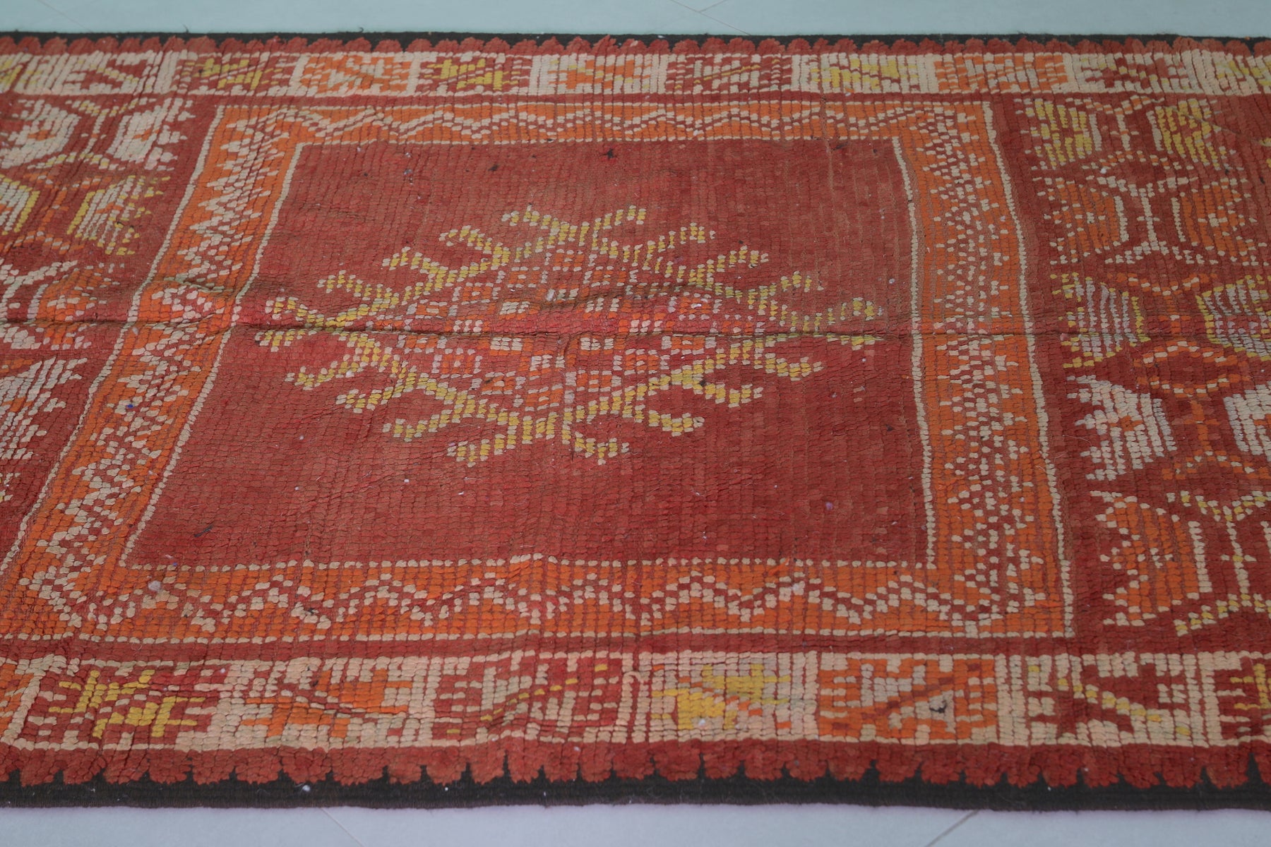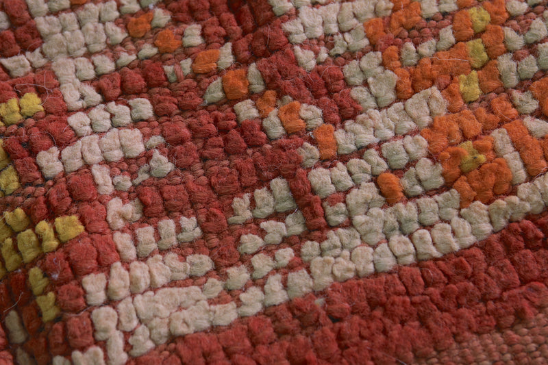 - Traditional Berber motifs woven in earthy red, orange, and gold tones.