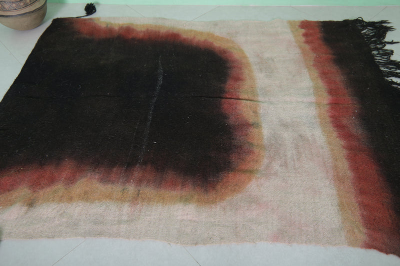 This 3.4 x 4.7 feet Vintage Moroccan Handwoven Berber Fabric features a stunning gradient design transitioning from earthy tones to black, blending artistic craftsmanship with rustic elegance. Handwoven from premium wool, it serves as a decorative throw, wall hanging, or table cover, adding warmth and cultural depth to your space.