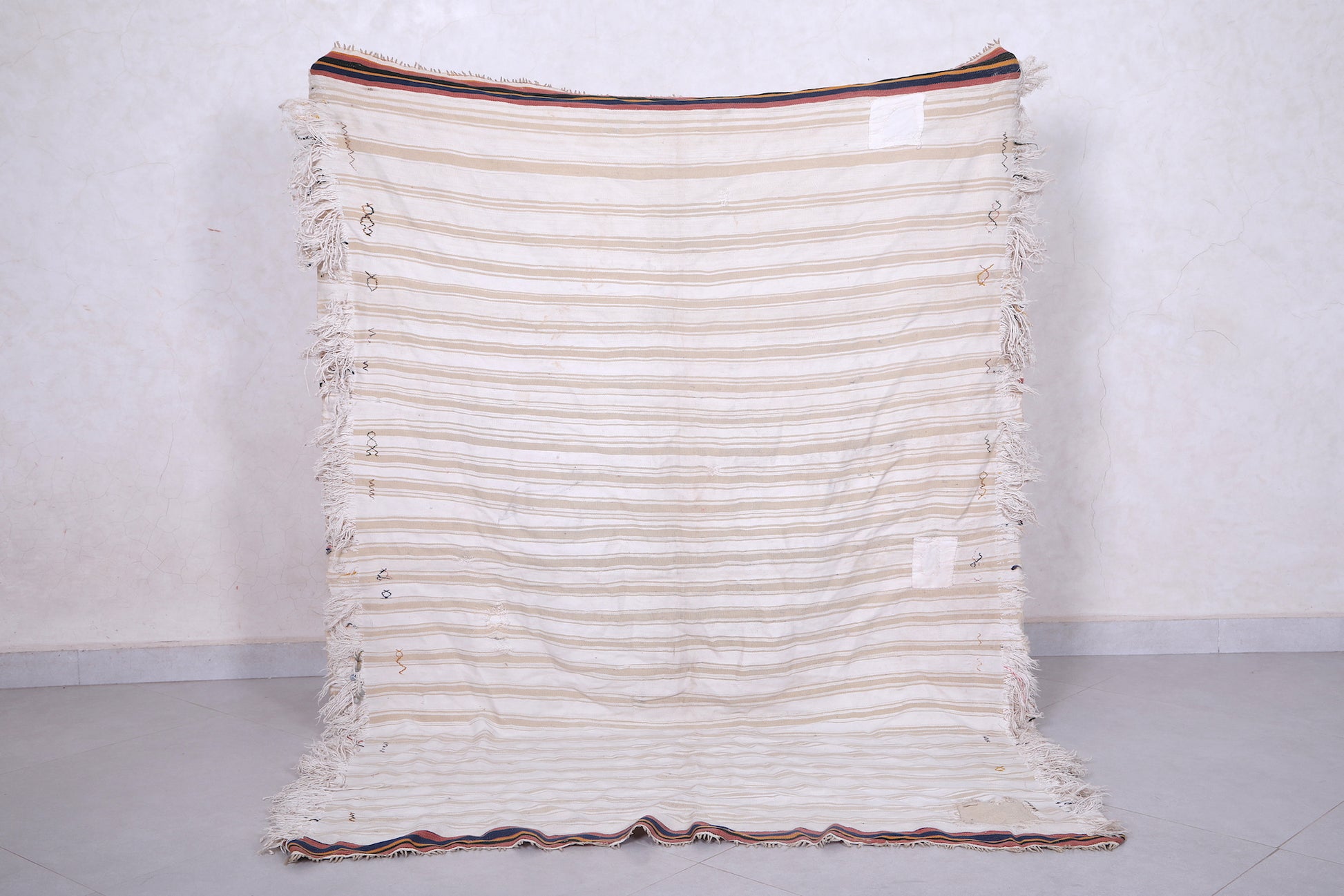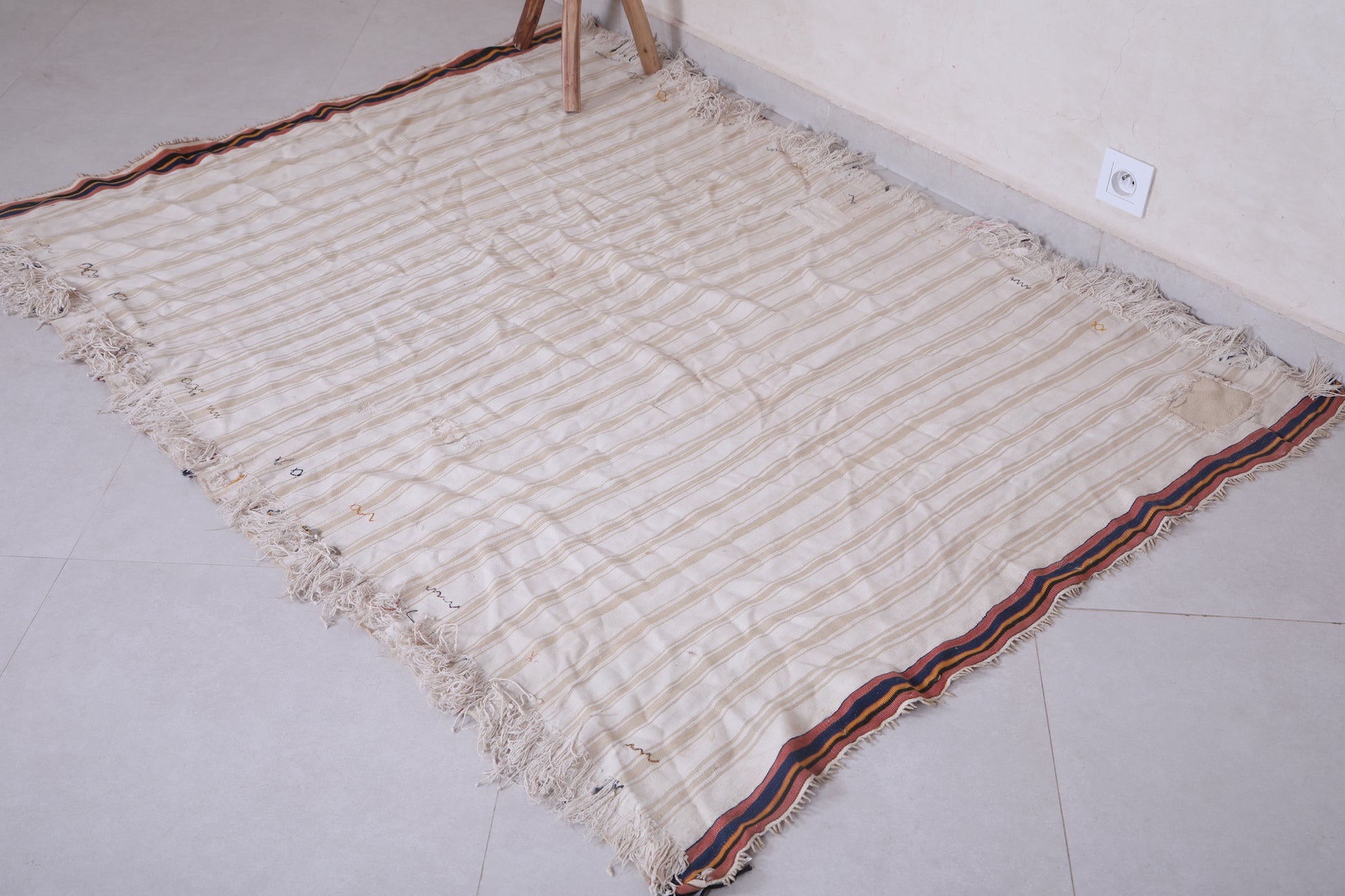 This 4.2 x 5.6 feet Vintage Moroccan Handwoven Kilim showcases authentic craftsmanship with intricate geometric patterns and earthy tones, making it ideal for bohemian, rustic, or eclectic spaces. Durable and versatile, it can be used as a rug, wall hanging, or decorative throw.
