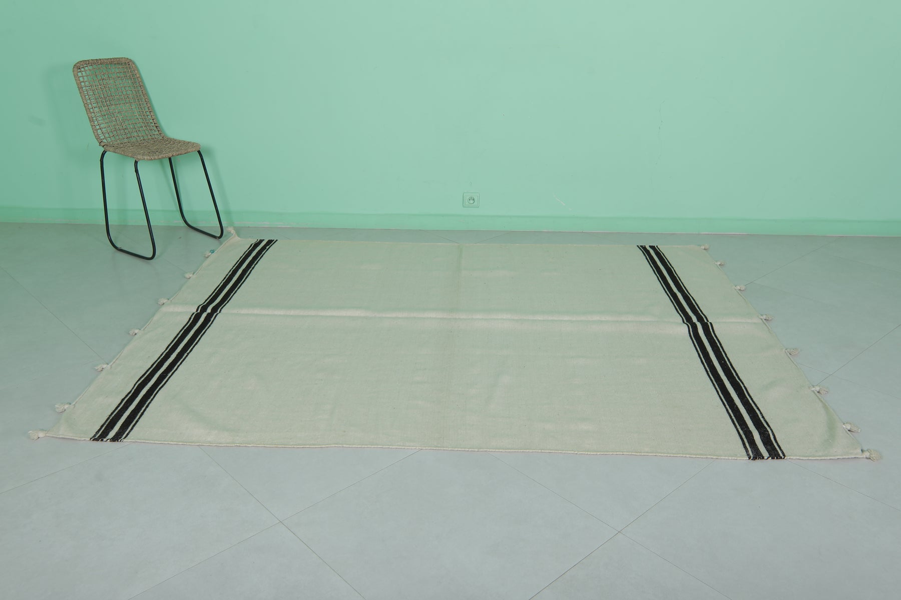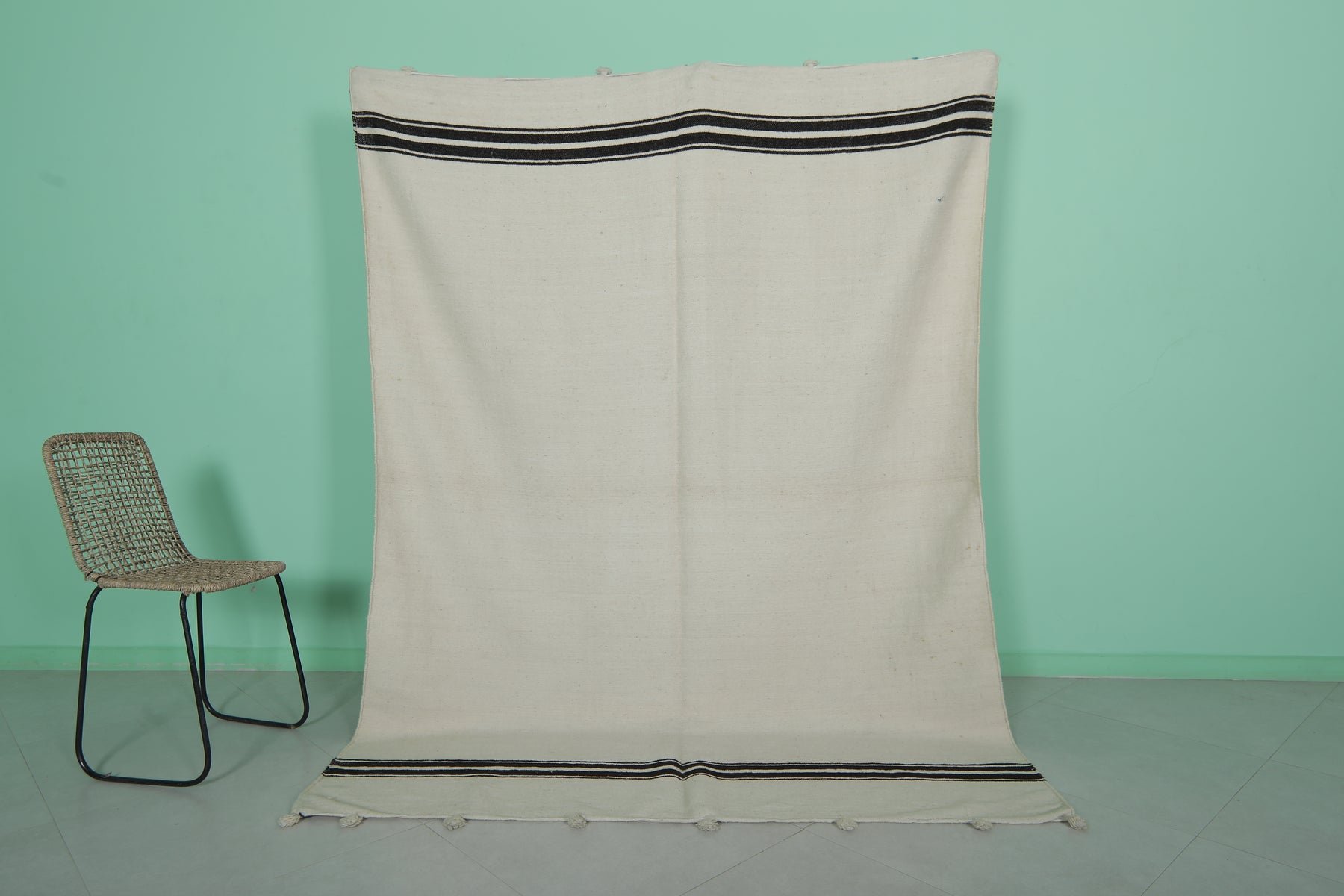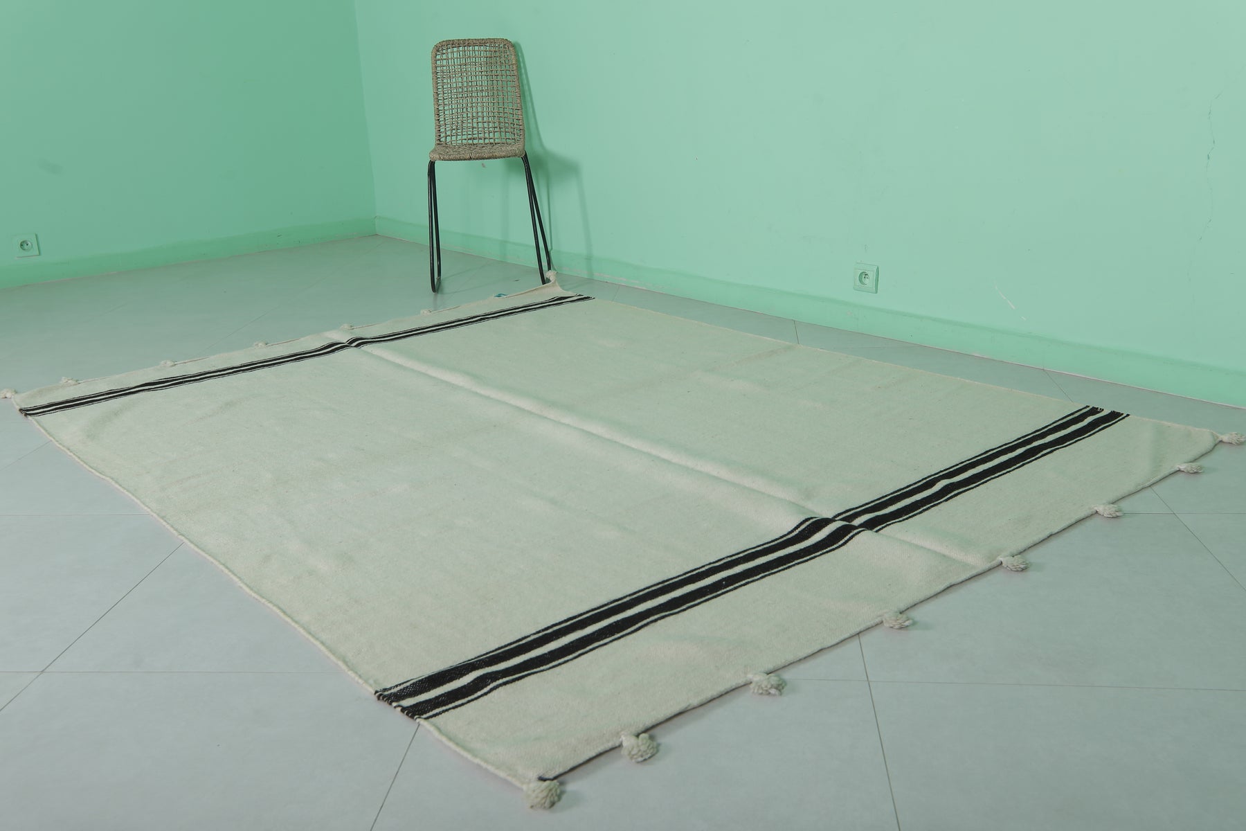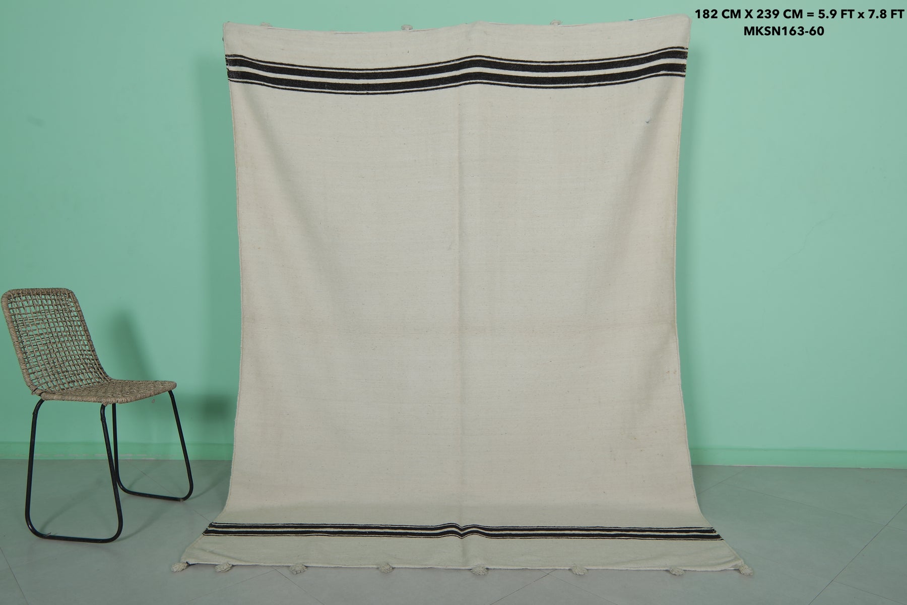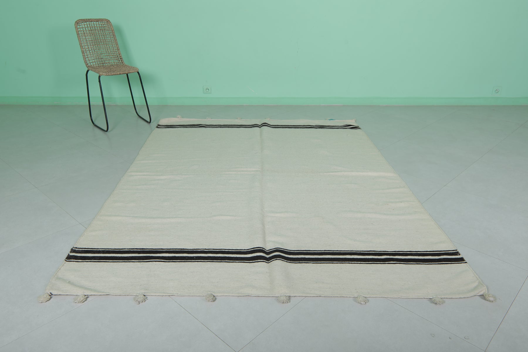 This 5.9 x 7.8 feet Vintage Moroccan Handwoven Kilim features a timeless neutral palette with minimalist black stripes, blending simplicity with artisanal craftsmanship. Handwoven from premium wool, this versatile piece is perfect for modern or traditional interiors.